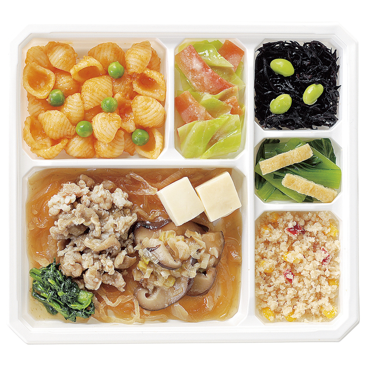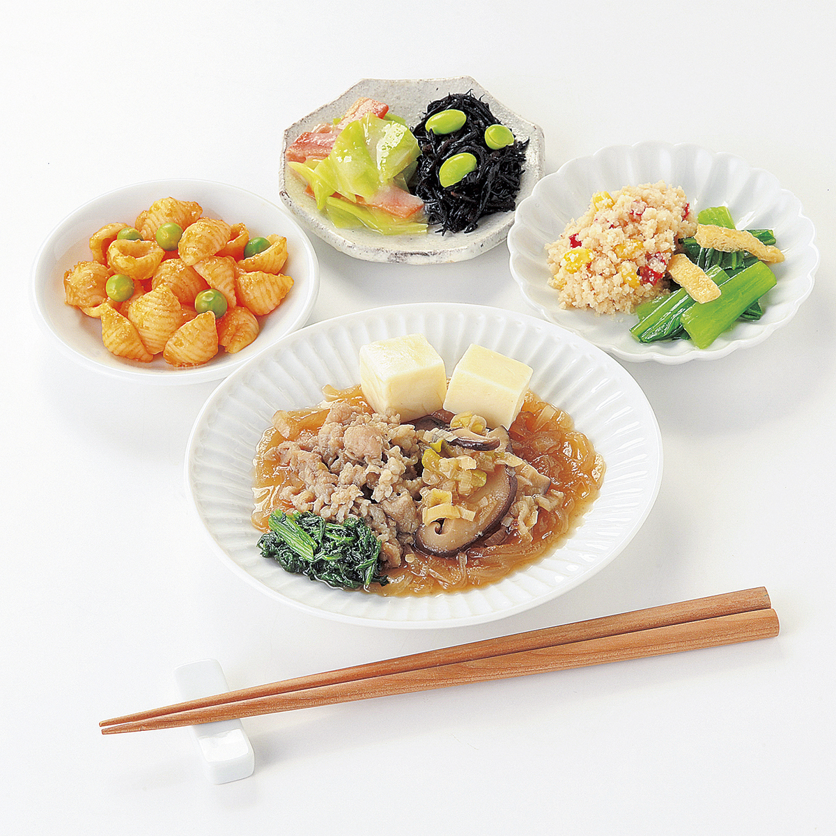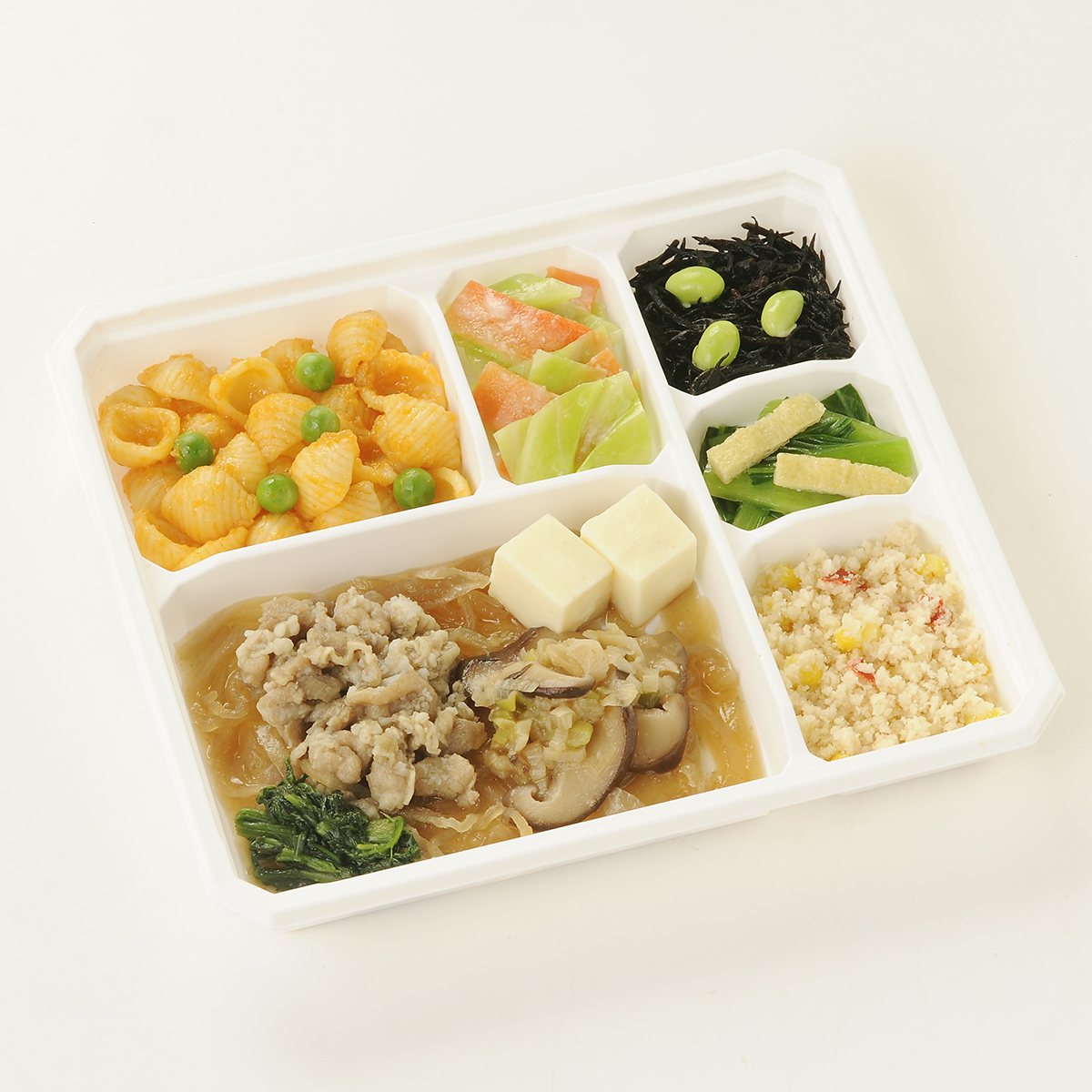 | 原材料名 | 玉ねぎ、牛肉、椎茸、ねぎ、豆腐、白滝、マカロニ、キャベツ、チンゲン菜、トマトソース、春菊、減塩醤油、人参、コーン、なたね油、グリンピース、上白糖、牛乳、枝豆、赤ピーマン、乾燥おから、発酵調味料、本みりん、清酒、油揚げ、乾燥ひじき、大豆油、顆粒和風だし、淡口醤油、ごま油、味噌、ホワイトソース、食塩、果実調味料、ねり白ごま、白ワイン、煎り白ごま、にんにく、濃口醤油、顆粒洋風だし、黒こしょう、糊料(加工デンプン)、調味料(アミノ酸等)、凝固剤、pH調整剤、水酸化Ca、酸味料、香辛料(その他小麦、鶏肉、豚肉、りんご由来原材料を含む) | ||