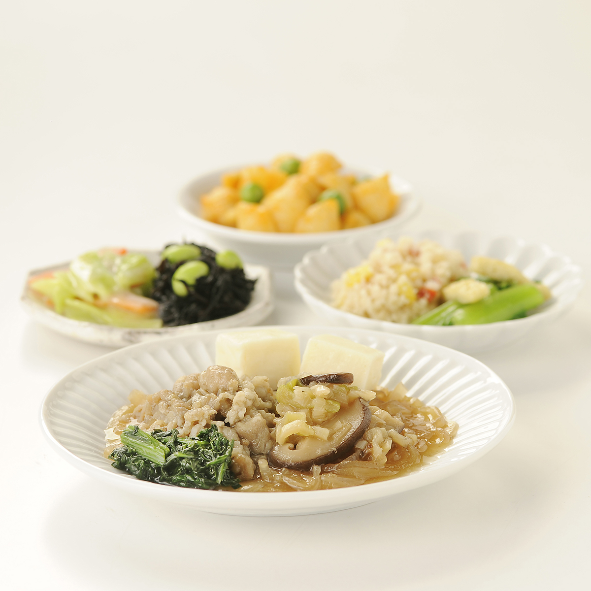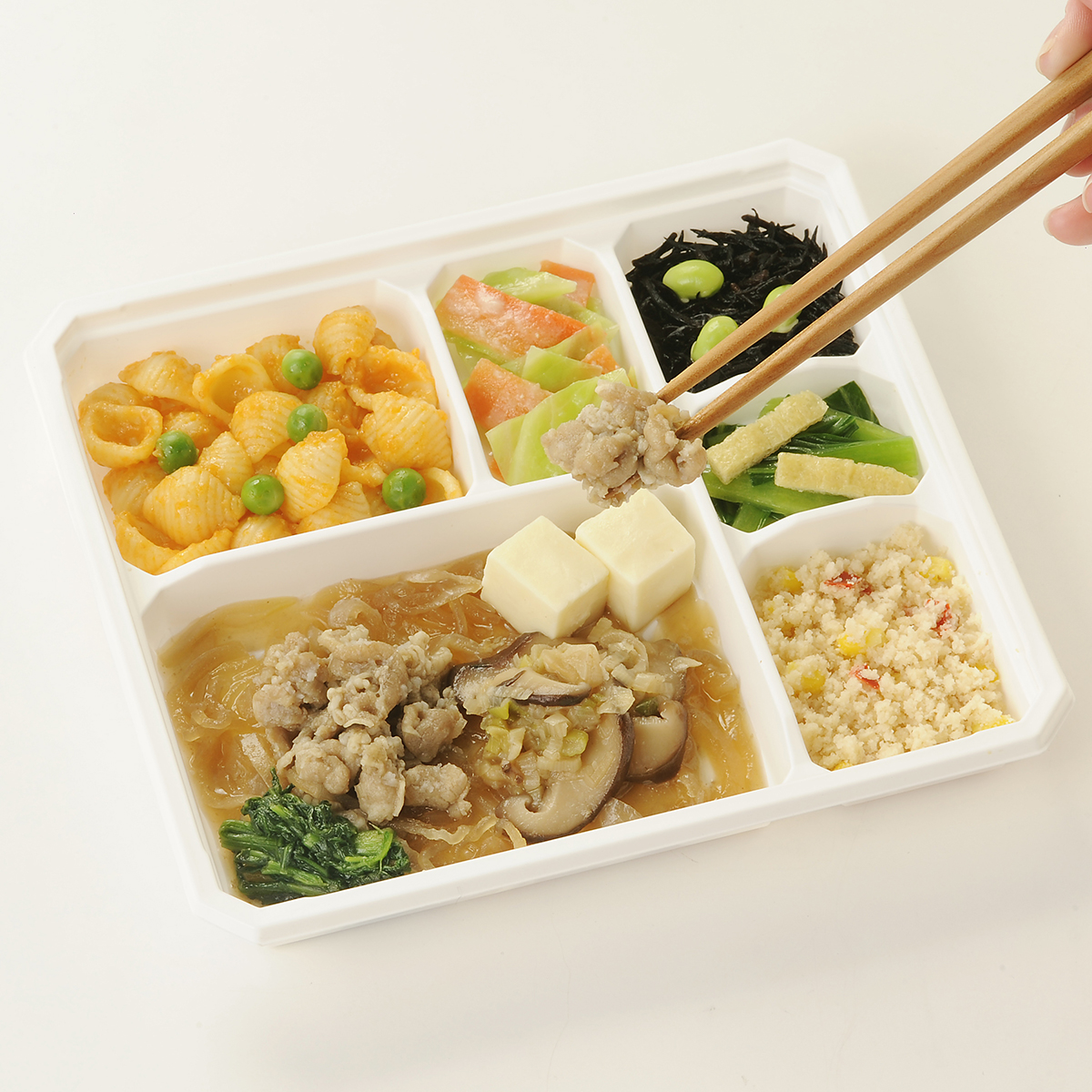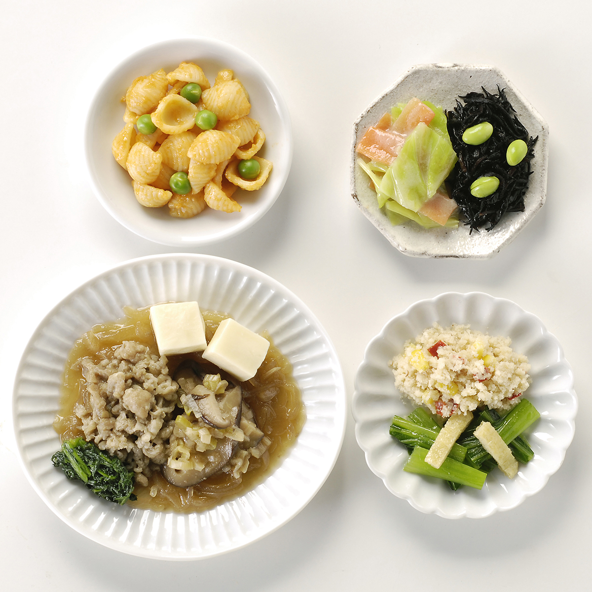 | 原材料名 | 玉ねぎ、牛肉、椎茸、ねぎ、豆腐、白滝、マカロニ、キャベツ、チンゲン菜、トマトソース、春菊、減塩醤油、人参、コーン、なたね油、グリンピース、上白糖、牛乳、枝豆、赤ピーマン、乾燥おから、発酵調味料、本みりん、清酒、油揚げ、乾燥ひじき、大豆油、顆粒和風だし、淡口醤油、ごま油、味噌、ホワイトソース、食塩、果実調味料、ねり白ごま、白ワイン、煎り白ごま、にんにく、濃口醤油、顆粒洋風だし、黒こしょう、糊料(加工デンプン)、調味料(アミノ酸等)、凝固剤、pH調整剤、水酸化Ca、酸味料、香辛料(その他小麦、鶏肉、豚肉、りんご由来原材料を含む) | ||