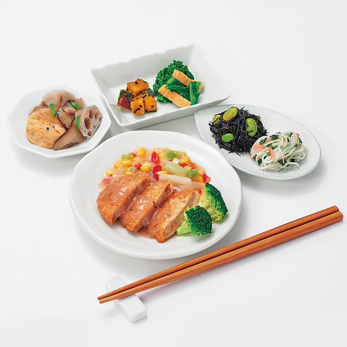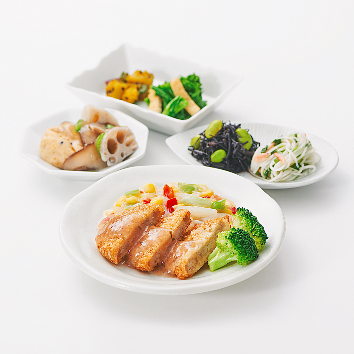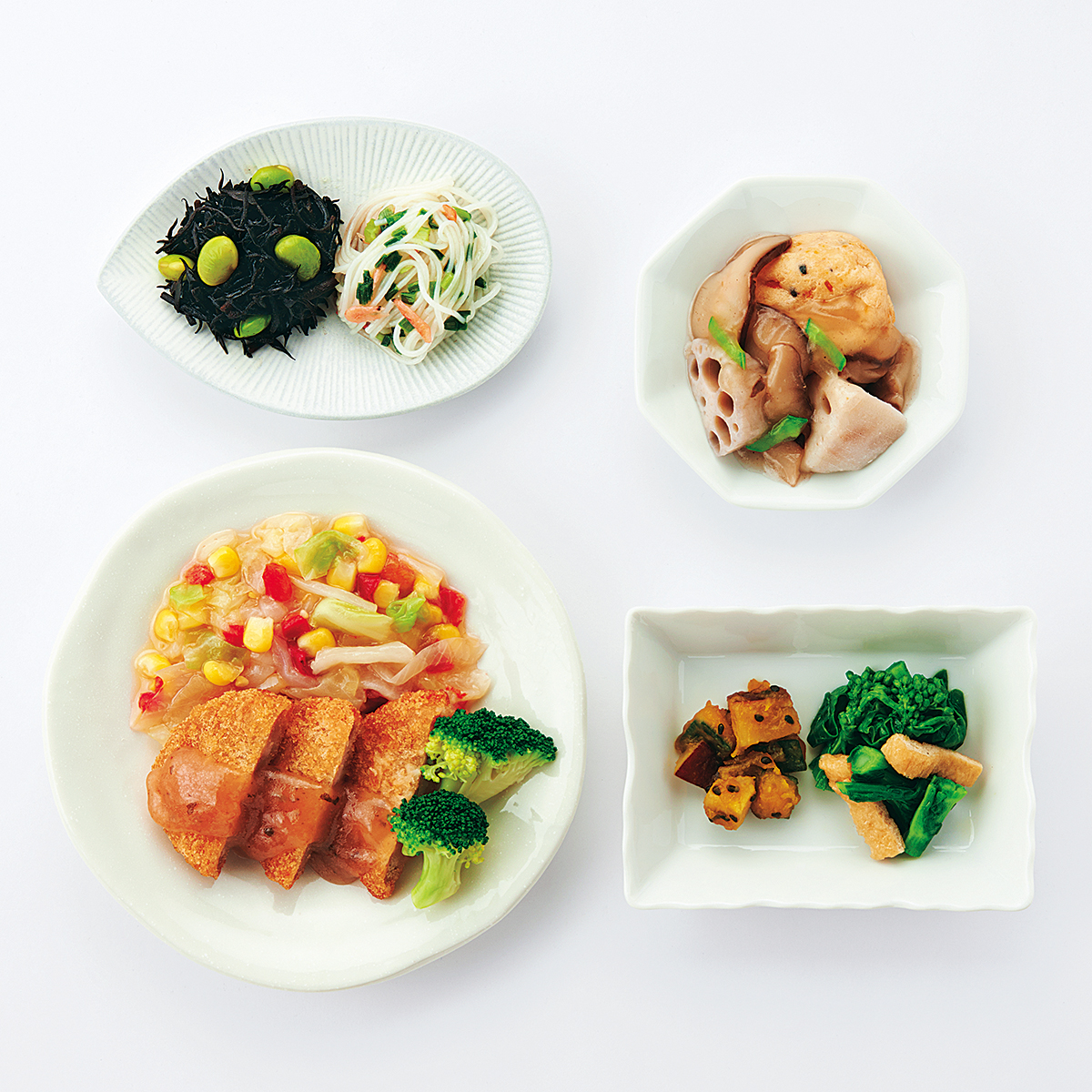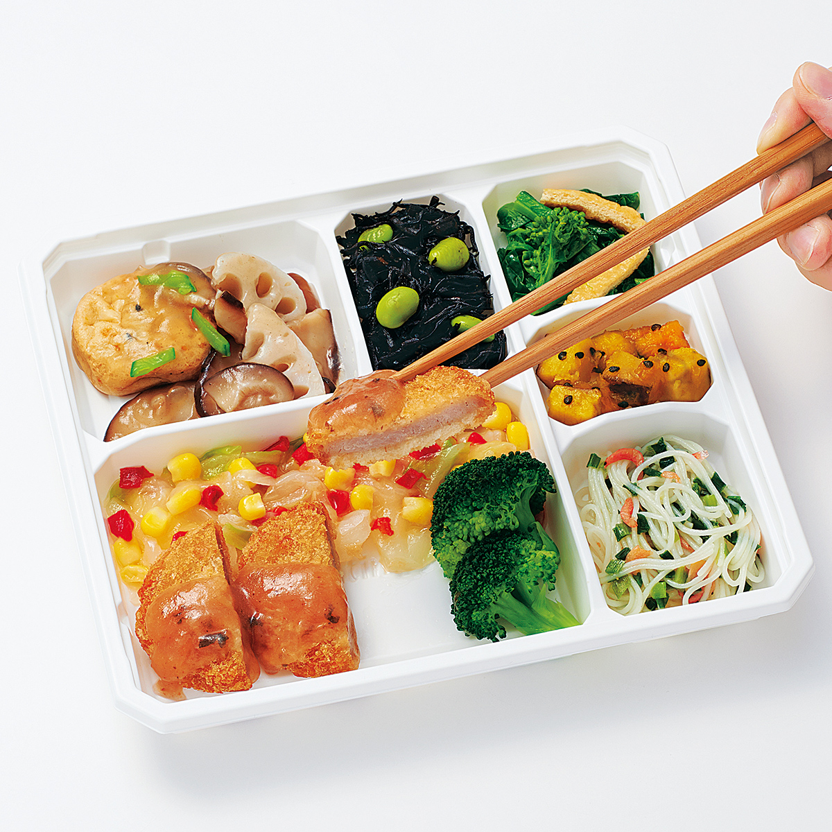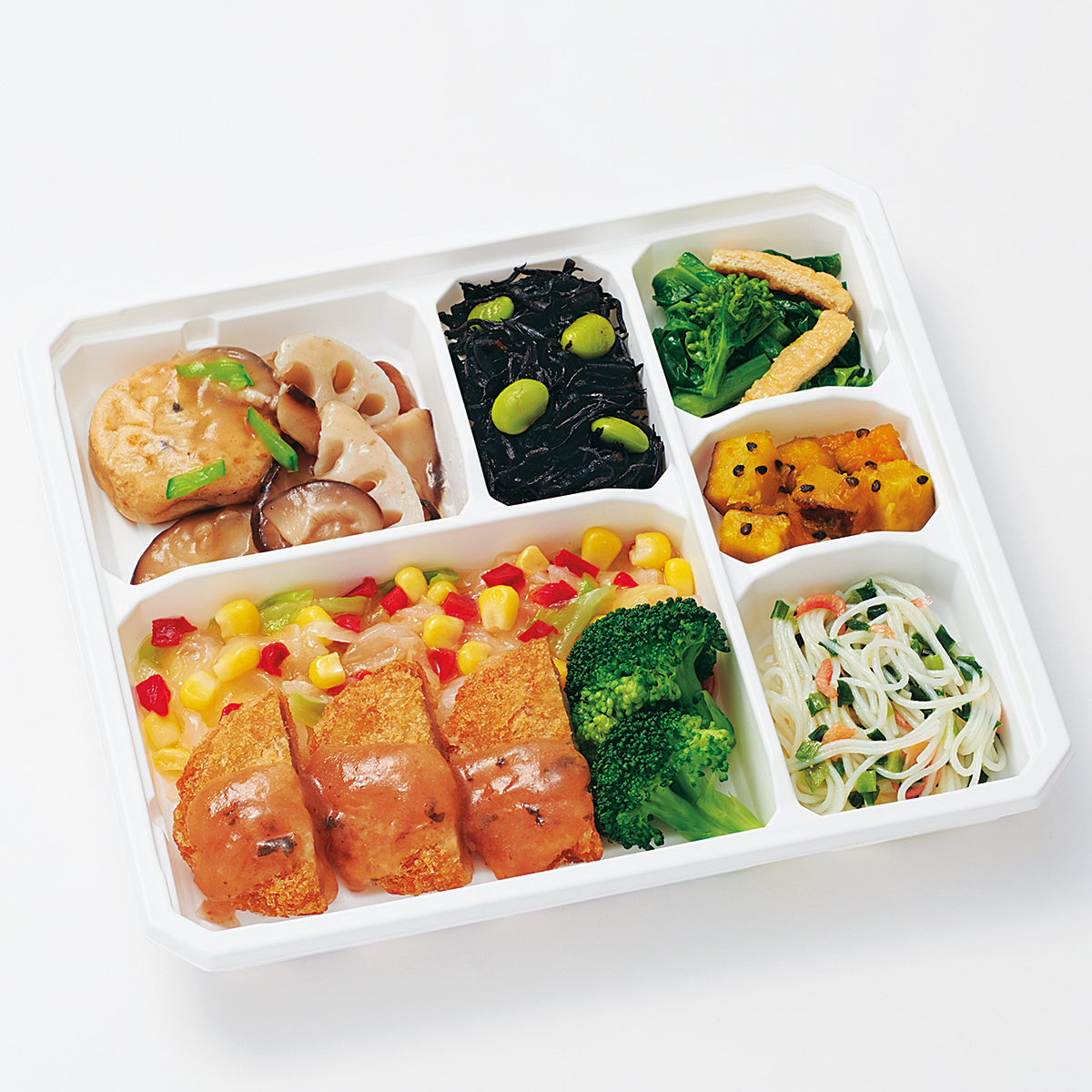 | 原材料名 | トンカツ(成型肉使用)(国内製造)、キャベツ、玉ねぎ、ブロッコリー、れんこん、なたね油、菜の花、がんもどき、しいたけ、コーン、赤ピーマン、さつまいも、枝豆、かぼちゃ、ビーフン、砂糖、にら、しそ入調味梅肉、油揚げ、キヌサヤ、乾燥ひじき、清酒、顆粒和風だし、濃口醤油、本みりん、食塩、淡口醤油、乾燥小えび、発酵調味料、煎り黒ごま/糊料(加工でん粉、増粘多糖類、CMC)、加工でん粉、調味料(アミノ酸等)、pH調整剤、乳化剤、リン酸塩(Na)、カゼインNa、酸味料、着色料(紅麹、野菜色素)、マンニット、酒精、V.B1、甘味料(ステビア)、(一部に小麦・卵・乳成分・えび・ごま・大豆・豚肉を含む) | ||