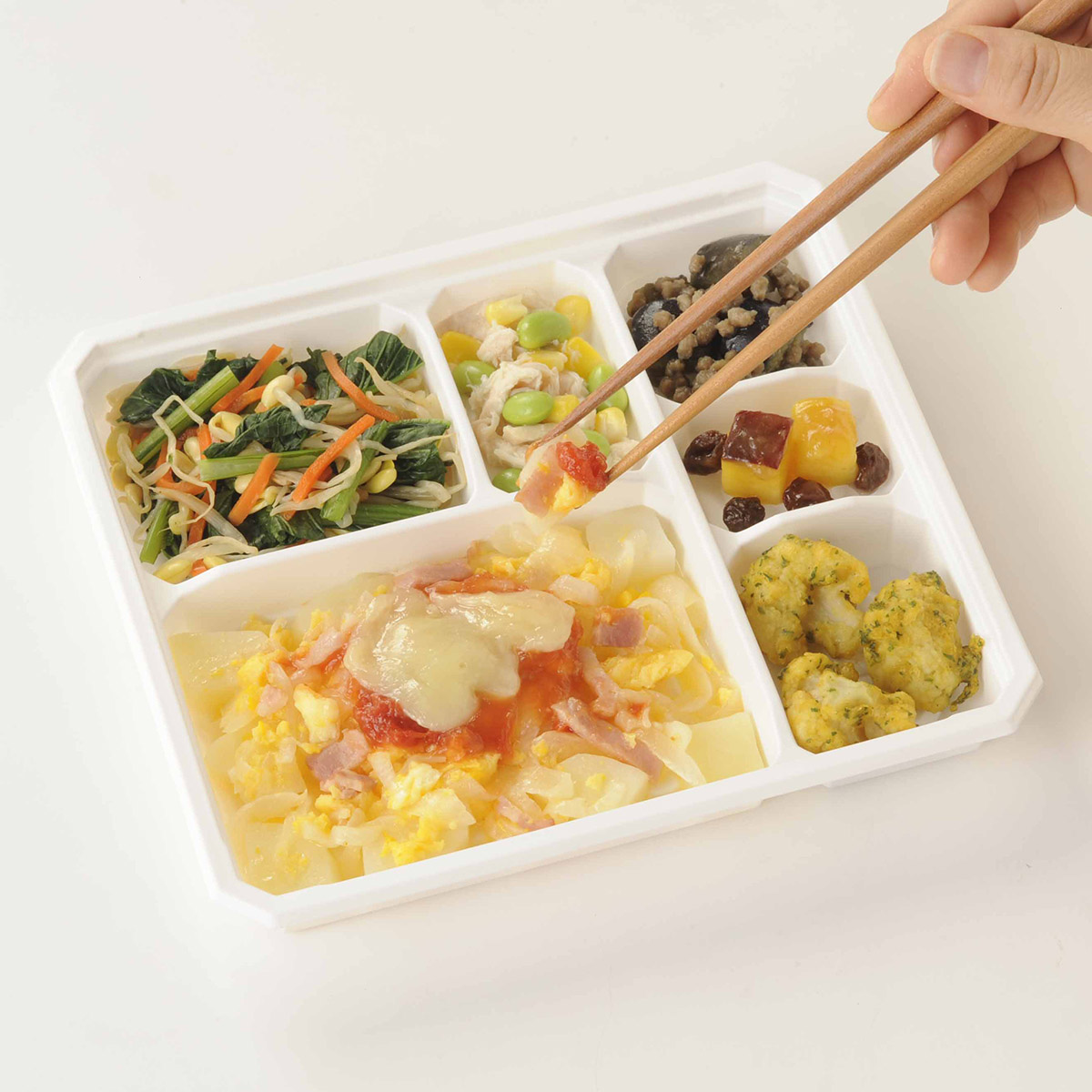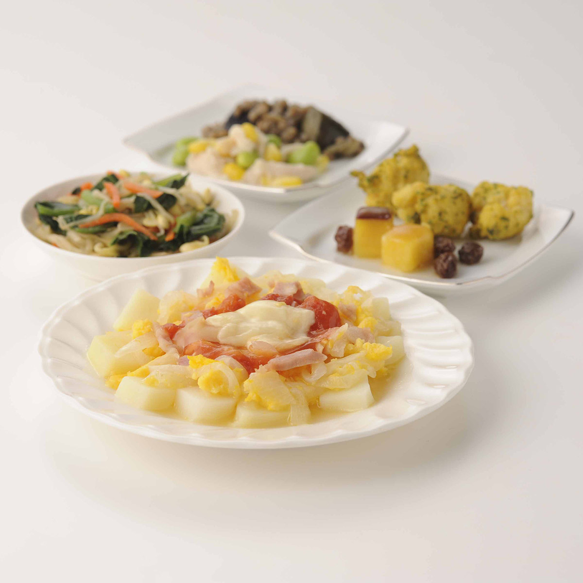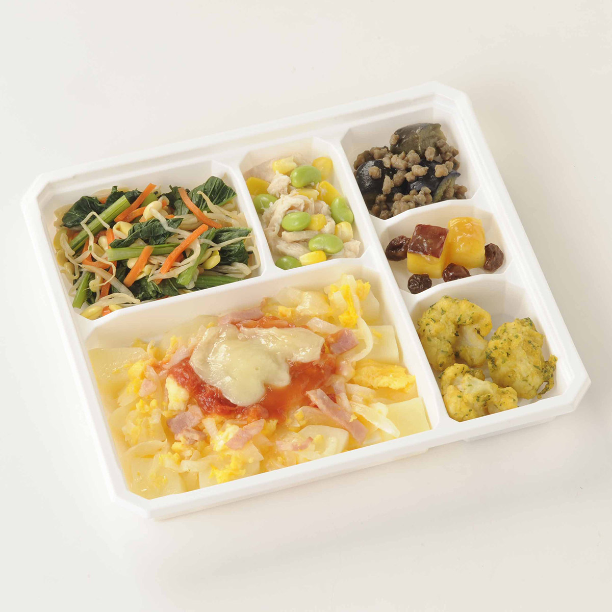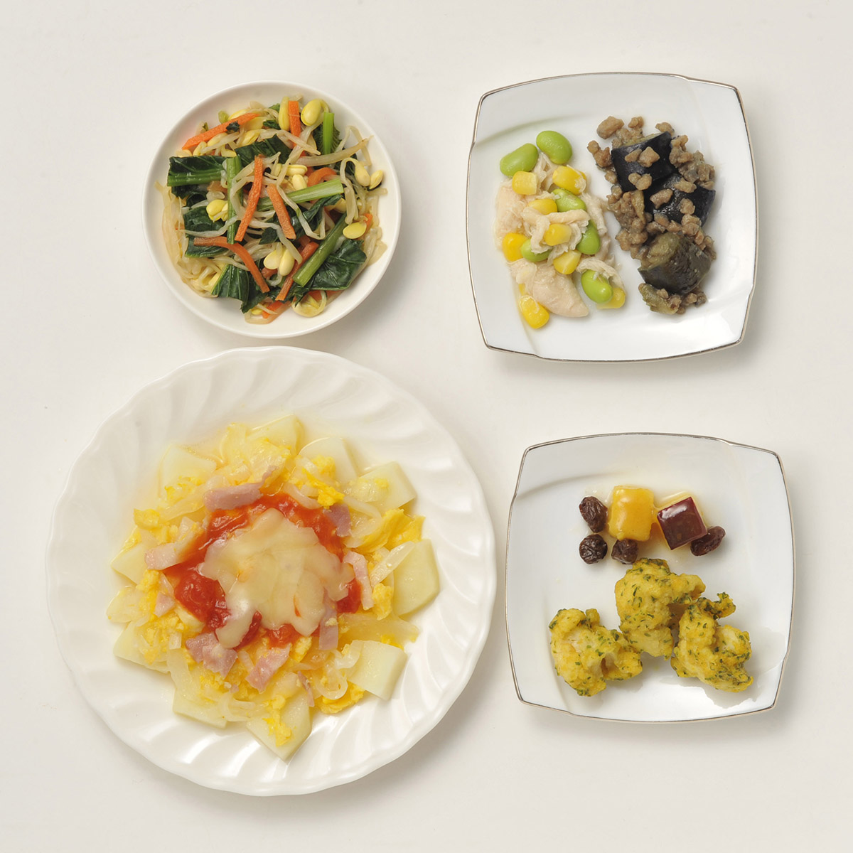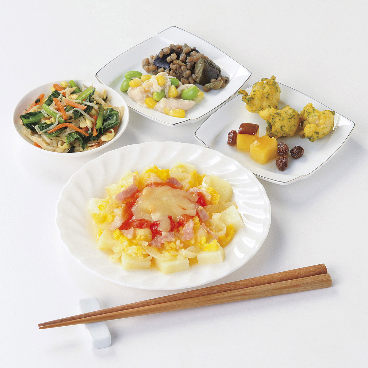 | 原材料名 | 玉ねぎ、じゃがいも、カリフラワー、大豆もやし、小松菜、なたね油、素揚げなす、炒り卵、スクランブルエッグ、人参、蒸し鶏ほぐし身、さつまいも、枝豆、天ぷら粉、コーン、ナチュラルチーズ、上白糖、トマト・ピューレー漬、ベーコン、ケチャップ、レーズン、濃口醤油、清酒、味噌、粒状大豆たん白、発酵調味料、カレー粉、顆粒洋風だし、食塩、三温糖、顆粒和風だし、レモンジュース、パセリ粉、おろししょうが、おろしにんにく、白こしょう、シナモンパウダー、黒こしょう/加工デンプン、増粘剤(加工デンプン、増粘多糖類)、調味料(アミノ酸等)、酢酸Na、グリシン、着色料(ウコン、カロチノイド、カラメル、紅麹、コチニール)、リン酸塩(Na)、膨脹剤、セルロース、酸化防止剤(V.C)、酸味料、発色剤(亜硝酸Na)、香料、(一部に小麦・卵・乳成分・牛肉・大豆・鶏肉・豚肉を含む) | ||
