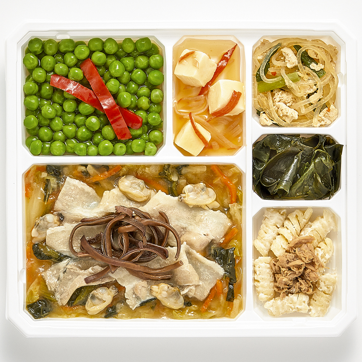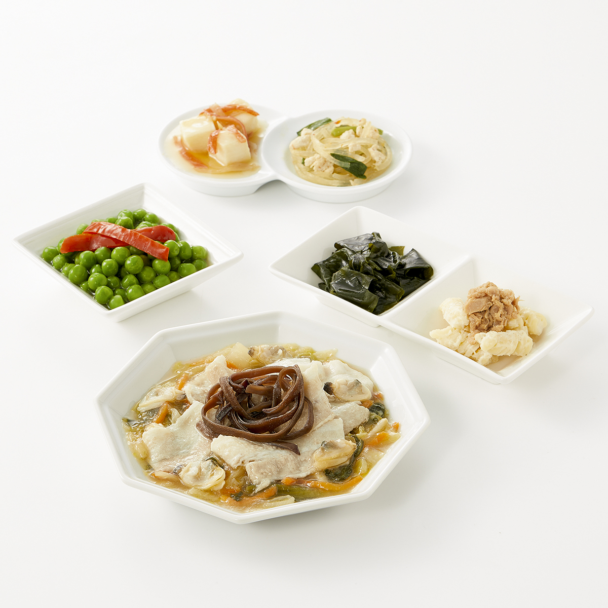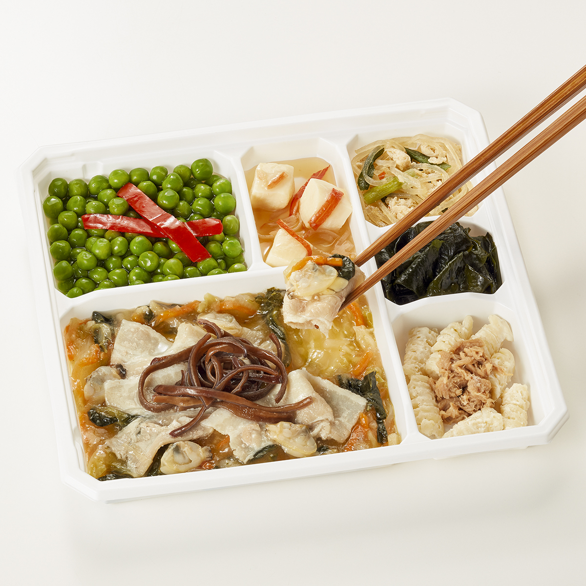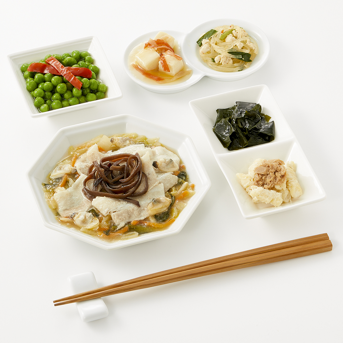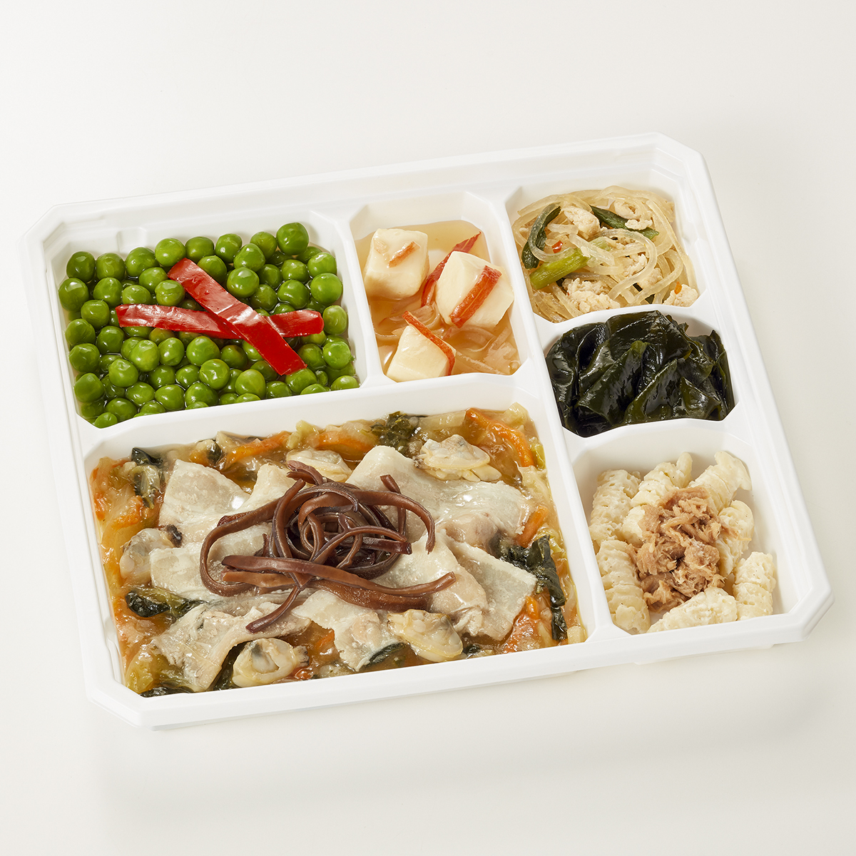 | 原材料名 | 原材料名:グリーンピース(ニュージーランド産)、キャベツ(日本産)、豆腐、マカロニ、豚肉(スペイン産)、わかめ、人参、玉ねぎ、春雨、鶏ひき肉、調合ごま油、半固体状ドレッシング、小松菜、あさり(中国産)、ピーマン、ツナフレーク、きくらげ、筍、醤油、オイスターソース、ニラ、みりん風調味料、醤油だし、発酵調味料、砂糖、魚肉ねり製品、粉末調味料、塩胡椒、生姜、にんにく、甜麺醤、植物油、豆板醤、食塩、還元澱粉加水分解物/糊料(加工澱粉、CMC、増粘多糖類)、調味料(アミノ酸等)、凝固剤、加工澱粉、ミョウバン、pH調整剤、炭酸Ca、酸化防止剤(V.E、V.C、チャ抽出物)、着色料(カラメル、トマト色素)、香料、酸味料、乳化剤、香辛料、(一部にかに・小麦・卵・乳成分・オレンジ・牛肉・ごま・さば・大豆・鶏肉・豚肉・りんご・ゼラチンを含む) 原材料配合割合(仕込み時):豚肉3%あさり1% | ||
