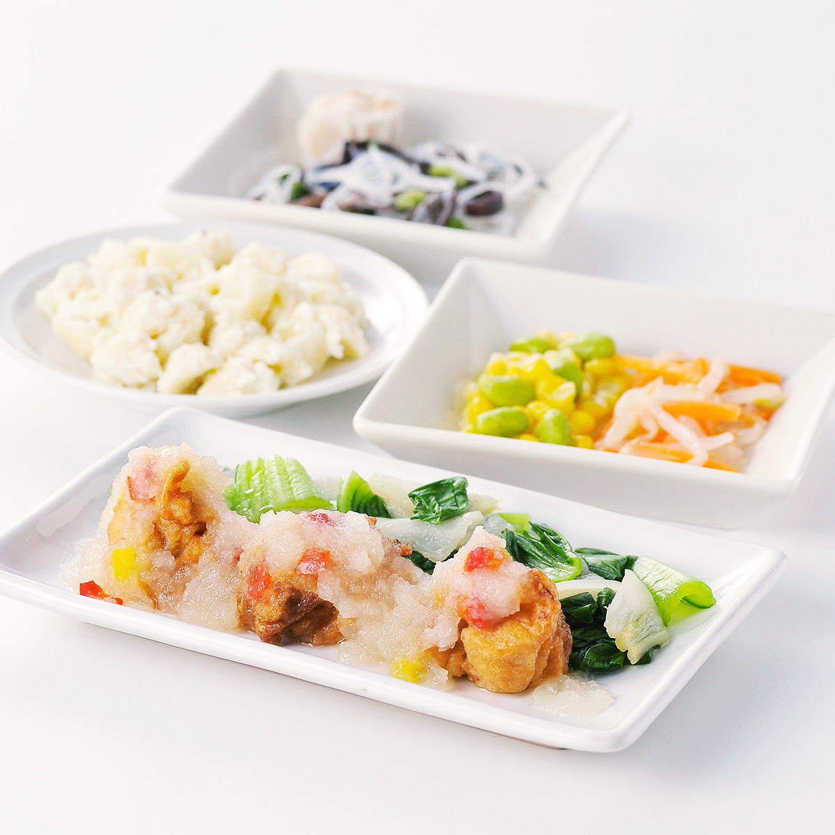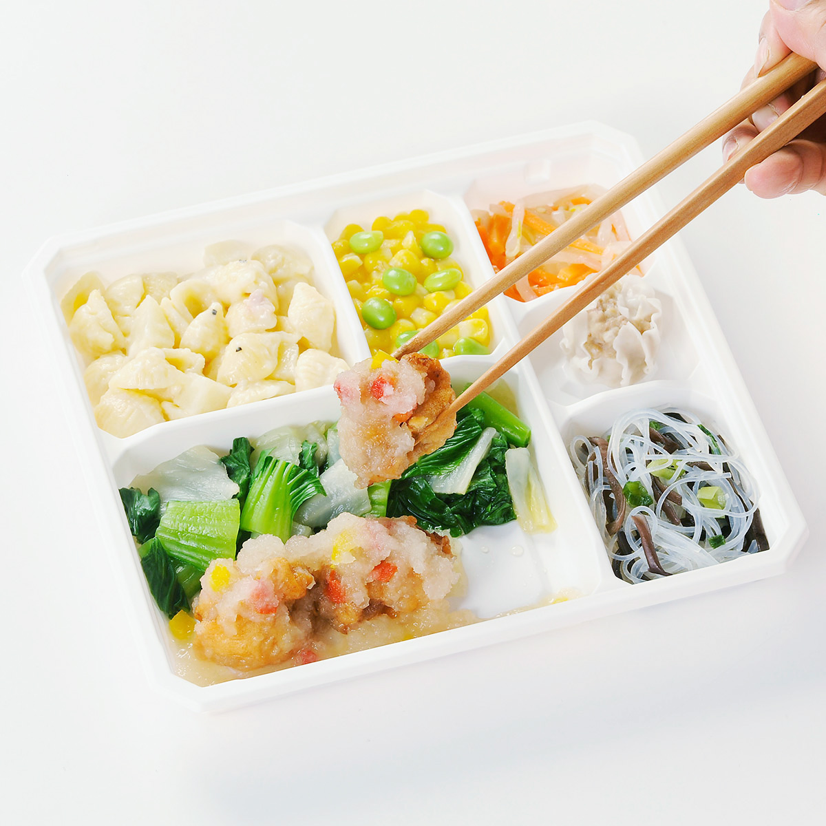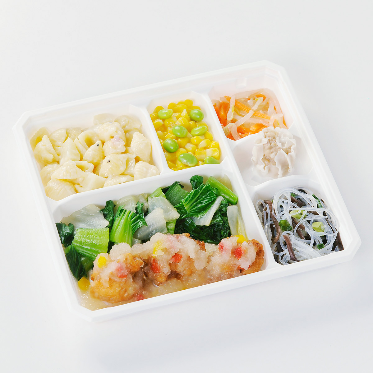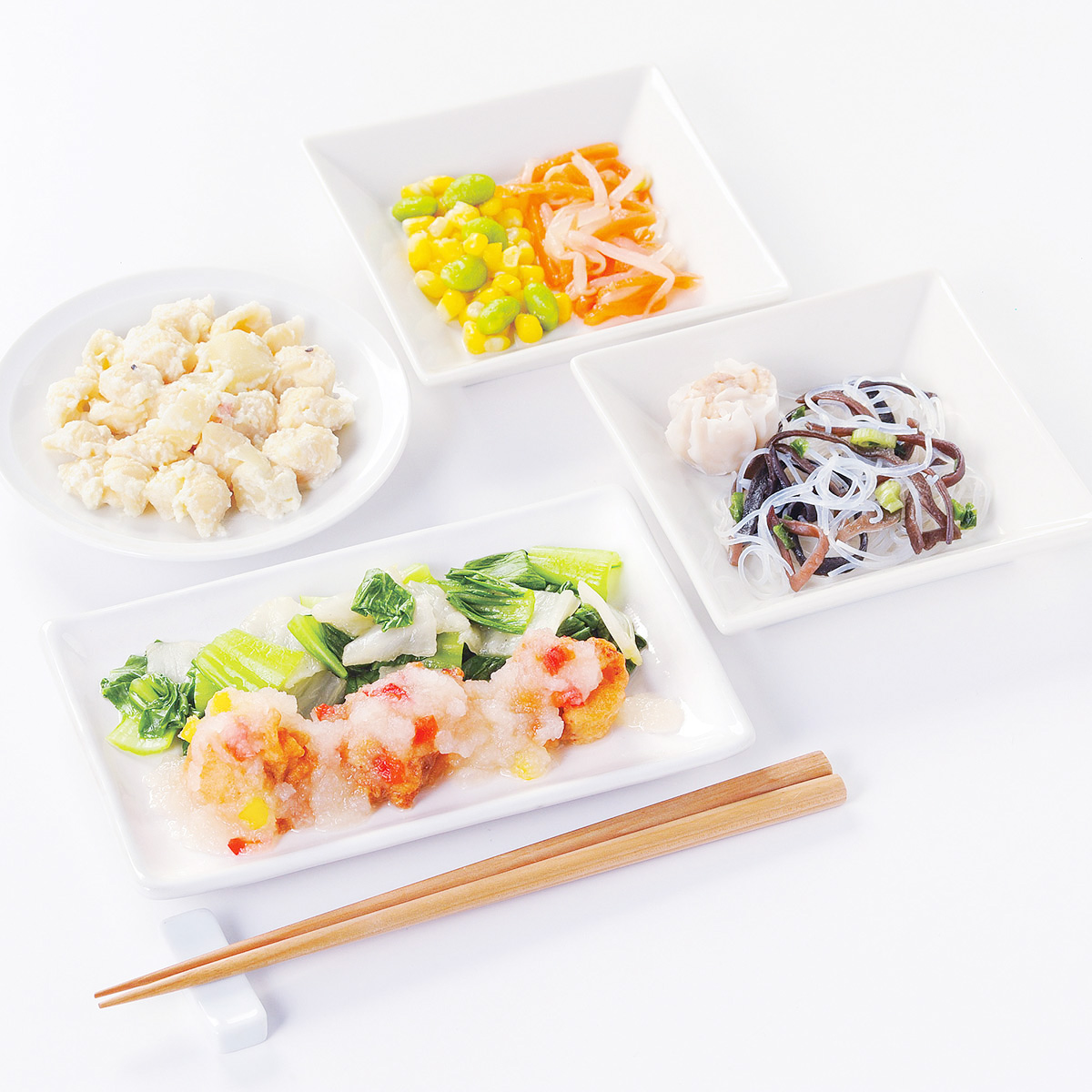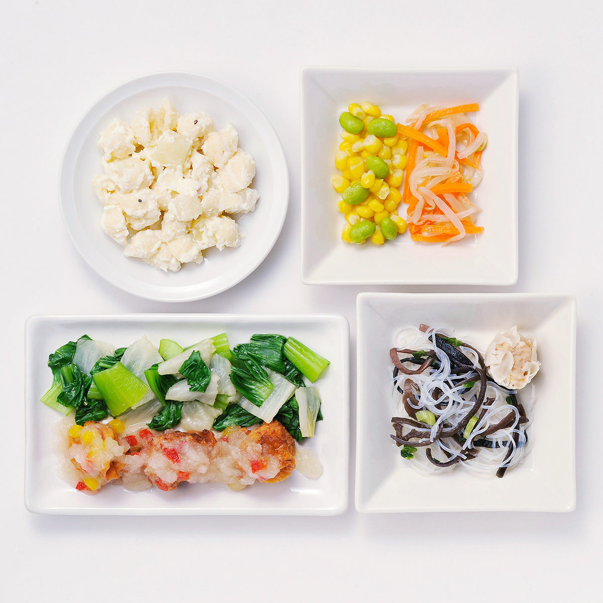 | 原材料名 | チンゲン菜、鶏肉、大根、白菜、焼売、緑豆もやし、マカロニ、コーン、なたね油、人参、玉ねぎ、枝豆、じゃがいも、唐揚げ粉、牛乳、発酵調味料、ホワイトソース、ねぎ、黄ピーマン、赤ピーマン、春雨、顆粒和風だし、ごま油、食塩、乾燥きくらげ、焼ベーコン、砂糖、清酒、中華スープの素、顆粒洋風だし、調合油(なたね油、ごま油)、煎り白ごま、黒こしょう/増粘剤(加工デンプン)、調味料(アミノ酸等)、加工デンプン、酸味料、くん液、リン酸塩(Na)、酸化防止剤(エリソルビン酸Na)、着色料(紅麹、ラック)、発色剤(亜硝酸Na)、乳化剤、(一部に小麦・乳成分・牛肉・ごま・大豆・鶏肉・豚肉・ゼラチンを含む) | ||