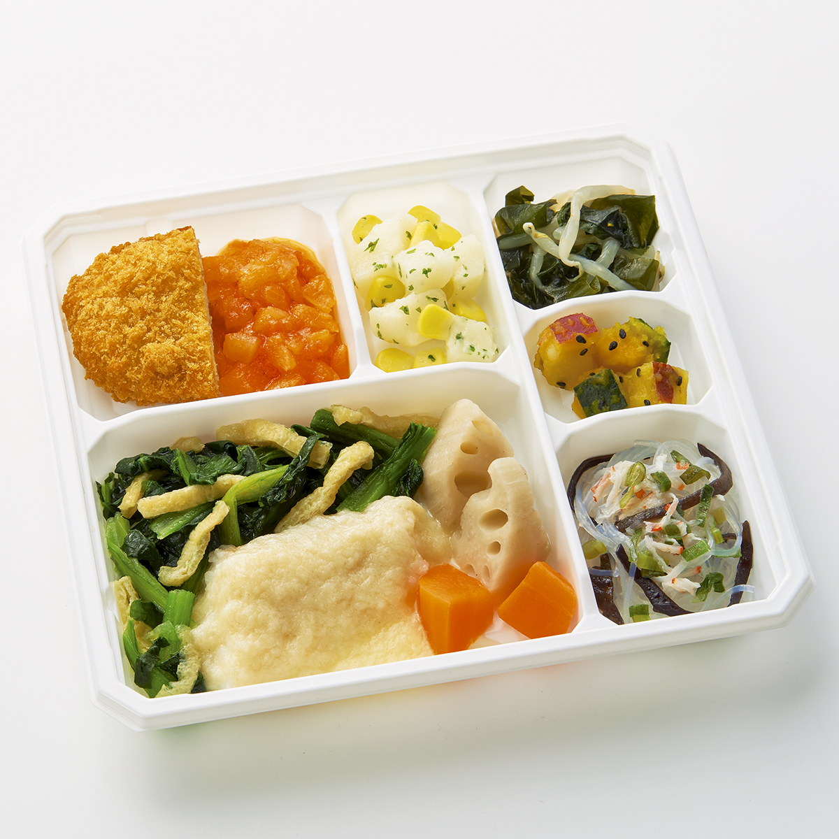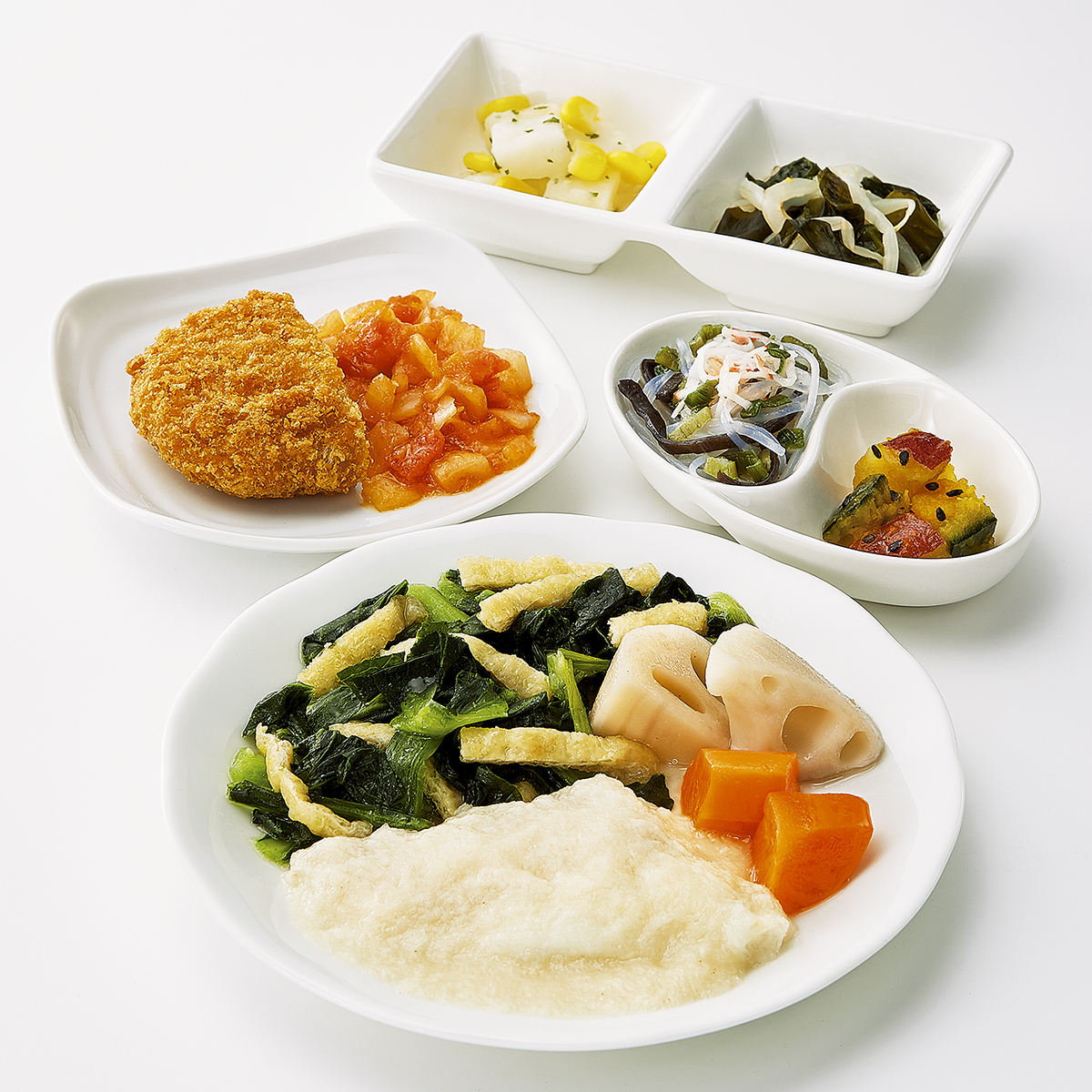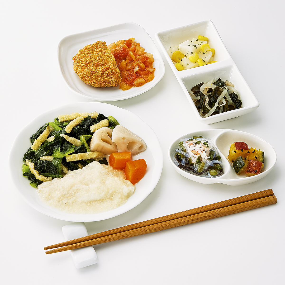 | 原材料名 | 小松菜、牛肉入コロッケ、カレイ、れんこん、緑豆もやし、じゃがいも、玉ねぎ、なたね油、人参、さつまいも、トマト・ピューレー漬、かぼちゃ、味噌、油揚げ、コーン、春雨、ねぎ、砂糖、発酵調味料、かに風味かまぼこ、ケチャップ、食塩、乾燥きくらげ、清酒、乾燥わかめ、顆粒和風だし、ゆず果汁、濃口醤油、醸造酢、顆粒洋風だし、煎り黒ごま、ゼラチン、おろしゆず、にんにく、パセリ粉、白こしょう/増粘剤(加工デンプン、増粘多糖類)、加工デンプン、調味料(アミノ酸等)、着色料(パプリカ粉末、カラメル、紅麹、カロチノイド、ラック)、炭酸Ca、酸味料、香料、(一部に小麦・卵・乳成分・かに・牛肉・ごま・大豆・鶏肉・豚肉・ゼラチンを含む) | ||
