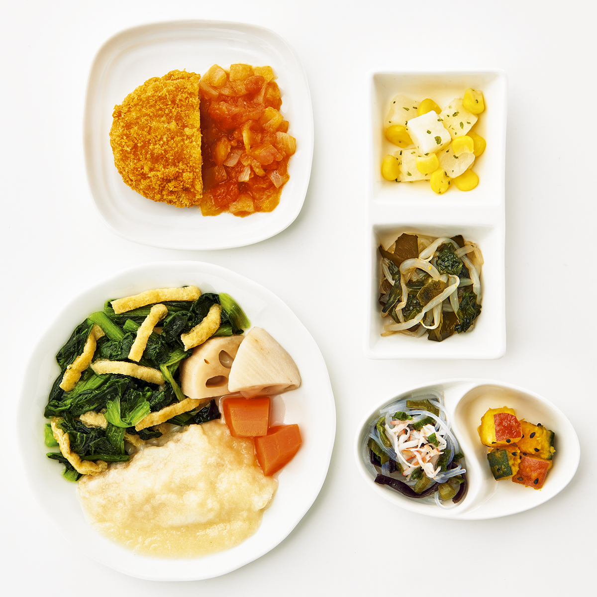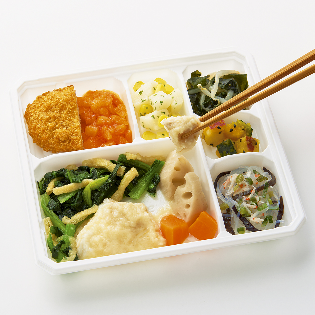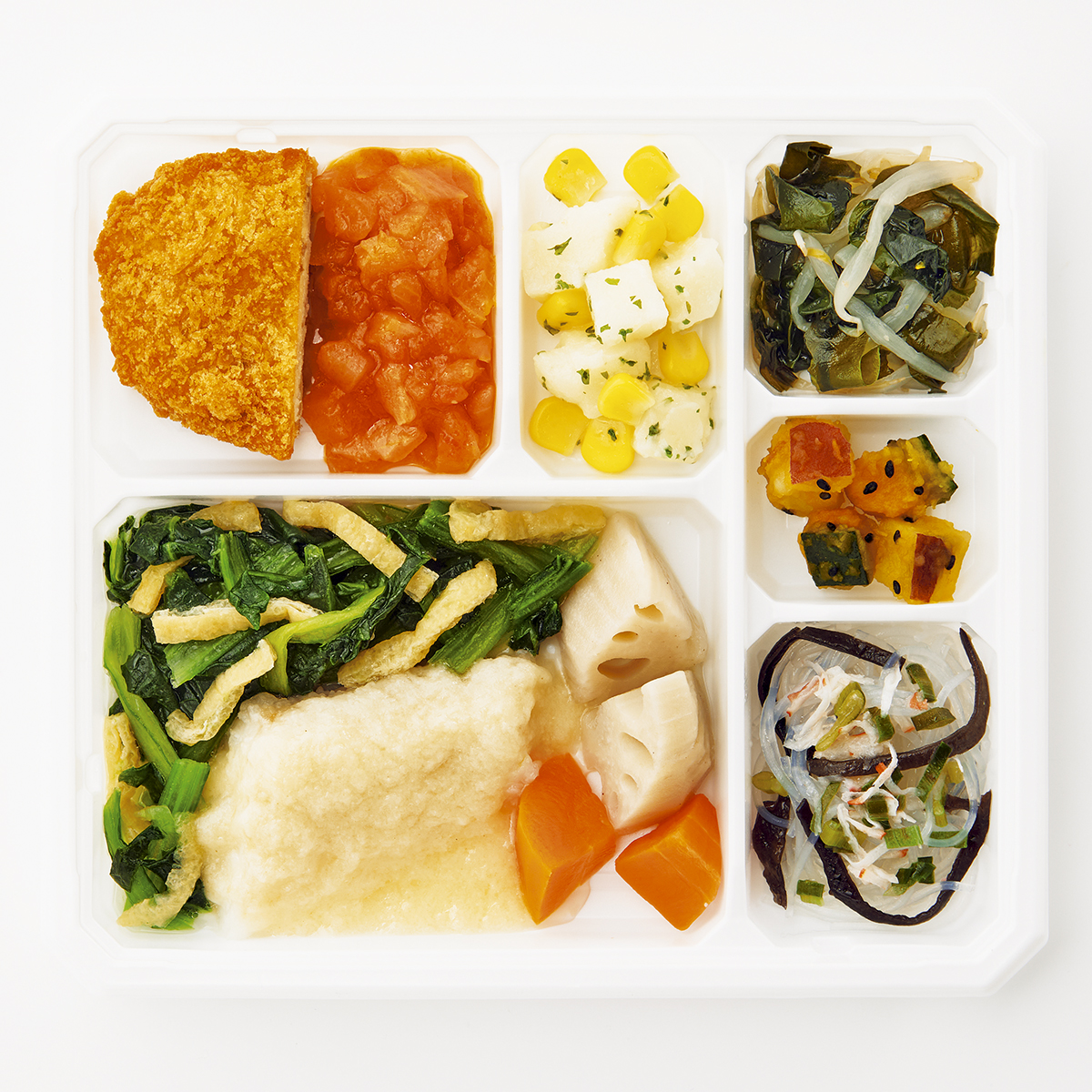 | 原材料名 | 小松菜、牛肉入コロッケ、カレイ、れんこん、緑豆もやし、じゃがいも、玉ねぎ、なたね油、人参、さつまいも、トマト・ピューレー漬、かぼちゃ、味噌、油揚げ、コーン、春雨、ねぎ、砂糖、発酵調味料、かに風味かまぼこ、ケチャップ、食塩、乾燥きくらげ、清酒、乾燥わかめ、顆粒和風だし、ゆず果汁、濃口醤油、醸造酢、顆粒洋風だし、煎り黒ごま、ゼラチン、おろしゆず、にんにく、パセリ粉、白こしょう/増粘剤(加工デンプン、増粘多糖類)、加工デンプン、調味料(アミノ酸等)、着色料(パプリカ粉末、カラメル、紅麹、カロチノイド、ラック)、炭酸Ca、酸味料、香料、(一部に小麦・卵・乳成分・かに・牛肉・ごま・大豆・鶏肉・豚肉・ゼラチンを含む) | ||