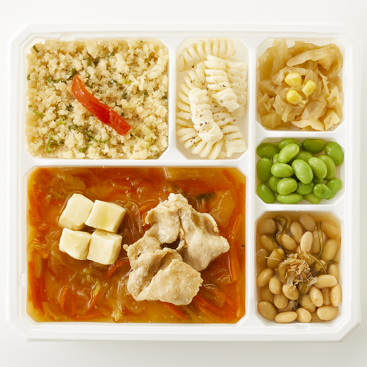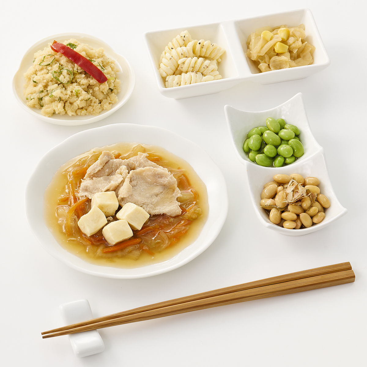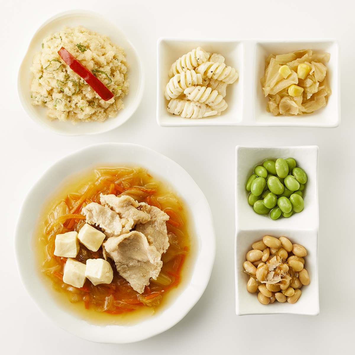 | 原材料名 | 白菜(日本産)、キャベツ(日本産)、水煮大豆(カナダ産)、マカロニ、豆腐、枝豆、玉ねぎ、豚肉(カナダ産)、人参、発酵調味料、半固体状ドレッシング、みりん風調味料、砂糖、おから、ねぎ、醤油、植物油、ピーマン、こんぶ加工品、とうもろこし、醤油だし、バターソース、しょうが、調合ごま油、黒胡椒、かつお削り節、塩こしょう、オイスターソース、粉末調味料、還元澱粉加水分解物、食塩/糊料(加工でん粉、増粘多糖類)、調味料(アミノ酸等)、凝固剤、酒精、酸化防止剤(V.E、V.C、チャ抽出物)、酸味料、pH調整剤、香料、乳化剤、着色料(クチナシ)、酢酸、香辛料、(一部に小麦・卵・乳成分・牛肉・ごま・さば・ゼラチン・大豆・鶏肉・豚肉・りんごを含む) | ||