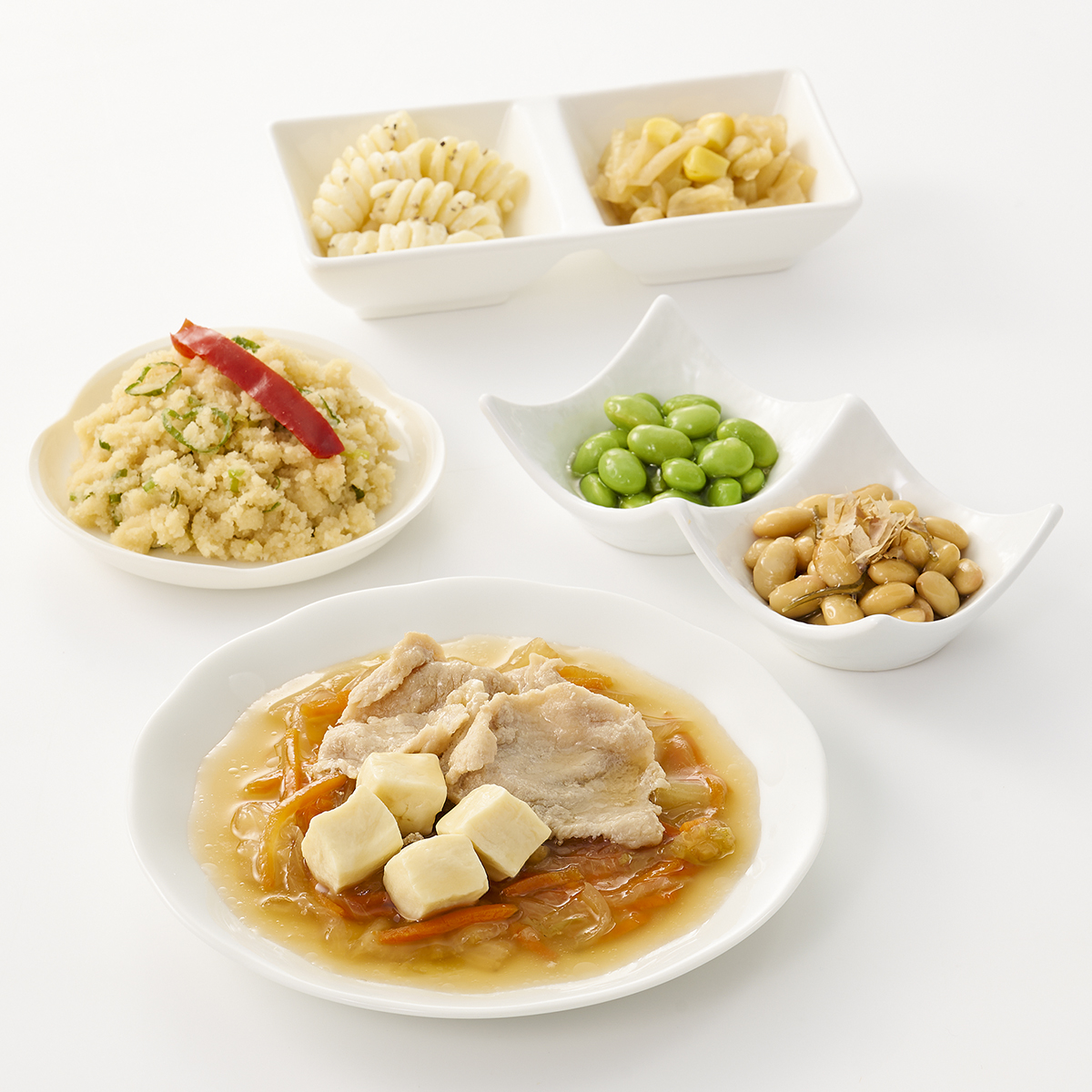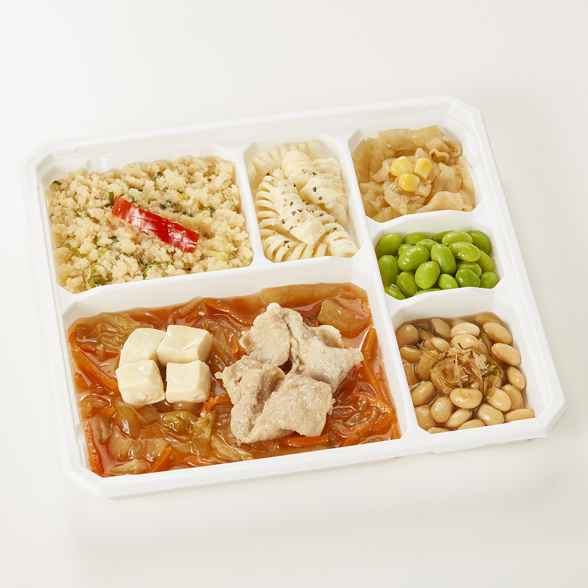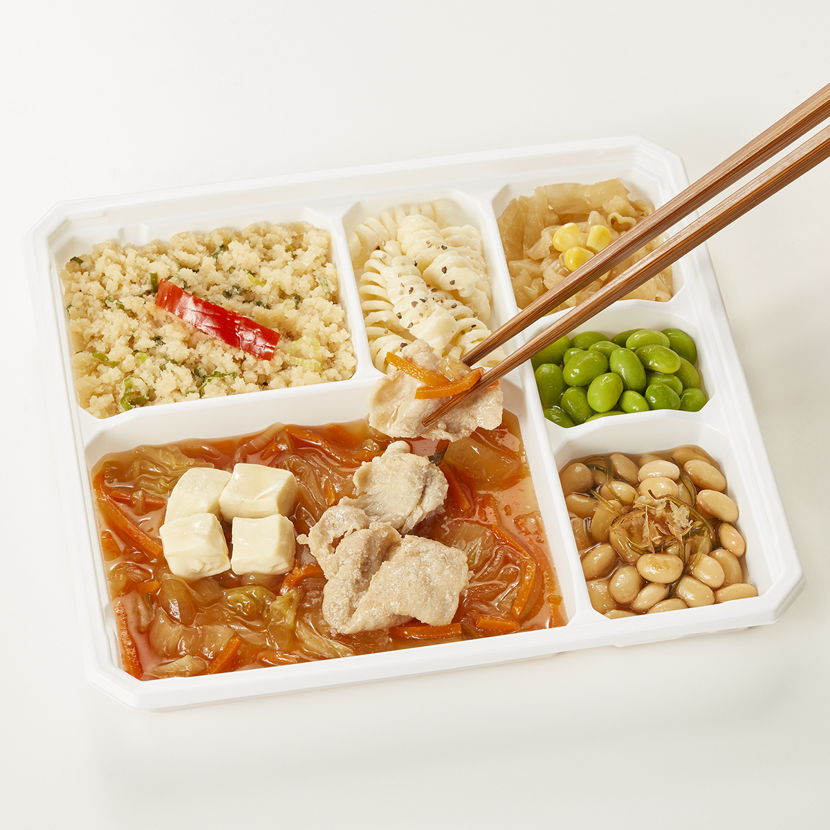 | 原材料名 | 白菜(日本産)、キャベツ(日本産)、水煮大豆(カナダ産)、マカロニ、豆腐、枝豆、玉ねぎ、豚肉(カナダ産)、人参、発酵調味料、半固体状ドレッシング、みりん風調味料、砂糖、おから、ねぎ、醤油、植物油、ピーマン、こんぶ加工品、とうもろこし、醤油だし、バターソース、しょうが、調合ごま油、黒胡椒、かつお削り節、塩こしょう、オイスターソース、粉末調味料、還元澱粉加水分解物、食塩/糊料(加工でん粉、増粘多糖類)、調味料(アミノ酸等)、凝固剤、酒精、酸化防止剤(V.E、V.C、チャ抽出物)、酸味料、pH調整剤、香料、乳化剤、着色料(クチナシ)、酢酸、香辛料、(一部に小麦・卵・乳成分・牛肉・ごま・さば・ゼラチン・大豆・鶏肉・豚肉・りんごを含む) | ||