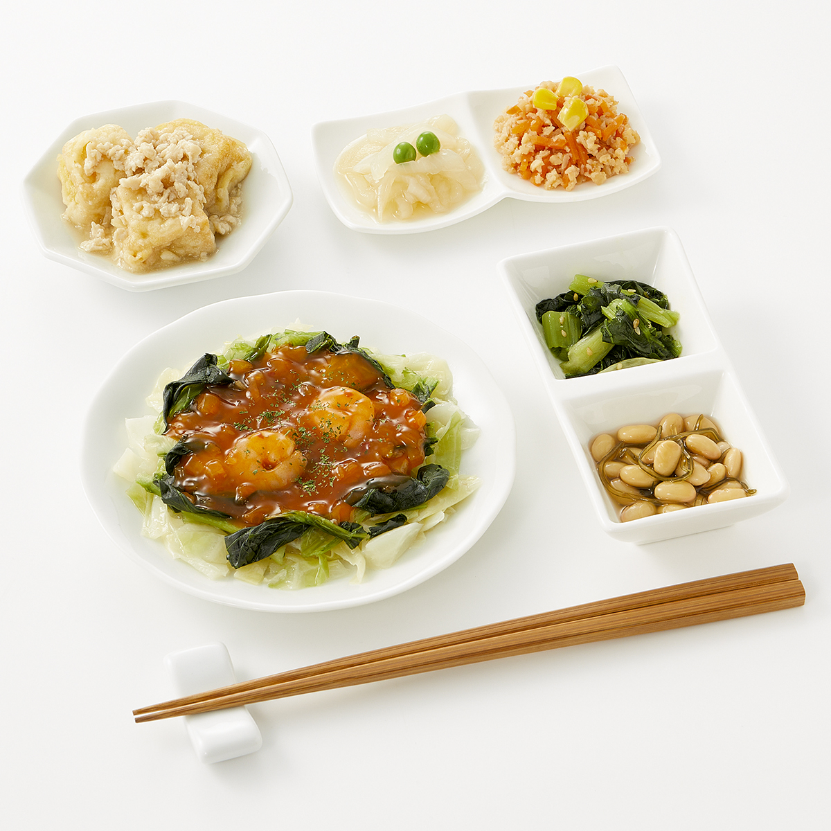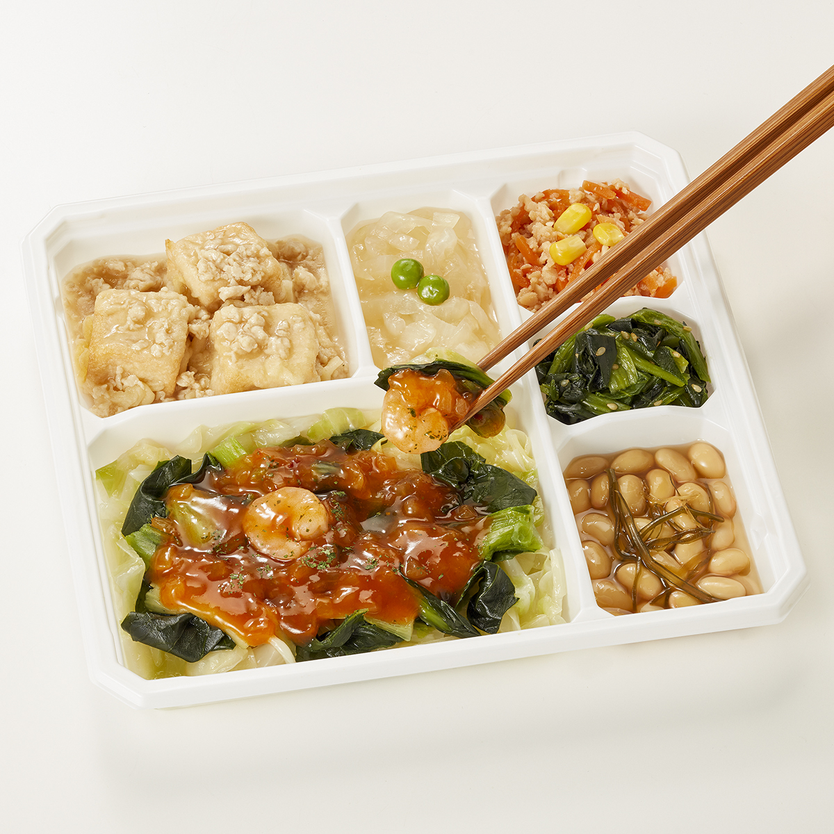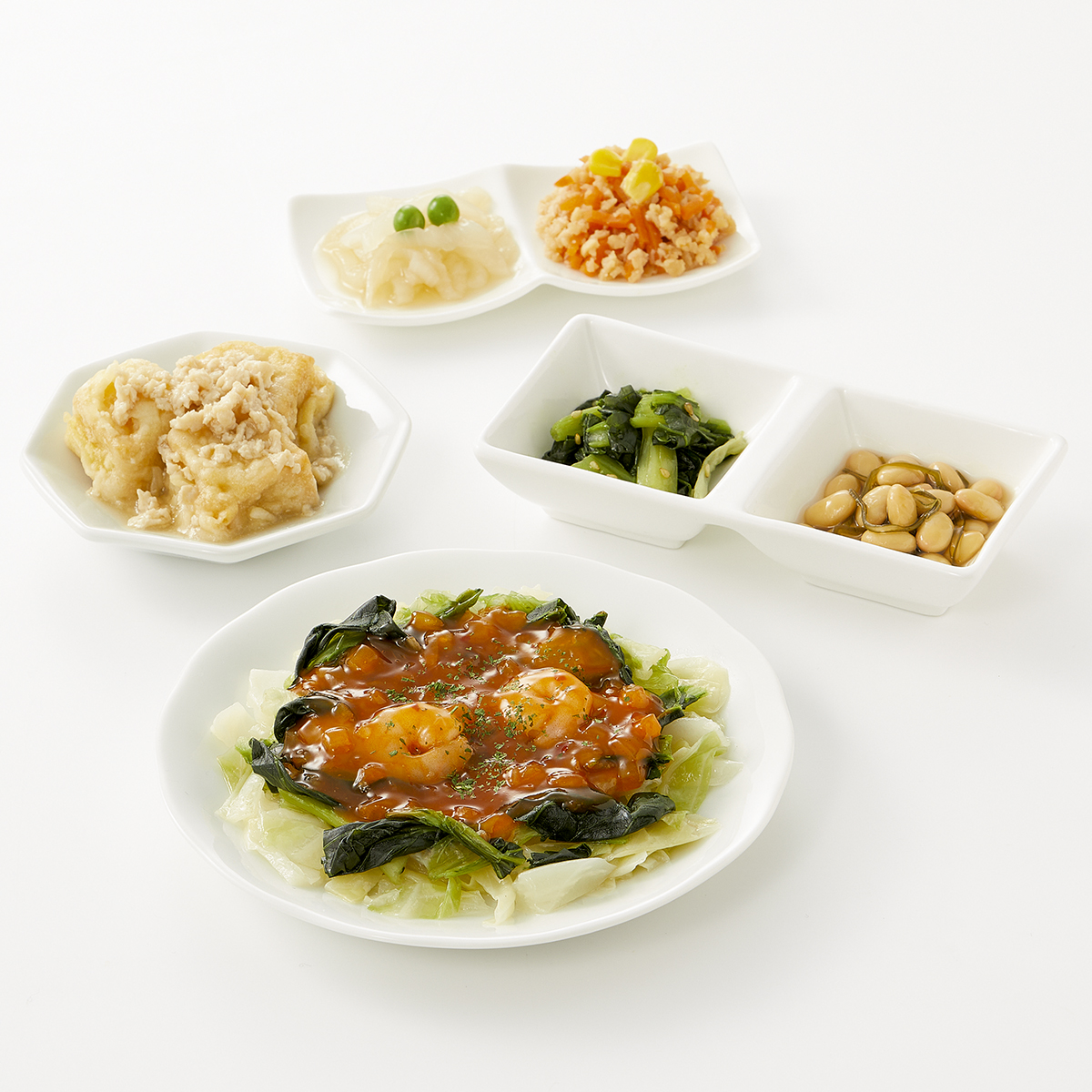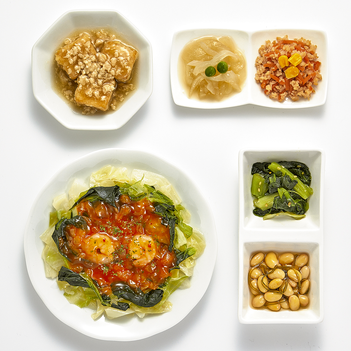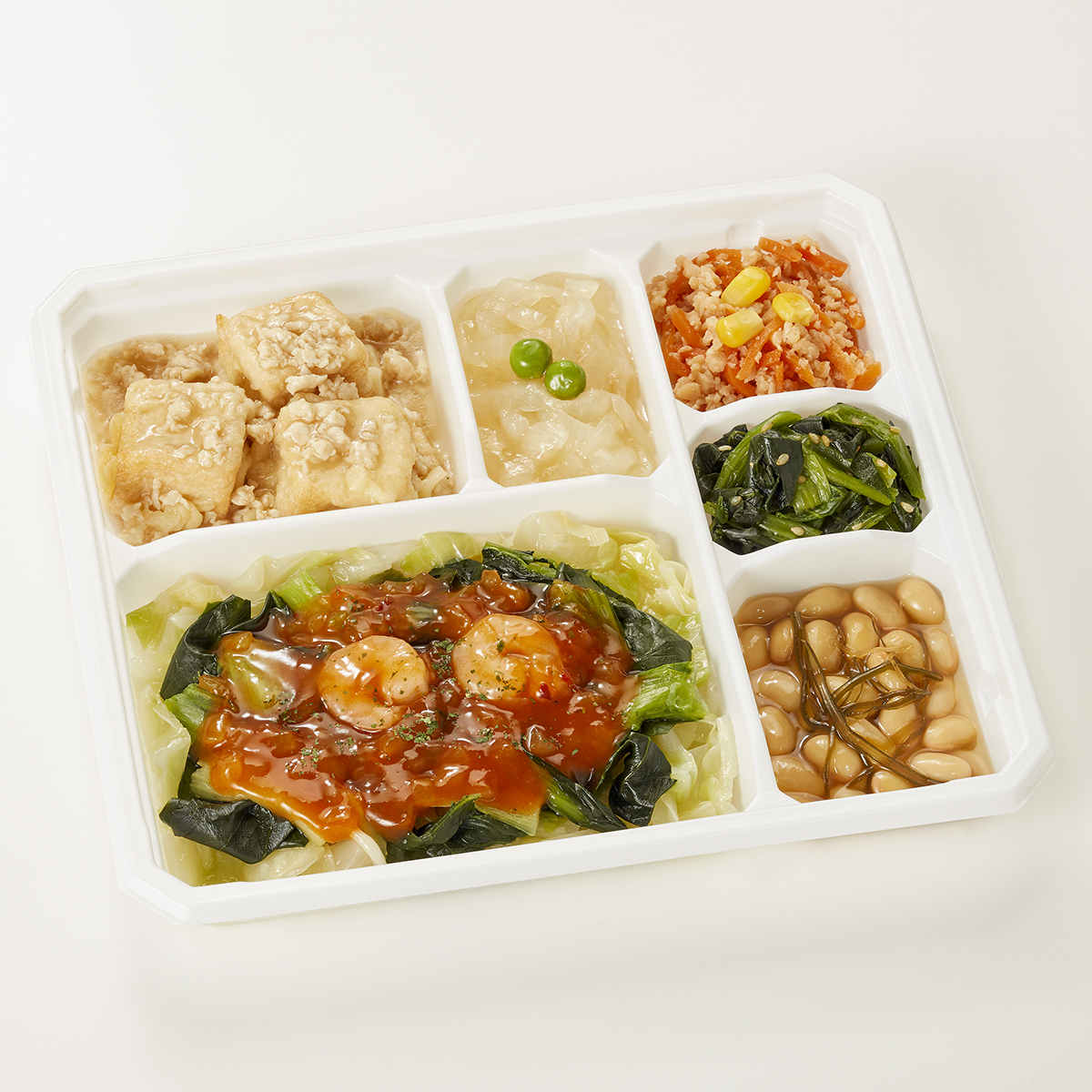 | 原材料名 | キャベツ(日本産)、チンゲン菜(中国産)、唐辛子入りソース、厚揚げ豆腐、小松菜、水煮大豆、玉ねぎ、大豆加工品、鶏ひき肉、人参、植物油、えび(タイ産)、天ぷら粉、醤油、みりん風調味料、砂糖、加工酢、調合ごま油、グリーンピース、とうもろこし、こんぶ加工品、醤油だし、発酵調味料、粉末調味料、オイスターソース、パセリ、ごま、食塩、還元澱粉加水分解物/糊料(加工澱粉、増粘多糖類、寒天)、加工澱粉、トレハロース、調味料(アミノ酸等)、凝固剤、膨脹剤、pH調整剤、酒精、カロチノイド色素、レシチン、香辛料、酸化防止剤(V.E、チャ抽出物)、乳化剤、酸味料、香料、酢酸、(一部に小麦・卵・乳成分・えび・オレンジ・牛肉・ごま・さば・ゼラチン・大豆・鶏肉・豚肉を含む) | ||