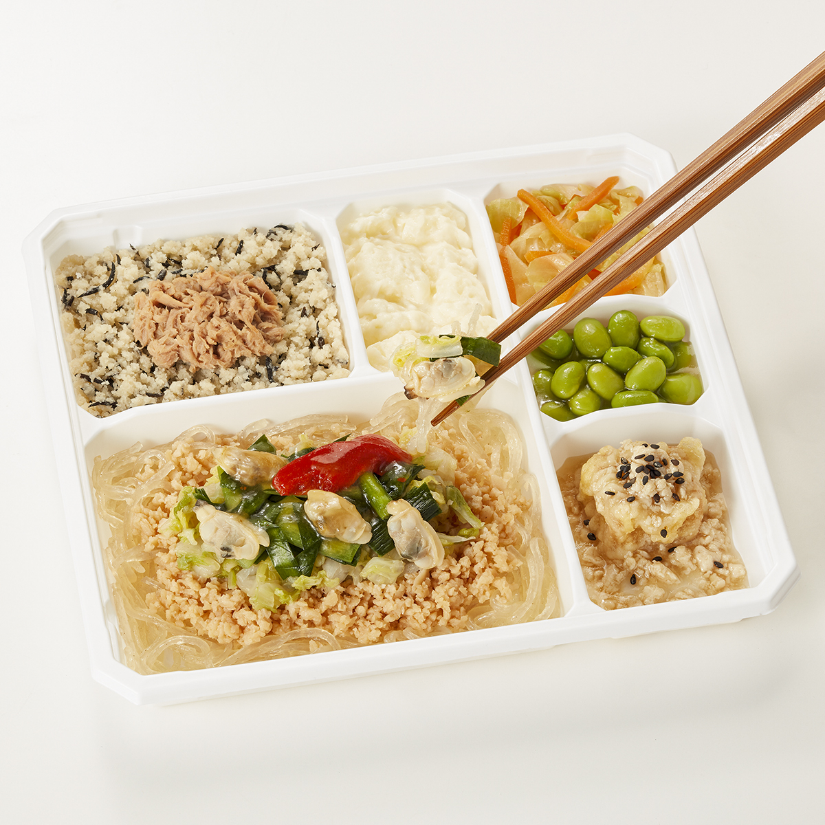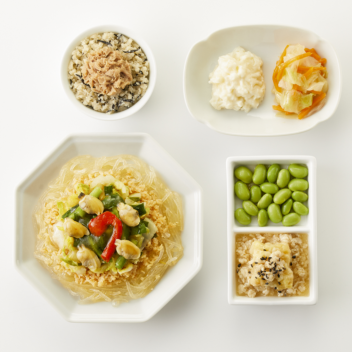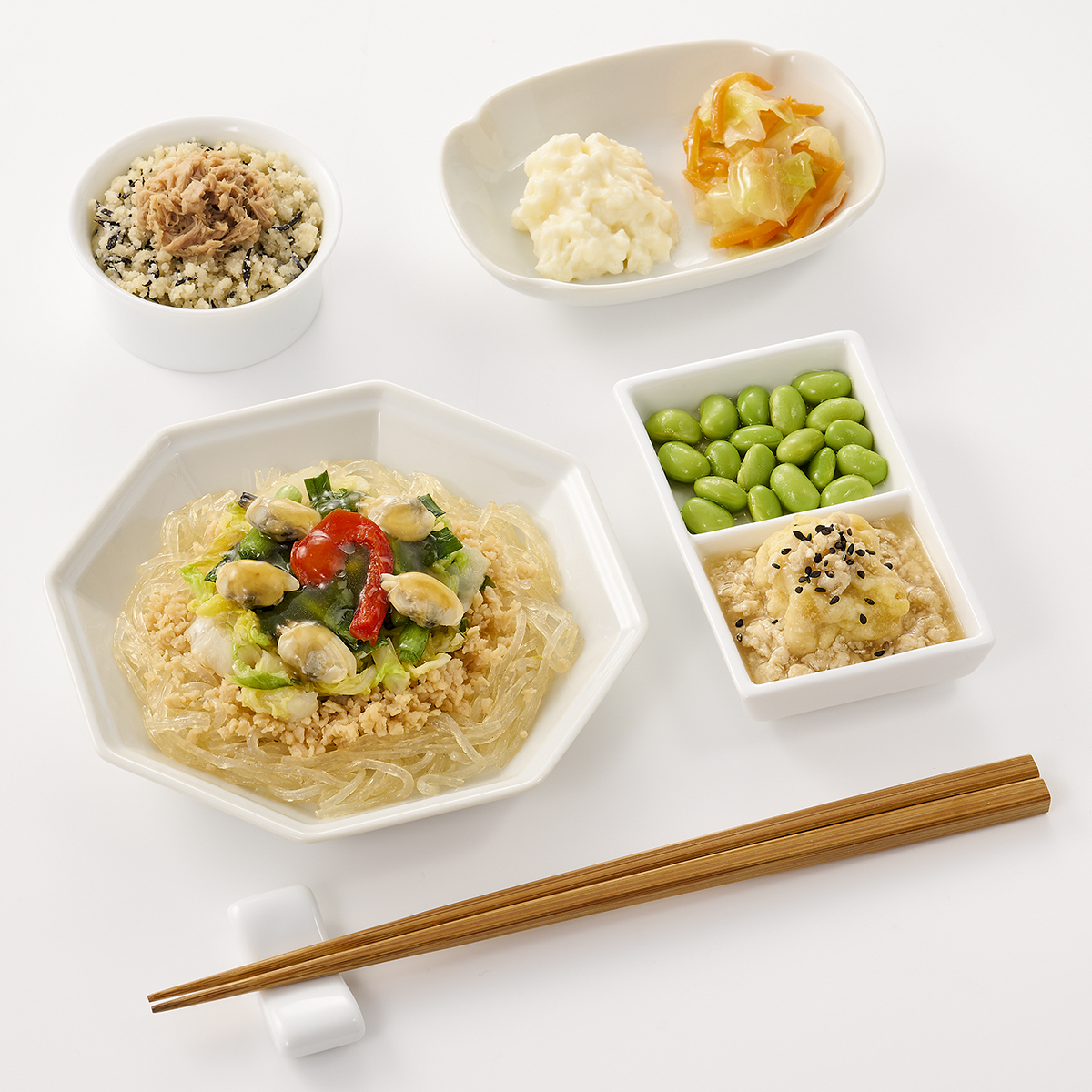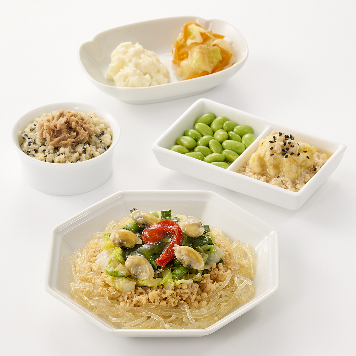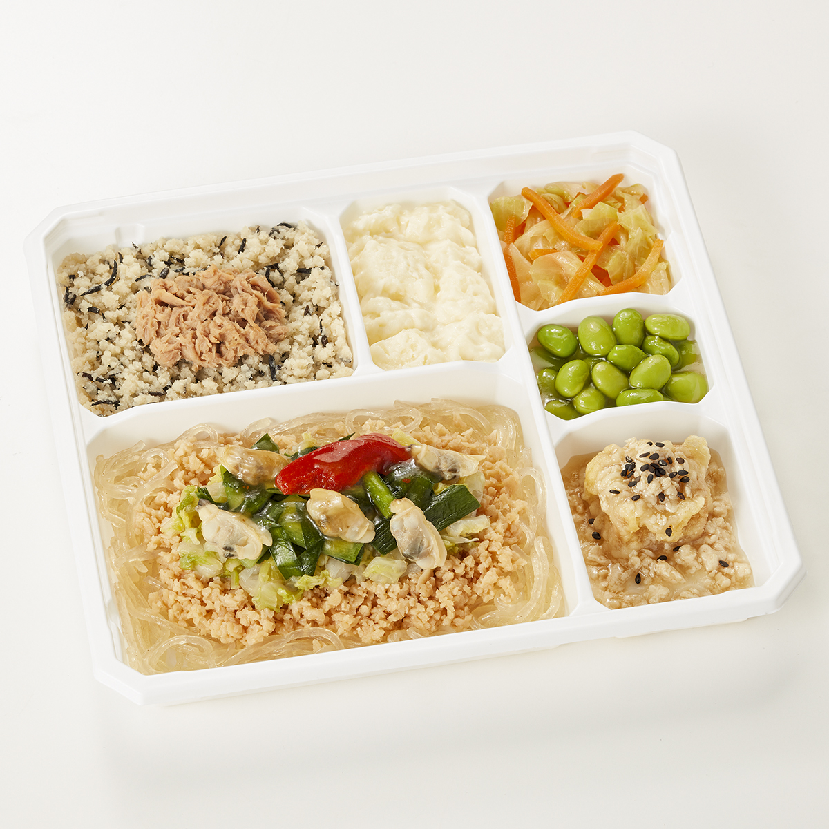 | 原材料名 | 春雨(国内製造)、大豆加工品、ポテトサラダ、枝豆、白菜(日本産)、キャベツ、人参、ツナフレーク、発酵調味料、砂糖、醤油、おから、あさり(中国産)、厚揚げ、にら、ピーマン、植物油、半固体状ドレッシング、ひじき、みりん風調味料、鶏肉ひき肉、天ぷら粉、調合ごま油、バターソース、ごま、にんにく、粉末調味料、オイスターソース、塩こしょう、トウバンジャン、還元でん粉加水分解物/糊料(加工でん粉、CMC、増粘多糖類)、加工でん粉、調味料(アミノ酸等)、トレハロース、ミョウバン、凝固剤、膨脹剤、酒精、pH調整剤、酸化防止剤(V.E、チャ抽出物)、酸味料、酵素、乳化剤、香辛料、香料、着色料(カロチノイド)、(一部に小麦・卵・乳成分・オレンジ・牛肉・ごま・ゼラチン・大豆・鶏肉・豚肉・りんごを含む) | ||