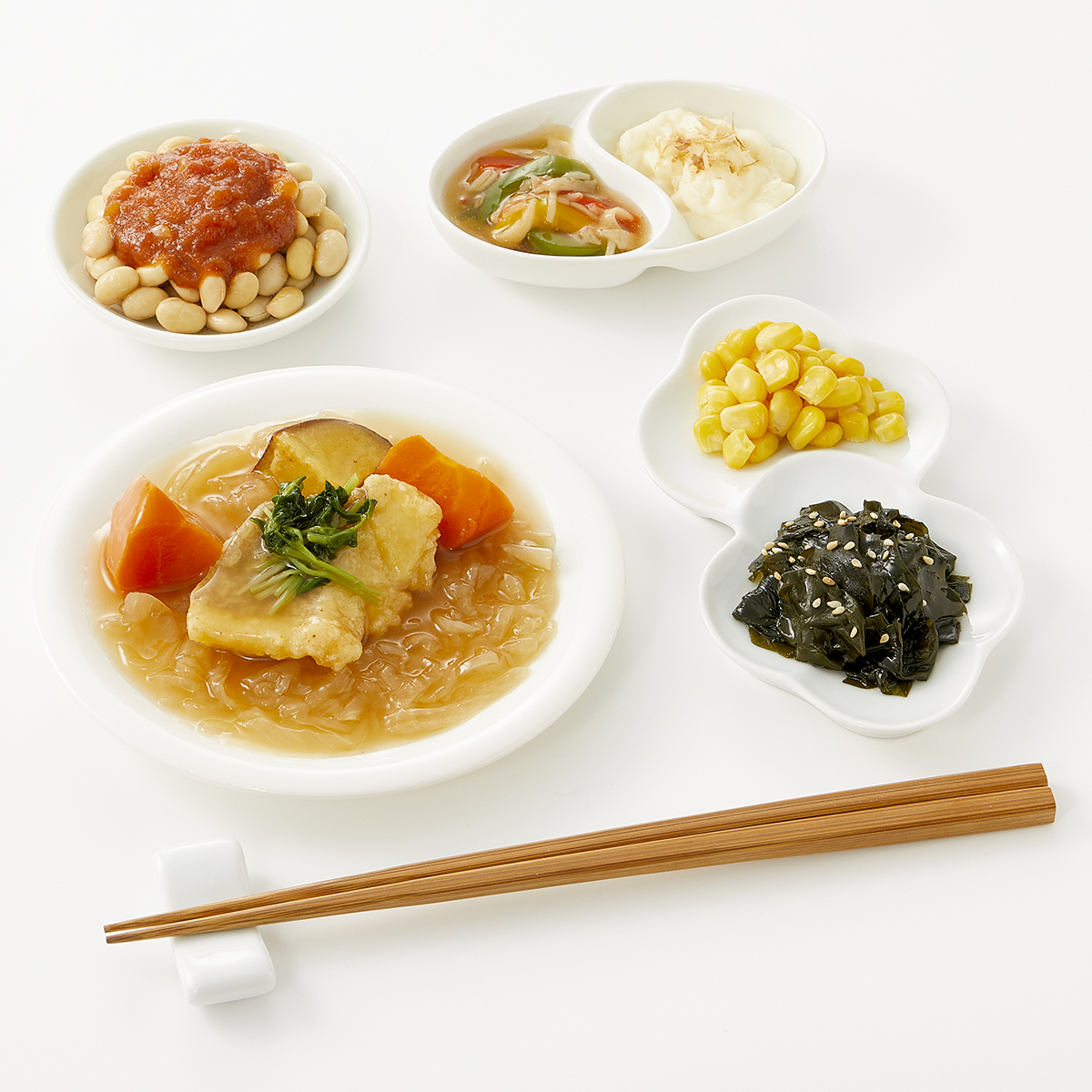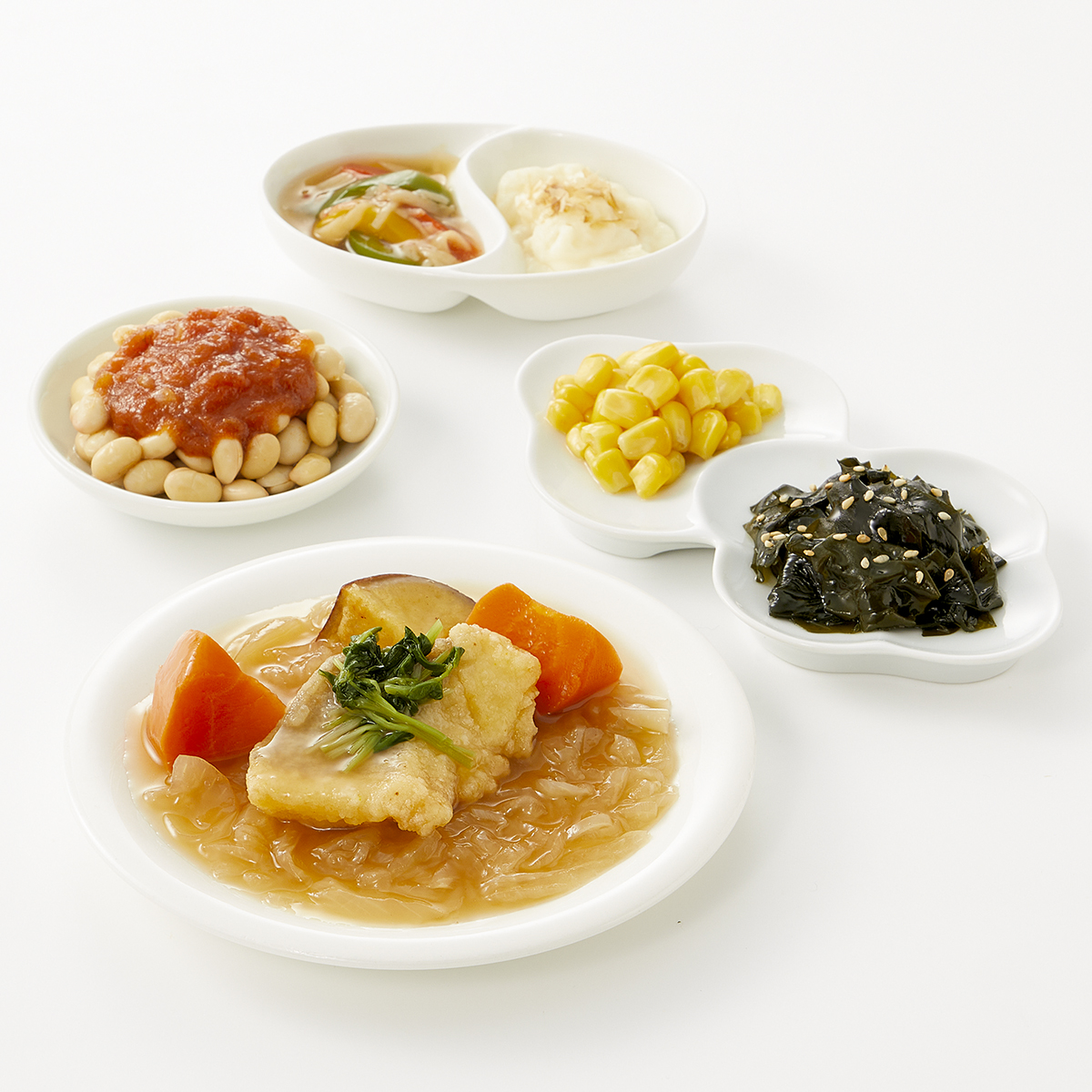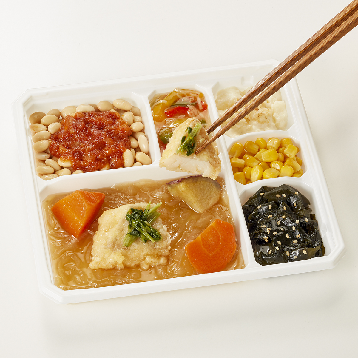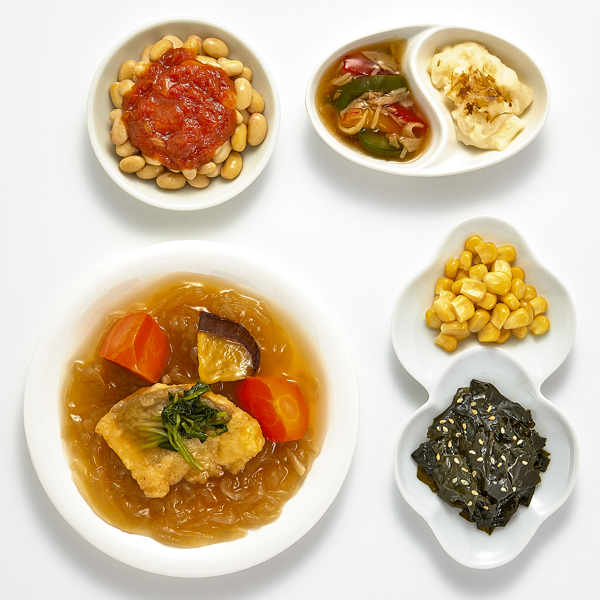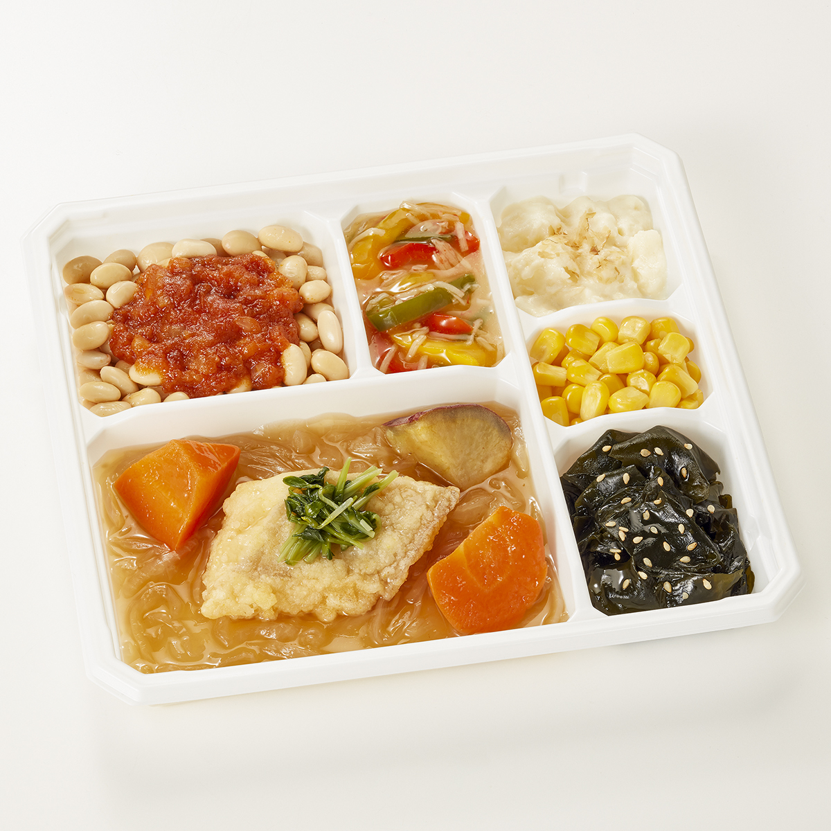 | 原材料名 | 水煮大豆(カナダ産)、アブラカレイ(アメリカ産)、玉ねぎ(日本産)、ポテトサラダ、わかめ、人参、とうもろこし、ピーマン、さつまいも、トマトソース、ケチャップ、醤油だし、醤油、砂糖、半固体状ドレッシング、天ぷら粉、みりん風調味料、豆苗、植物油、魚肉ねり製品、粉末調味料、かつお削り節、ごま、発酵調味料/増粘剤(加工でん粉、増粘多糖類)、加工でん粉、調味料(アミノ酸等)、膨脹剤、炭酸Ca、乳酸Ca、pH調整剤、塩化Ca、着色料(カロチノイド)、酸化防止剤(V.E、チャ抽出物)、酵素、乳化剤、香辛料、香料、酸味料、(一部に小麦・卵・乳成分・かに・牛肉・ごま・さば・ゼラチン・大豆・鶏肉・豚肉・りんごを含む) | ||