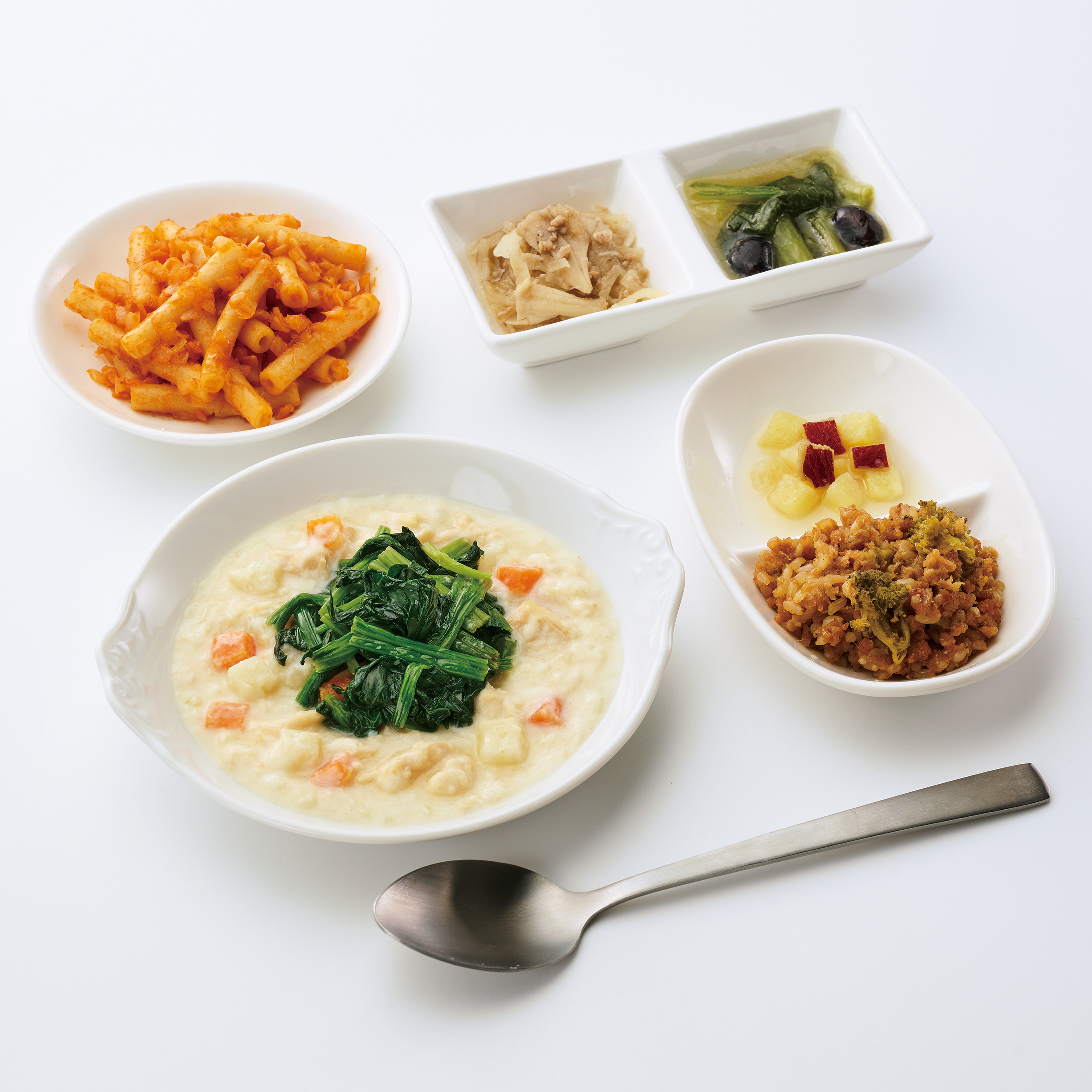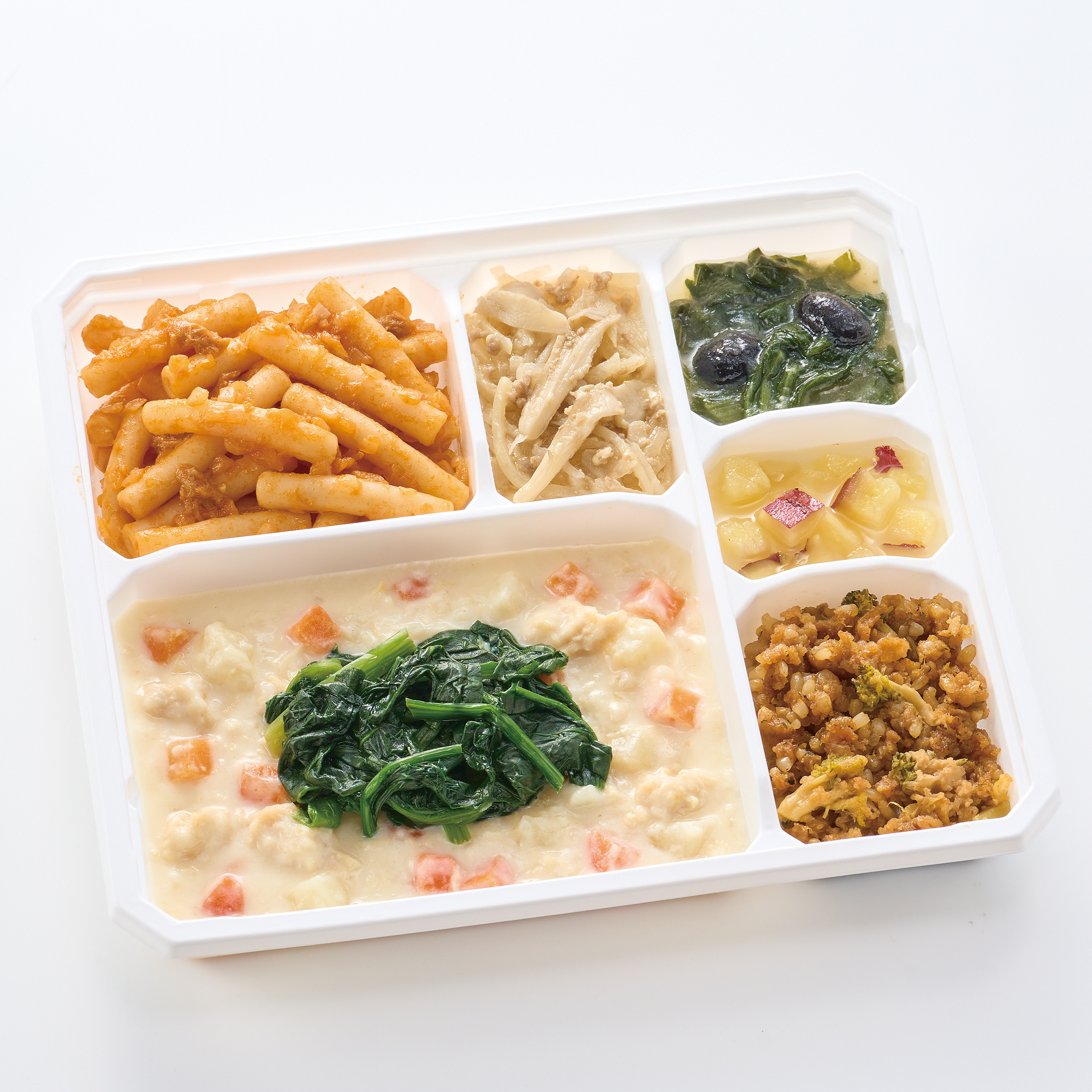 | 原材料名 | 牛乳(国内製造)、たまねぎ、ほうれんそう、鶏肉、だいこん、うるち米、チンゲンサイ、パスタ、じゃがいも、さつまいも、にんじん、トマトピューレ、トマトケチャップ、食用オリーブ油、小麦粉、バター、豚肉、砂糖、ナチュラルチーズ、まいたけ、蒸し黒豆、ブロッコリー、乾燥スープ(コンソメ)、いちじくジャム、果実酒、鶏卵、食用なたね油、デミグラスソースルウ、パン粉、レモン果汁、まぐろ水煮(フレーク)、中濃ソース、にんにく、食塩、こいくちしょうゆ(本醸造)、香醋、ホワイトペッパー、ブラックペッパー、パセリ、タイム、セージ、ローレル/増粘剤(加工でん粉、増粘多糖類)、カラメル色素、セルロース、pH調整剤、クエン酸塩(Na、Ca)、酸味料、調味料(アミノ酸等)、乳化剤、香料、酒精、唐辛子色素、ゲル化剤(加工でん粉、増粘多糖類)、紅麹色素、酸化防止剤(V.C、V.E、二酸化硫黄)、(一部に小麦・卵・乳成分・牛肉・大豆・鶏肉・豚肉・りんご・ゼラチンを含む) | ||