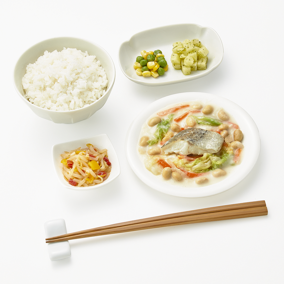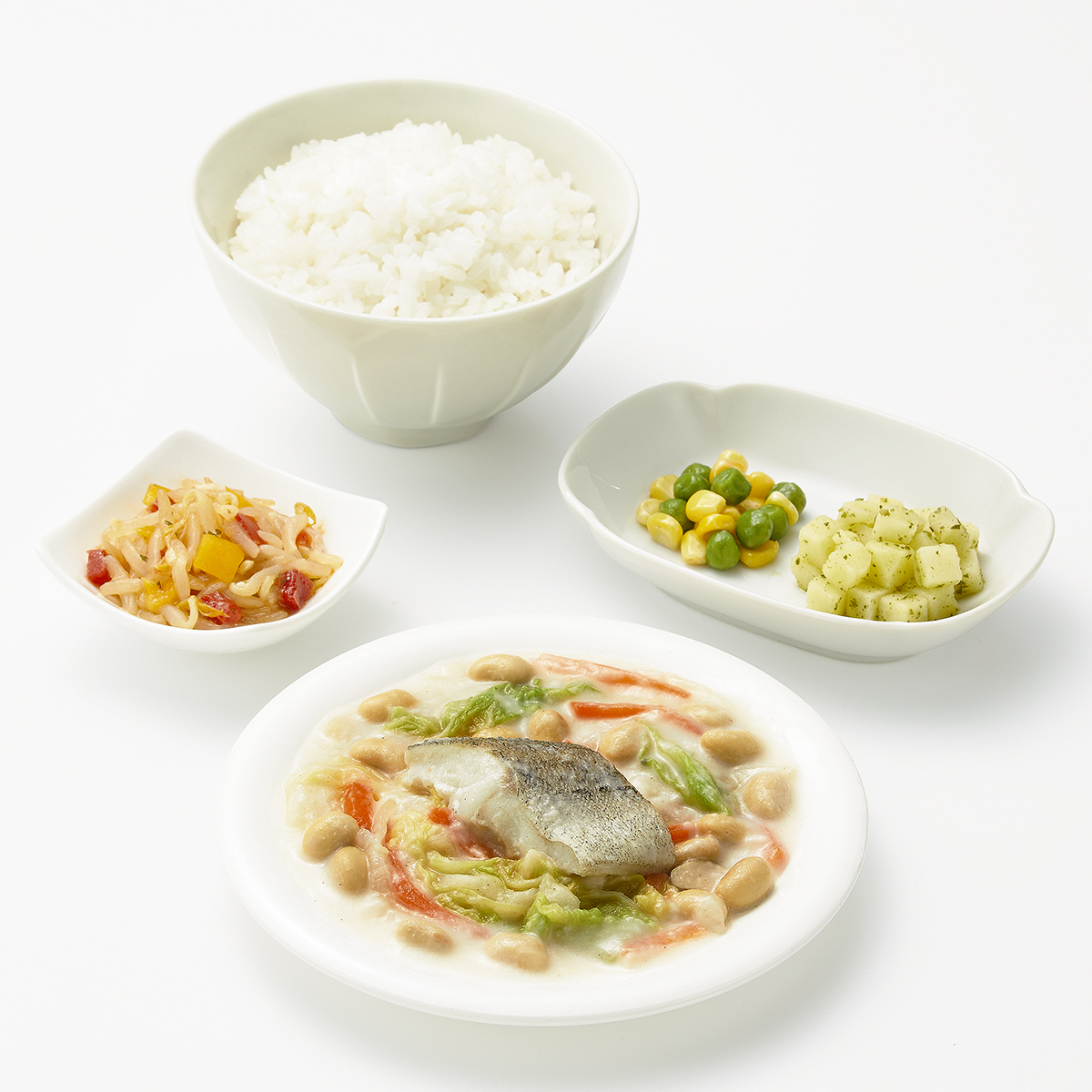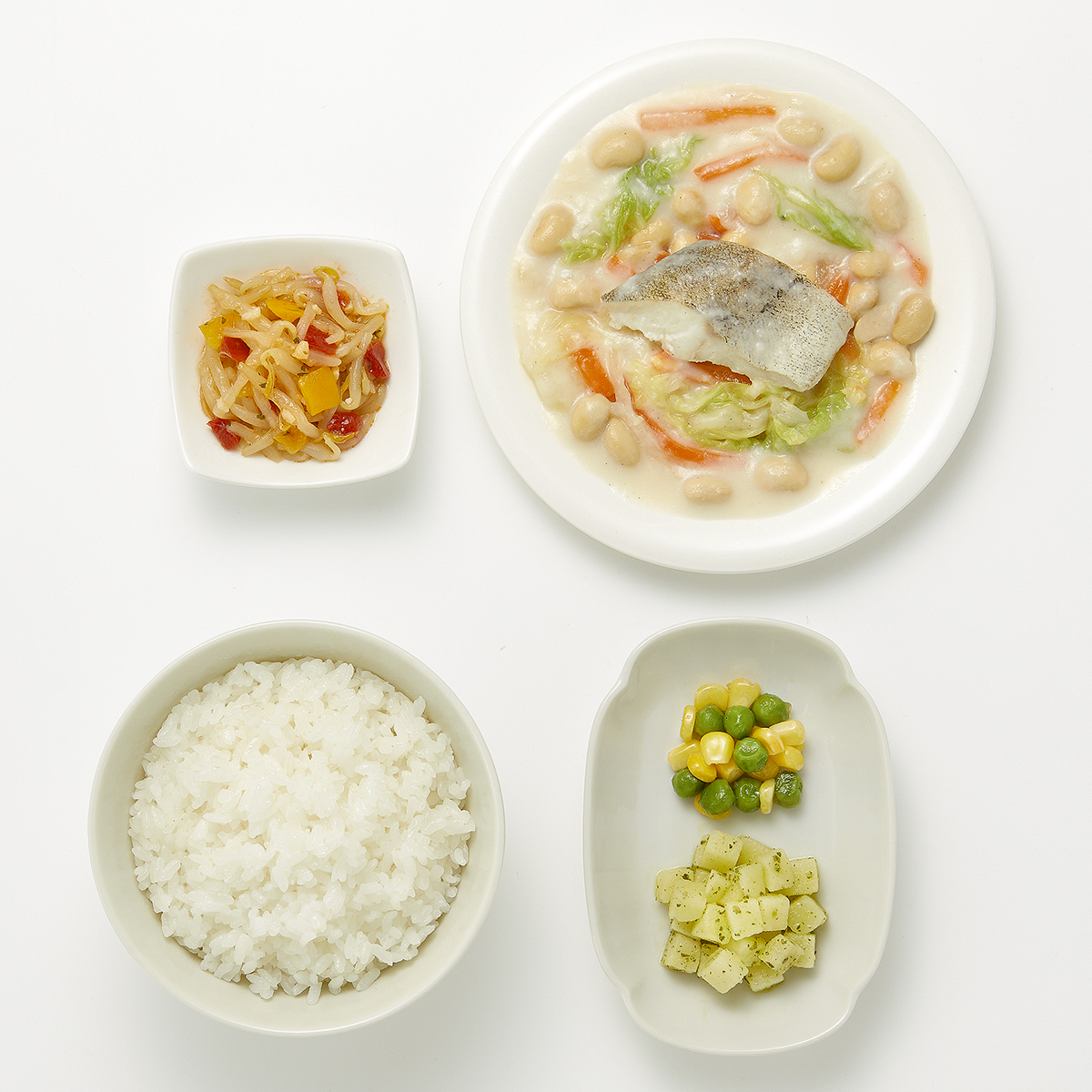 | 原材料名 | 米、緑豆もやし、助宗たら、大豆水煮、白菜、ホワイトソース、じゃがいも、玉ねぎ、人参、牛乳、植物油、グリーンピース、コーン、赤ピーマン、黄ピーマン、オリーブ油、清酒風調味料、食塩、刻みにんにく、コンソメ、バターソース、バジルペースト、醤油、こしょう、パセリ/加工デンプン、増粘剤(加工デンプン、増粘多糖類)、調味料(アミノ酸等)、トレハロース、pH調整剤、塩化Ca、着色料(カラメル、クチナシ)、乳化剤、リン酸塩(Na)、酸味料、香料、香辛料抽出物、(一部に小麦・乳成分・大豆・鶏肉を含む) | ||