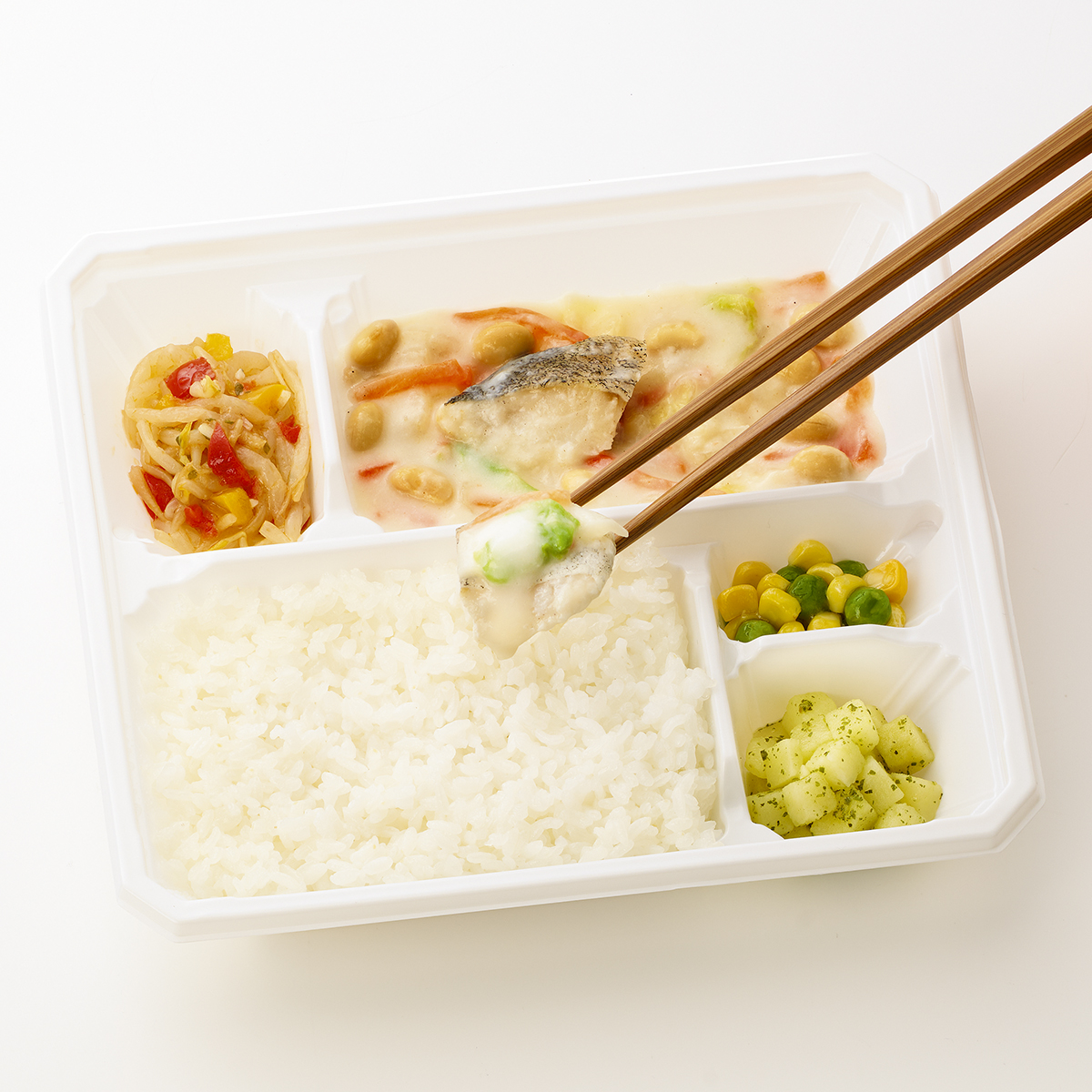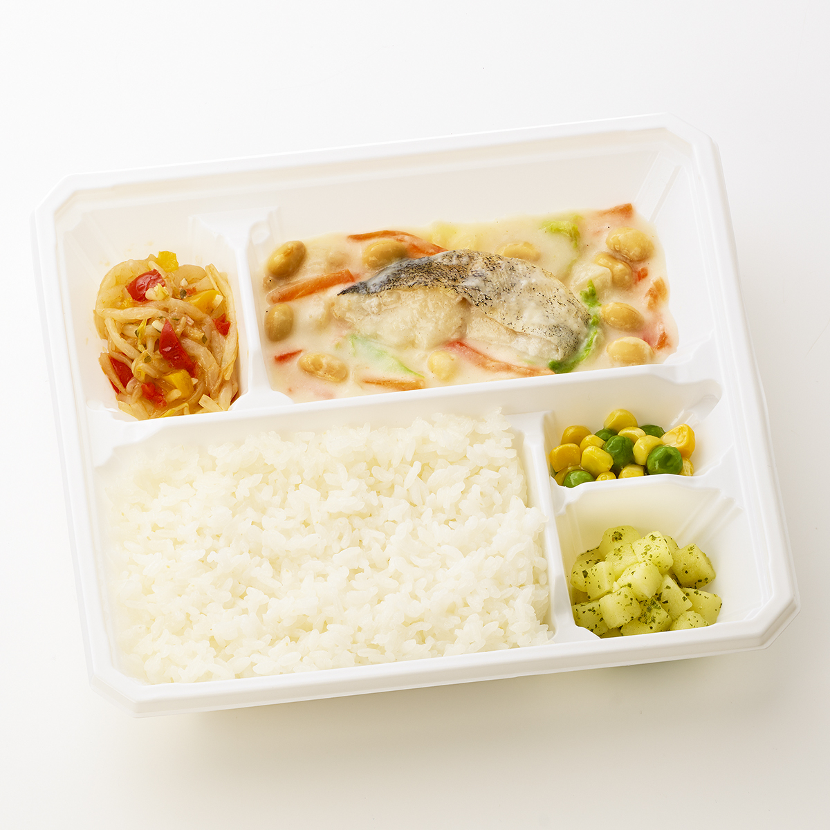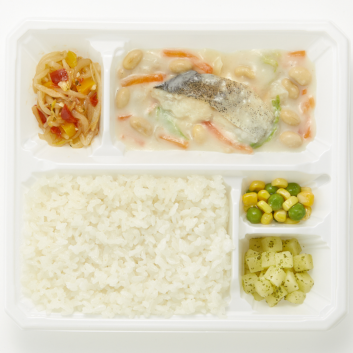 | 原材料名 | 米、緑豆もやし、助宗たら、大豆水煮、白菜、ホワイトソース、じゃがいも、玉ねぎ、人参、牛乳、植物油、グリーンピース、コーン、赤ピーマン、黄ピーマン、オリーブ油、清酒風調味料、食塩、刻みにんにく、コンソメ、バターソース、バジルペースト、醤油、こしょう、パセリ/加工デンプン、増粘剤(加工デンプン、増粘多糖類)、調味料(アミノ酸等)、トレハロース、pH調整剤、塩化Ca、着色料(カラメル、クチナシ)、乳化剤、リン酸塩(Na)、酸味料、香料、香辛料抽出物、(一部に小麦・乳成分・大豆・鶏肉を含む) | ||
