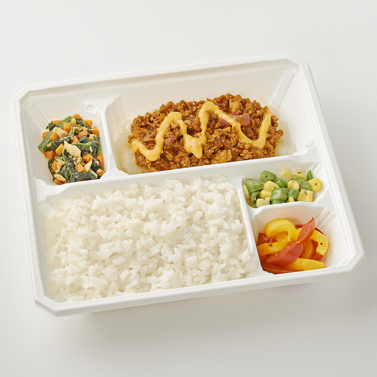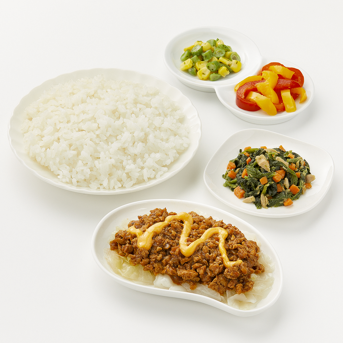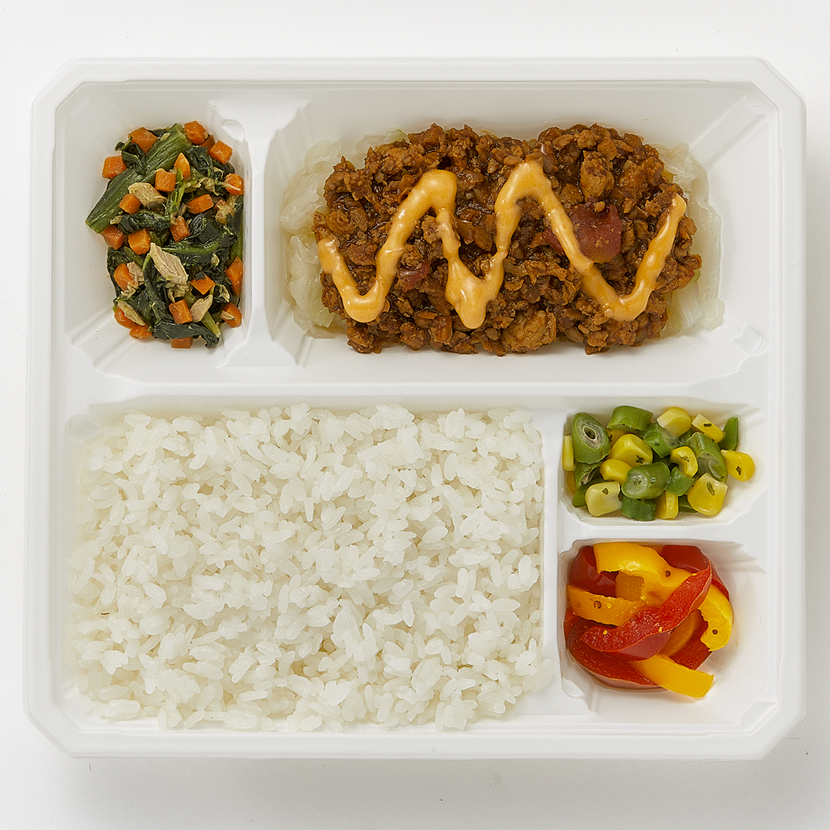 | 原材料名 | 米、キャベツ、鶏肉、玉ねぎ、ほうれん草、黄ピーマン、赤ピーマン、トマト加工品、ウスターソース、植物油、人参、コーン、いんげん、粒状大豆たん白、牛乳、乳等を主要原料とする食品、ツナフレーク、バターソース、ハニーマスタードソース、穀物酢、チリパウダー、にんにく加工品、辛口調味料、砂糖、コンソメ、食塩、ゼラチン、こしょう、パセリ/増粘剤(加工デンプン、増粘多糖類)、加工デンプン、調味料(アミノ酸等)、pH調整剤、グリシン、乳化剤、カゼインNa、酢酸Na、着色料(カラメル、ウコン、クチナシ、カロチノイド)、ソルビット、香料、リン酸Ca、酸味料、アンモニウムミョウバン、香辛料抽出物、(一部に小麦・卵・乳成分・牛肉・大豆・鶏肉・豚肉・りんご・ゼラチンを含む) | ||