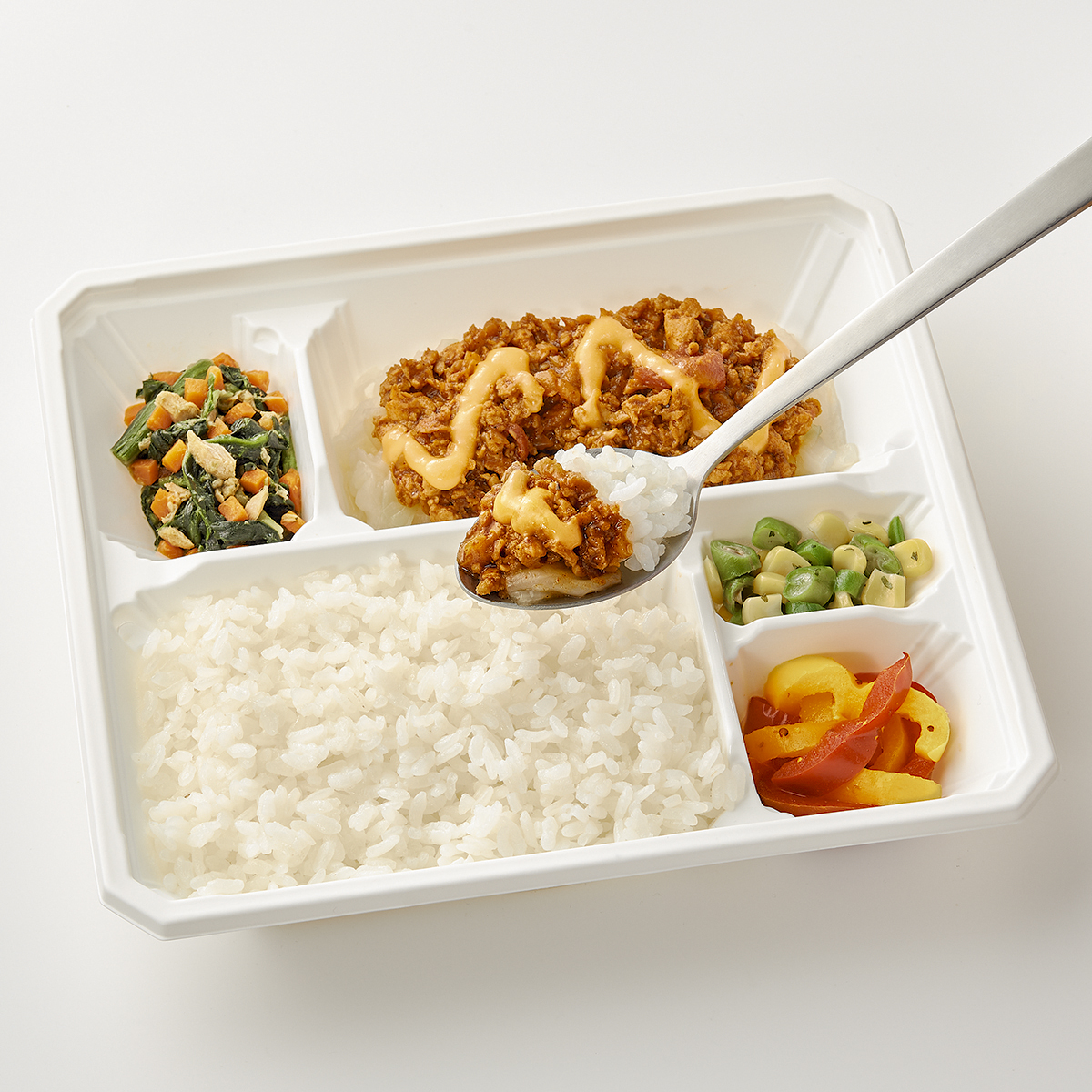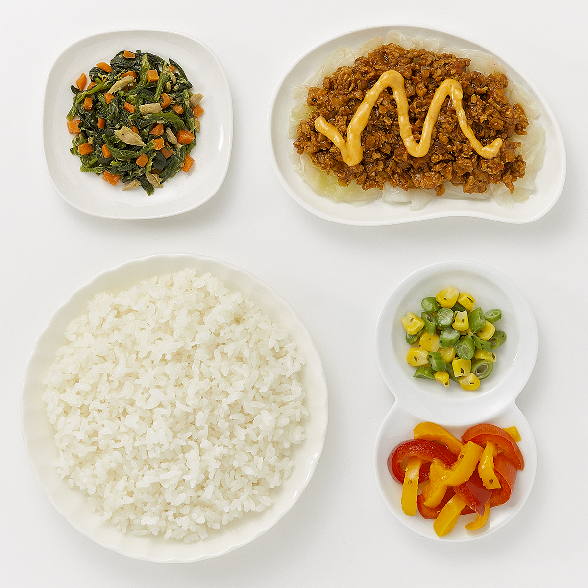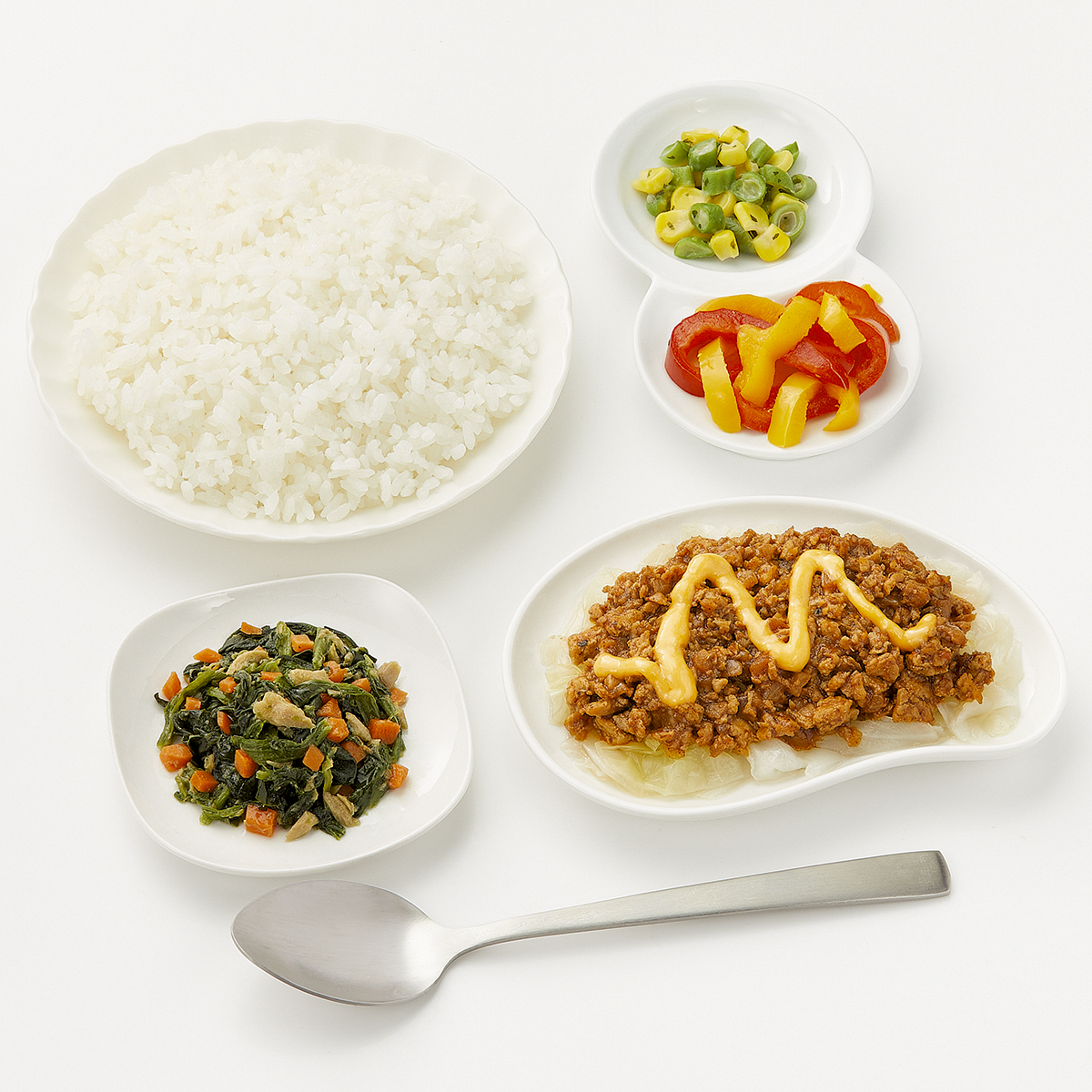 | 原材料名 | 米、キャベツ、鶏肉、玉ねぎ、ほうれん草、黄ピーマン、赤ピーマン、トマト加工品、ウスターソース、植物油、人参、コーン、いんげん、粒状大豆たん白、牛乳、乳等を主要原料とする食品、ツナフレーク、バターソース、ハニーマスタードソース、穀物酢、チリパウダー、にんにく加工品、辛口調味料、砂糖、コンソメ、食塩、ゼラチン、こしょう、パセリ/増粘剤(加工デンプン、増粘多糖類)、加工デンプン、調味料(アミノ酸等)、pH調整剤、グリシン、乳化剤、カゼインNa、酢酸Na、着色料(カラメル、ウコン、クチナシ、カロチノイド)、ソルビット、香料、リン酸Ca、酸味料、アンモニウムミョウバン、香辛料抽出物、(一部に小麦・卵・乳成分・牛肉・大豆・鶏肉・豚肉・りんご・ゼラチンを含む) | ||