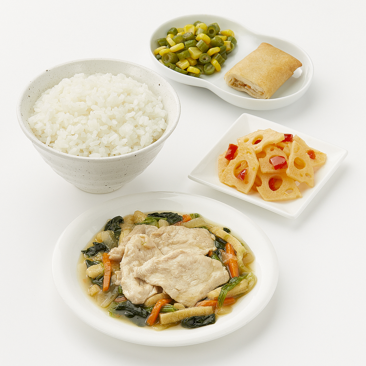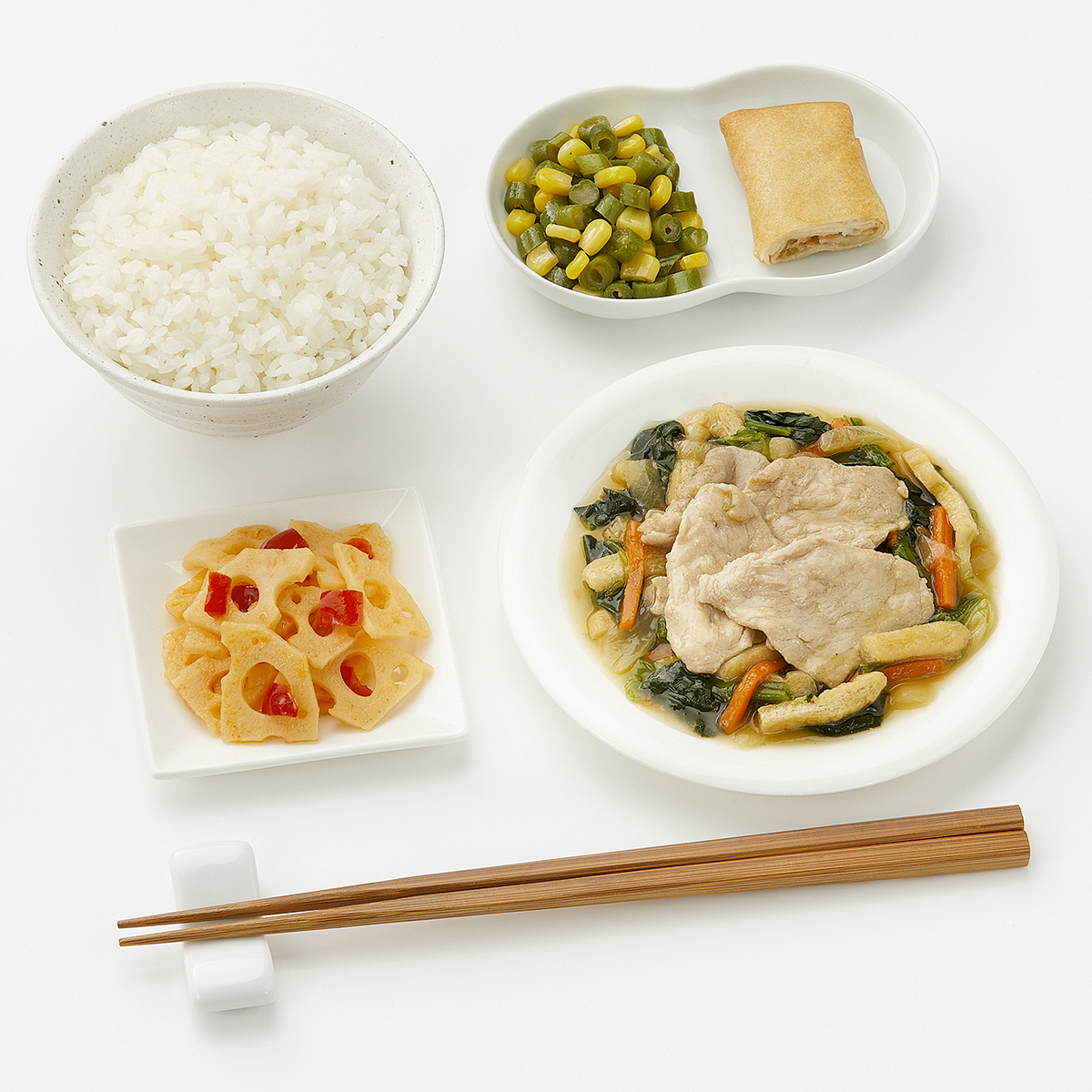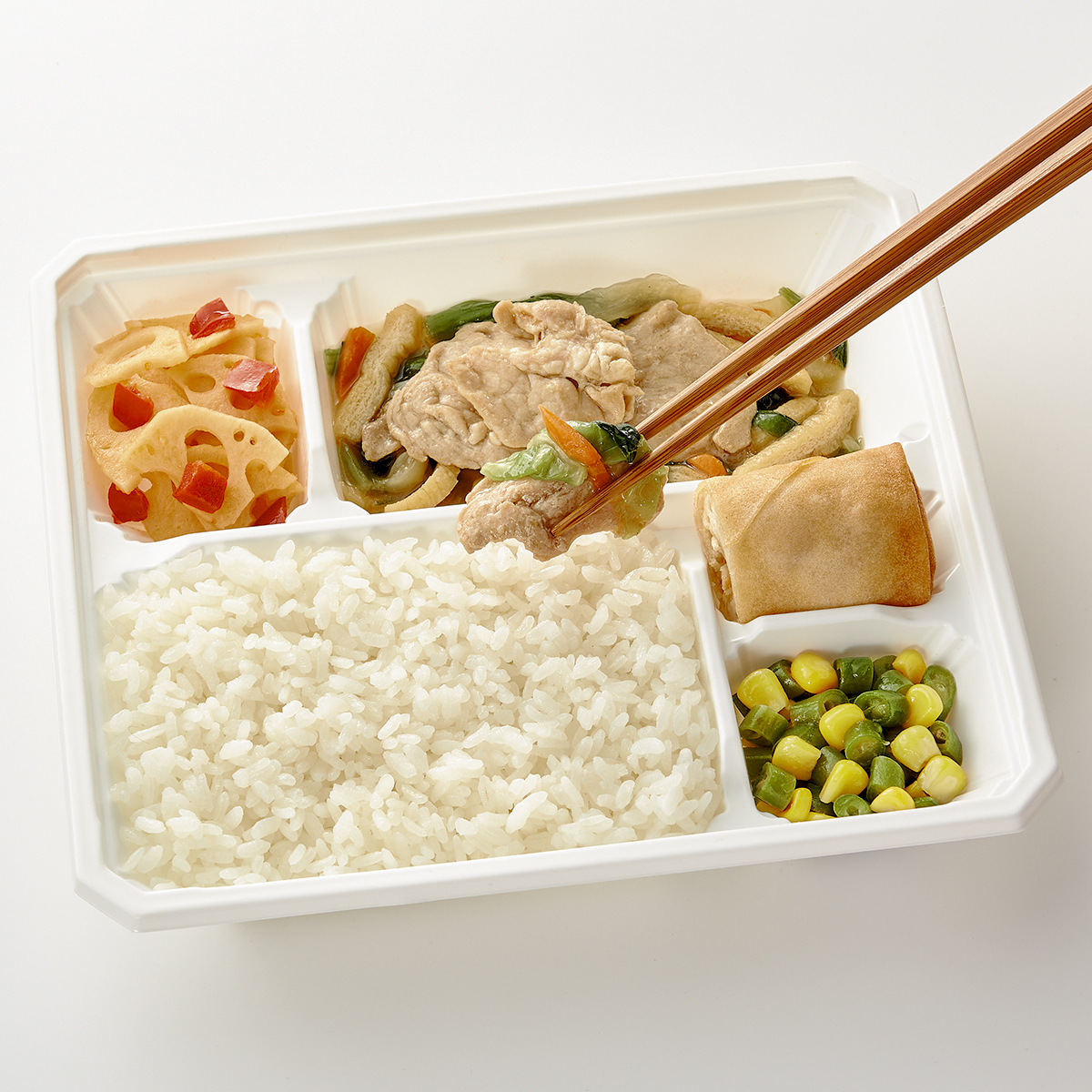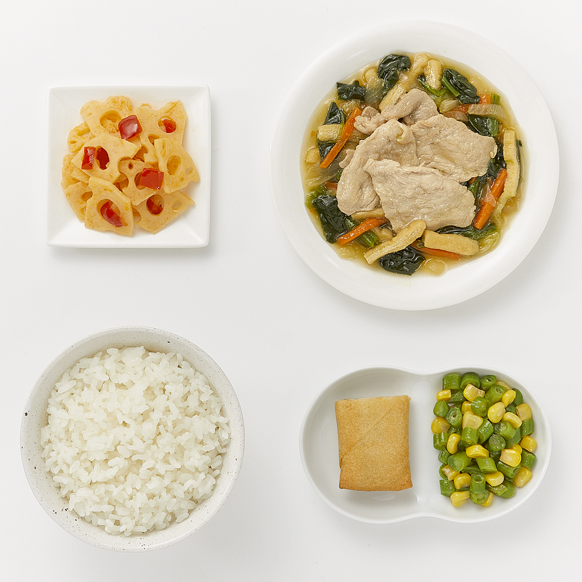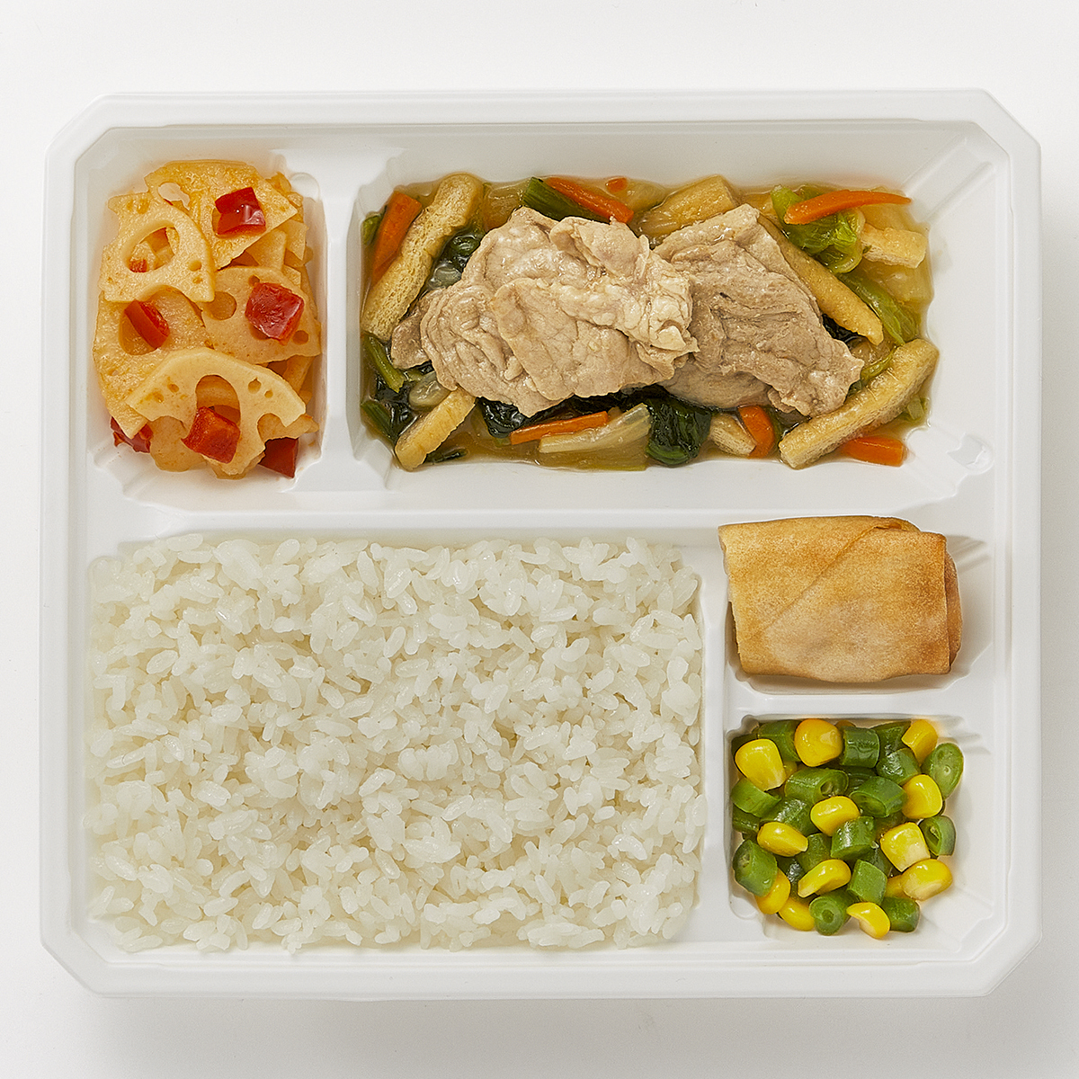 | 原材料名 | 米、れんこん水煮、豚肉、白菜、春巻(キャベツ、小麦粉、人参、その他)、いんげん、ほうれん草、コーン、植物油、赤ピーマン、玉ねぎ、醤油、油揚げ、人参、みりん、清酒風調味料、バターソース、ゼラチン、砂糖、おろししょうが、かつお節調味料/増粘剤(加工デンプン、増粘多糖類)、加工デンプン、調味料(アミノ酸等)、酸化防止剤(V.C)、pH調整剤、メタリン酸Na、香料、酸味料、乳化剤、クチナシ色素、漂白剤(次亜硫酸Na)、ミョウバン、(一部に小麦・乳成分・大豆・豚肉・ゼラチンを含む) | ||