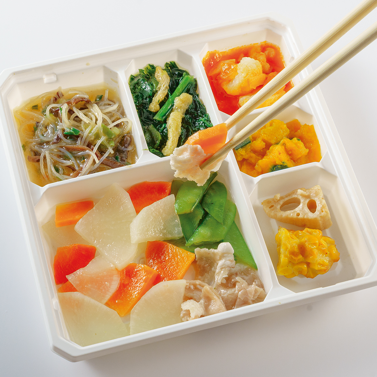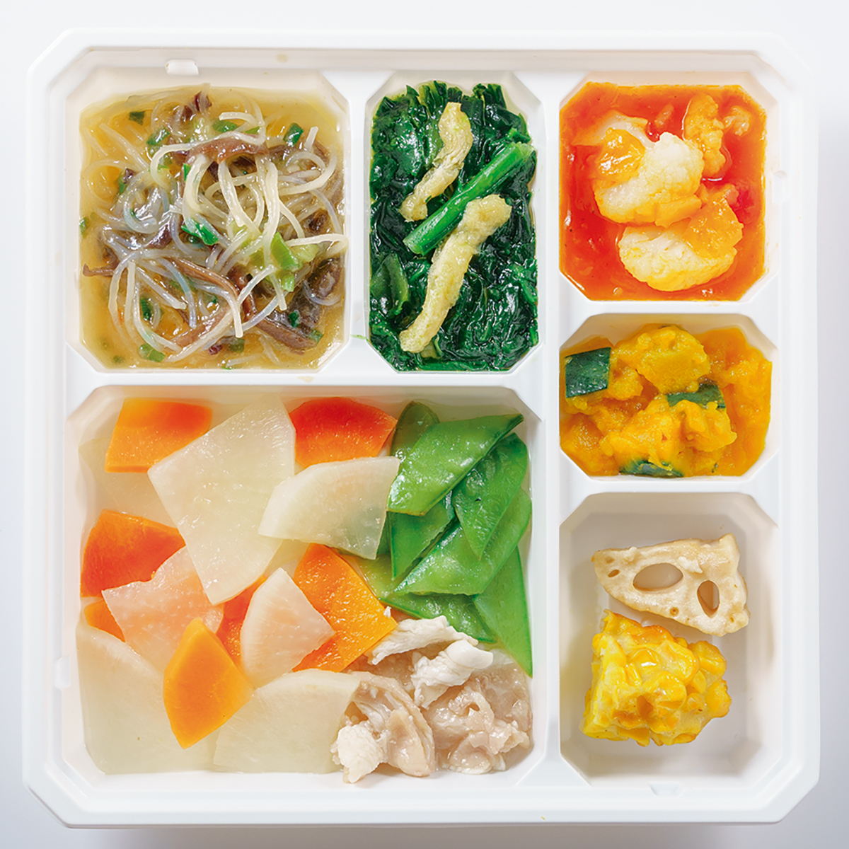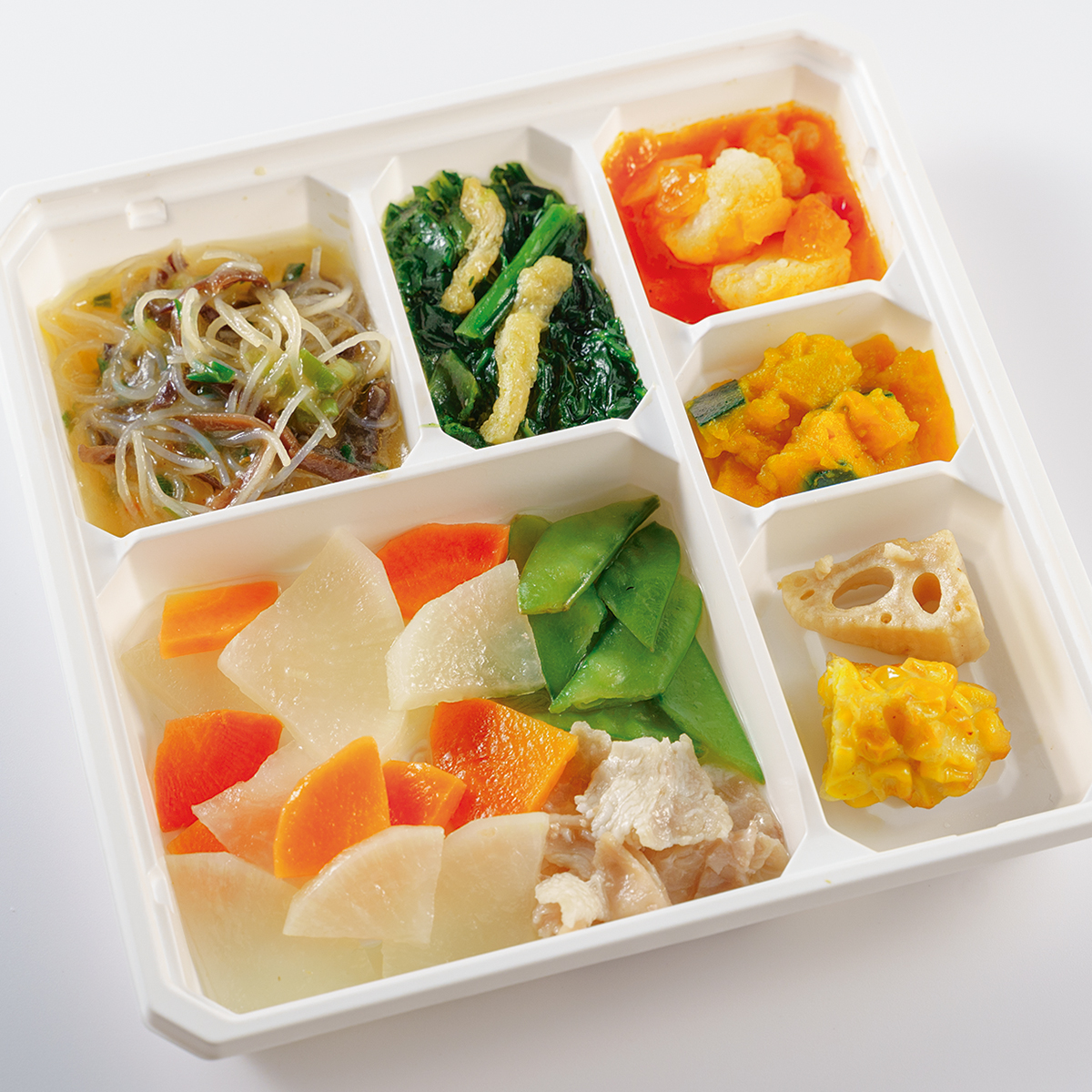 | 原材料名 | 大根(国産)、小松菜、豚肉、人参、れんこん、なたね油、コーン入り魚肉すり身、かぼちゃ、カリフラワー、トマト・ピューレー漬、きぬさや、ねぎ、春雨、和風調味液、油揚げ、淡口醤油、玉ねぎ、発酵調味料、清酒、食塩、濃口醤油、白だし、砂糖、鶏肉、減塩醤油、オイスターソース、おろし生姜、生姜、乾燥きくらげ、みそ、果実調味料、おろしにんにく、顆粒和風だし、トウバンジャン、本みりん、こしょう/増粘剤(加工でん粉、増粘多糖類)、調味料(アミノ酸等)、酒精、pH調整剤、加工でん粉、甘味料(アスパルテーム・L-フェニルアラニン化合物)、着色料(クチナシ)、酸味料、(一部に小麦・卵・乳成分・さば・大豆・鶏肉・豚肉を含む) | ||