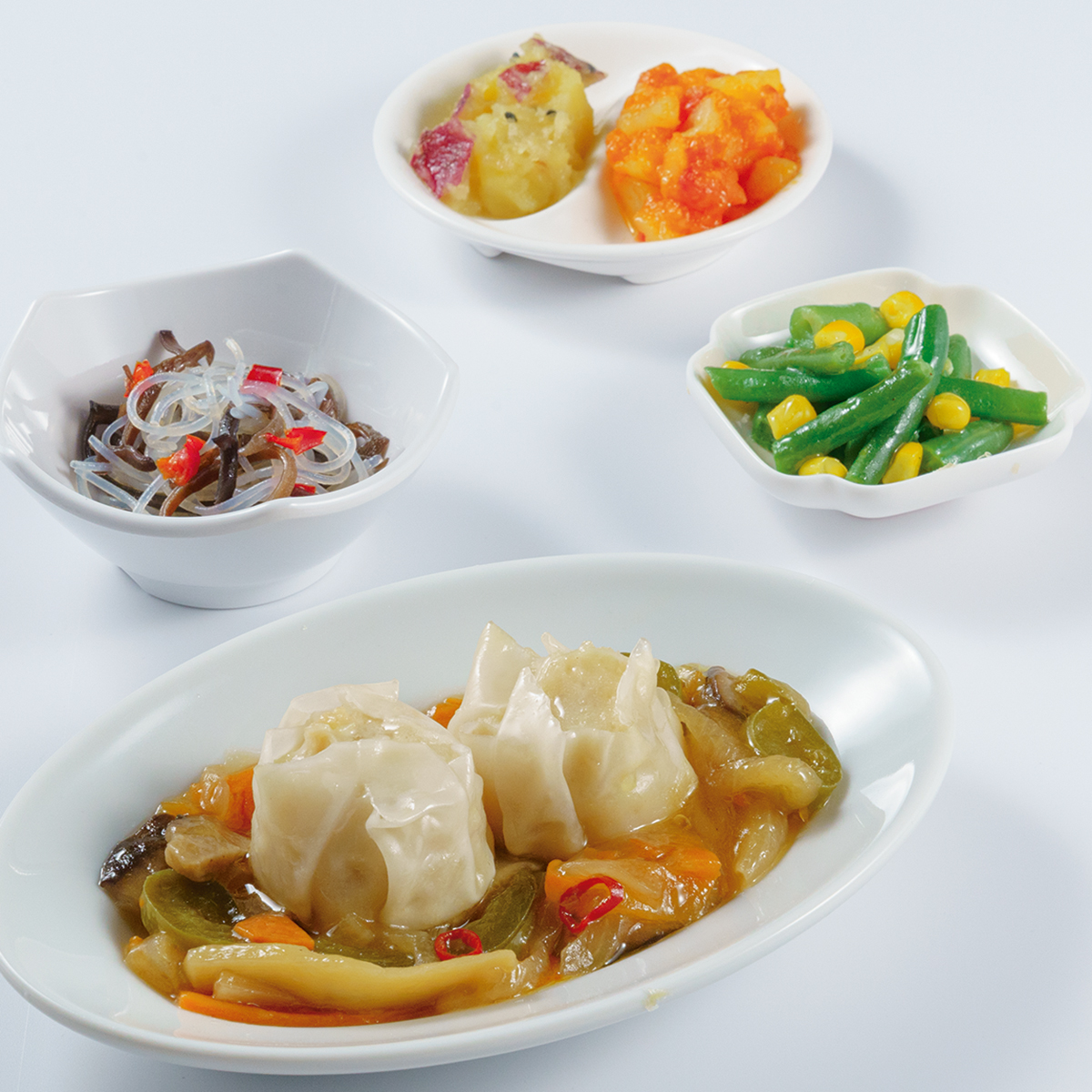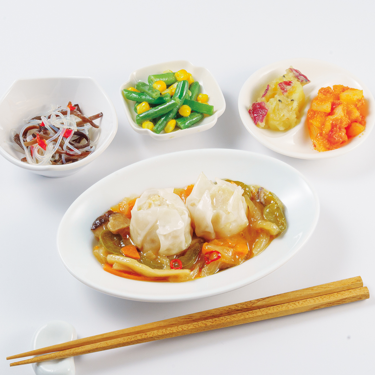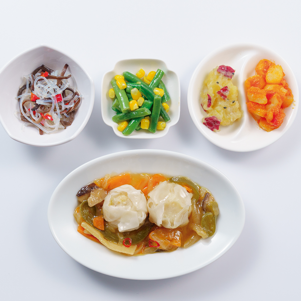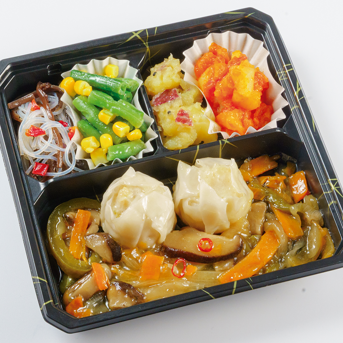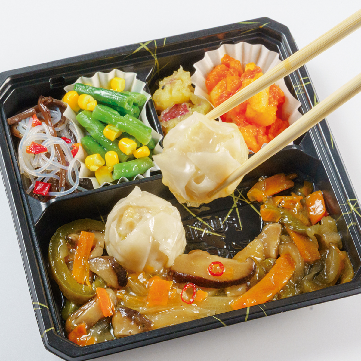 | 原材料名 | 海鮮シュウマイ(キャベツ、小麦粉、玉ねぎ、加工油脂、たらすり身、大豆たん白、パン粉、でん粉、いか、その他)(国内製造)、さやいんげん、じゃがいも、しいたけ、玉ねぎ、なたね油、たけのこ水煮、ピーマン、さつまいも、人参、さつまいもフィリング、コーン、砂糖、トマト・ピューレー漬、赤ピーマン、春雨、濃口醤油、醸造酢、清酒、ケチャップ、本みりん、トマトペースト、乾燥きくらげ、ごま油、食塩、顆粒洋風だし、ごま、おろしにんにく、顆粒中華風だし、こしょう、ゼラチン、唐辛子/増粘剤(加工でん粉、増粘多糖類)、調味料(アミノ酸等)、グリシン、加工でん粉、ソルビット、酢酸Na、膨張剤、pH調整剤、酸味料、香料、着色料(カロチノイド)、(一部にかに・小麦・卵・乳成分・いか・牛肉・ごま・大豆・鶏肉・豚肉・ゼラチンを含む) | ||