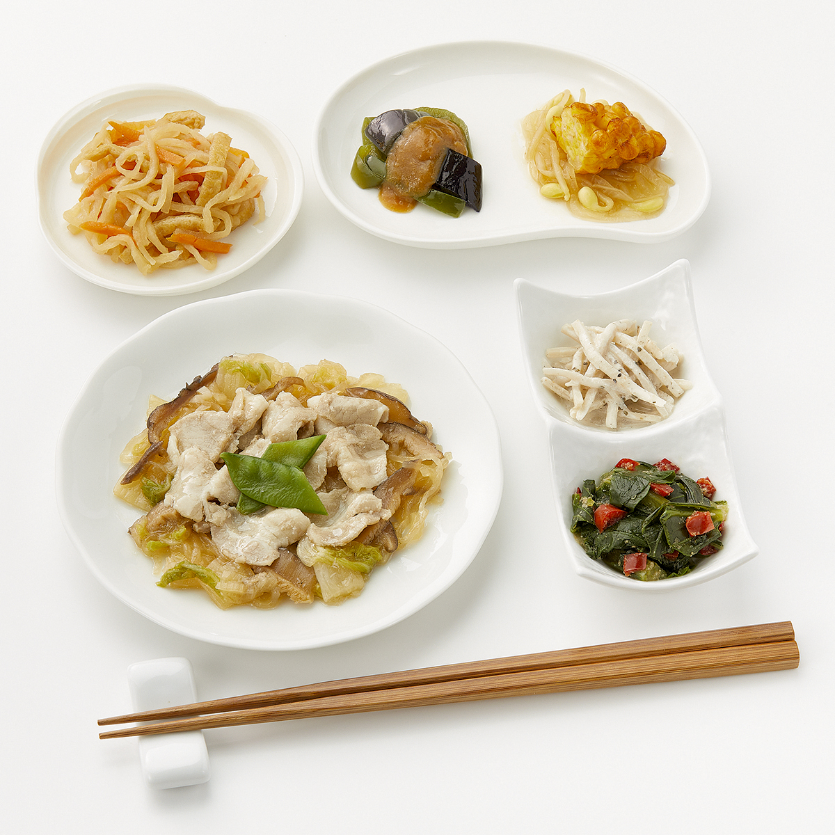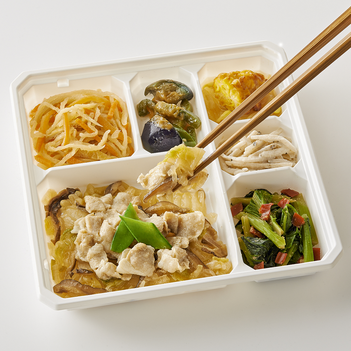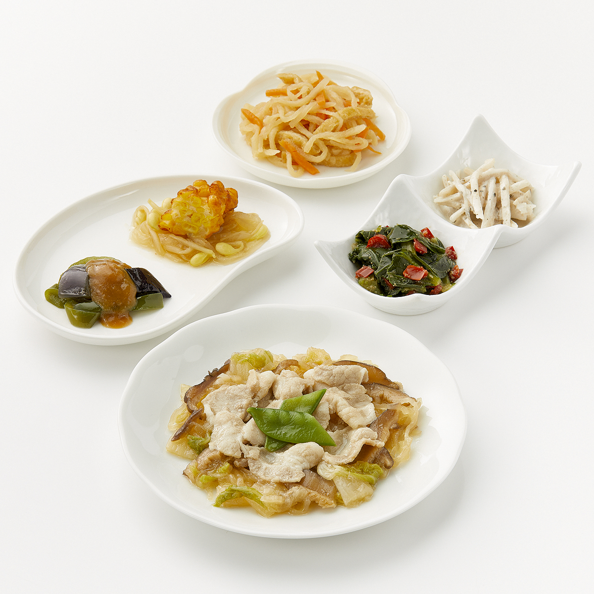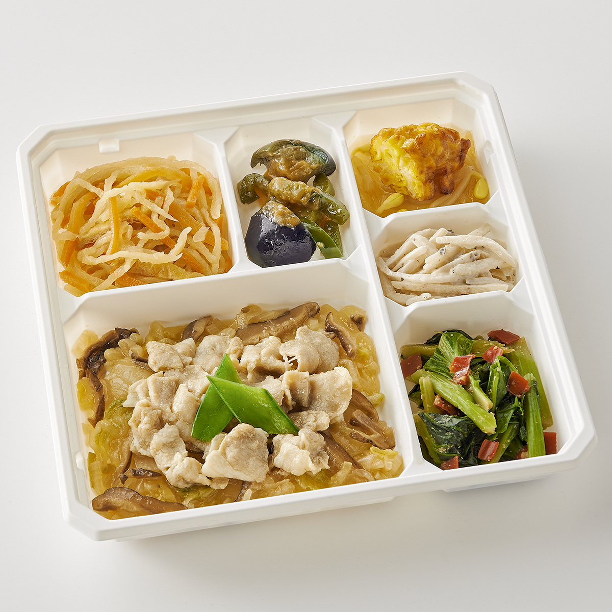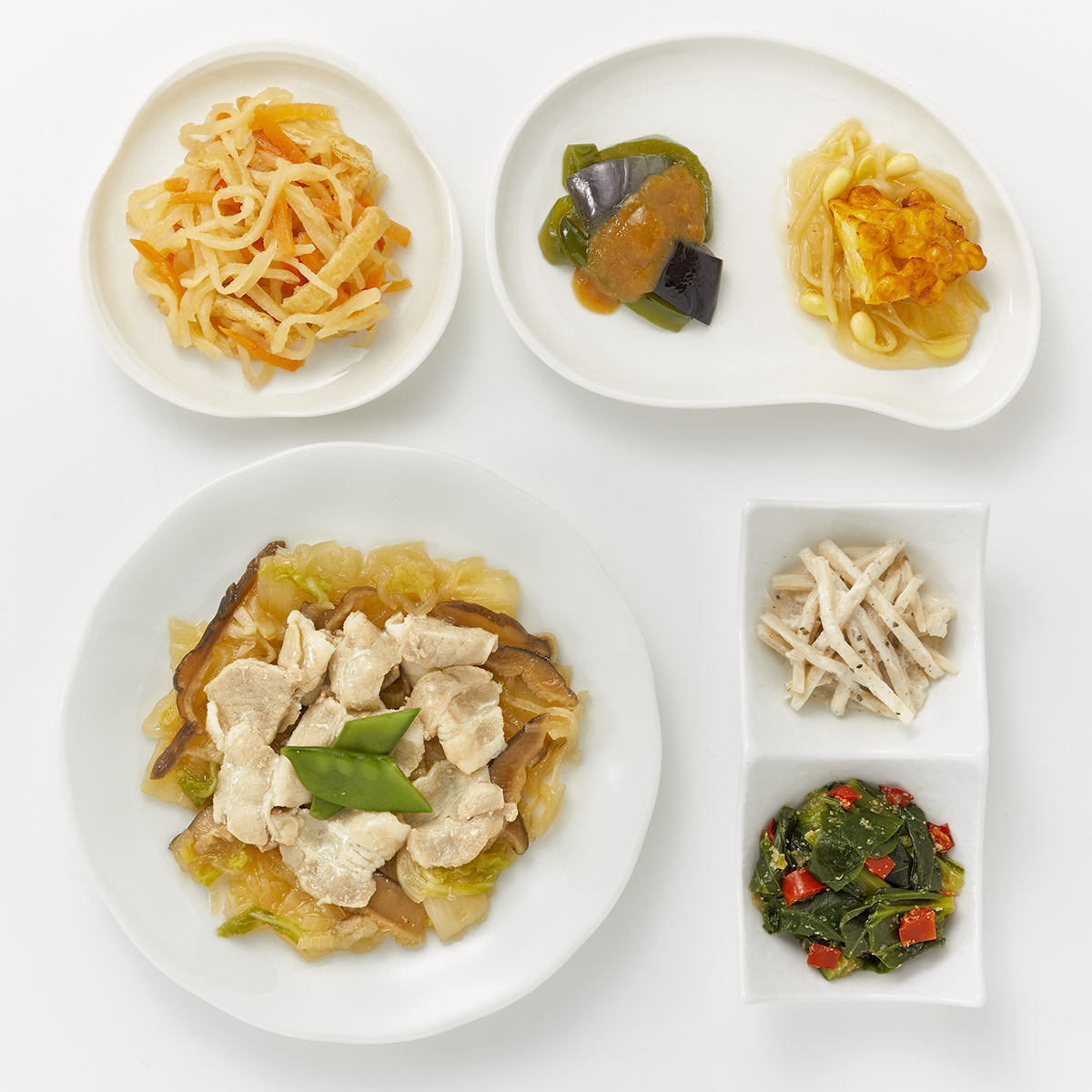 | 原材料名 | 白菜(国産)、豚肉、小松菜、しらたき、ごぼう、コーン入り魚肉すり身、なたね油、揚げなす、ねぎ、濃口醤油、人参、大豆もやし、ピーマン、玉ねぎ、きぬさや、砂糖、赤ピーマン、油揚げ、乾燥しいたけ、マヨネーズ風ソース(加工油脂、鶏卵、醸造酢、その他)、切干大根、塩こうじ、発酵調味料、みそ、しそ入り調味梅肉、すりごま、清酒、食塩、ごま油、顆粒和風だし、乾燥味付赤しそ/糊料(加工でん粉)、調味料(アミノ酸等)、加工でん粉、水酸化Ca、酸味料、着色料(クチナシ、野菜色素)、甘味料(アスパルテーム・L-フェニルアラニン化合物、ステビア)、V.B1、(一部に小麦・卵・乳成分・ごま・大豆・豚肉・りんご・ゼラチンを含む) | ||