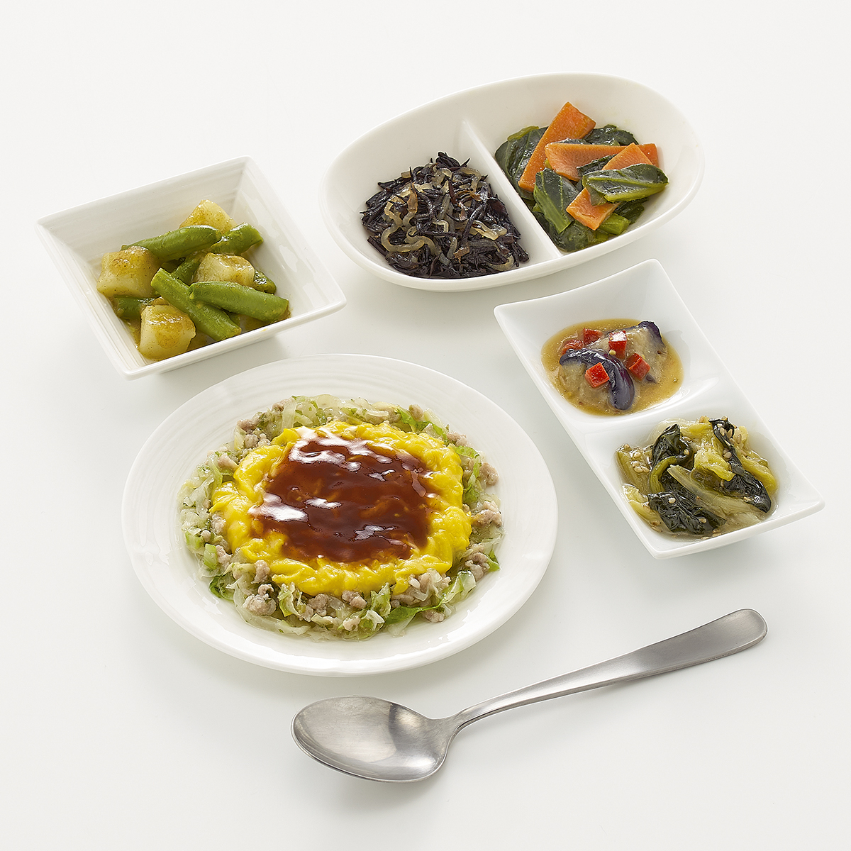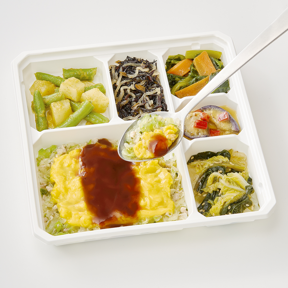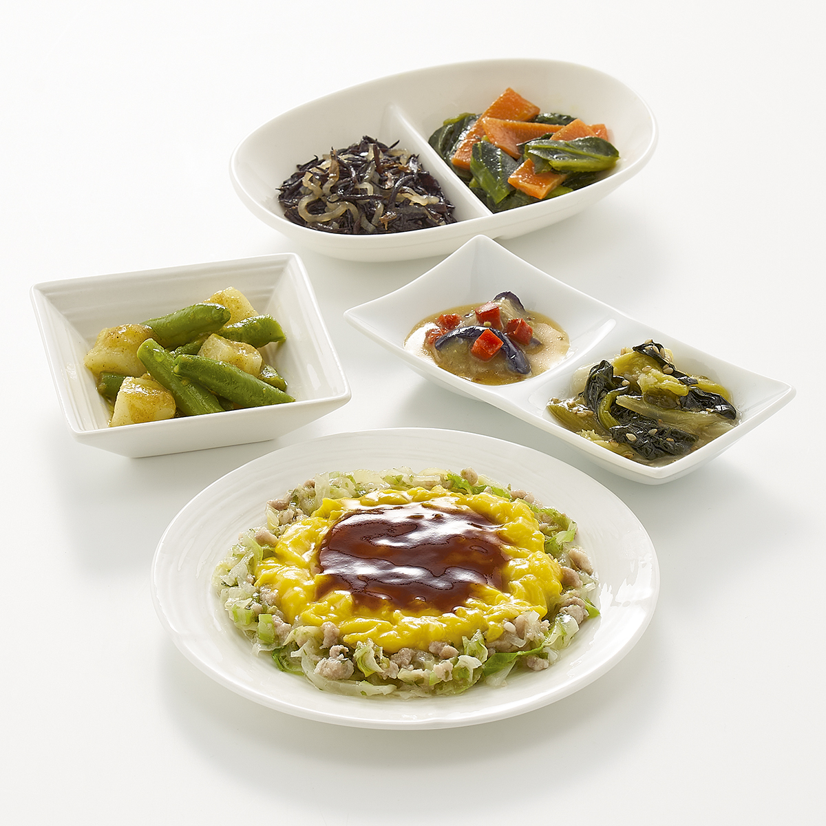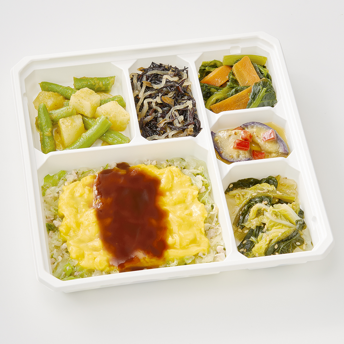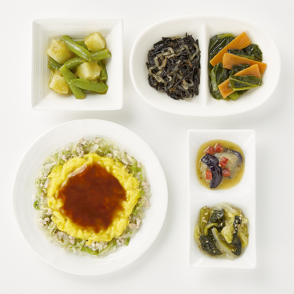 | 原材料名 | キャベツ、スクランブルエッグ、サヤインゲン、小松菜、じゃがいも、白菜、なたね油、豚肉、濃厚ソース、素揚げなす、白滝、ほうれん草、人参、濃口醤油、赤ピーマン、はちみつ入り粒マスタードソース、清酒、砂糖、ねりからし、乾燥ひじき、本みりん、煎り白ごま、醸造酢、ごま油、食塩、顆粒和風だし、淡口醤油、あおさ粉、カレー粉、かつお削りぶし、オリーブオイル、山椒、白こしょう/糊料(加工デンプン、増粘多糖類)、加工デンプン、調味料(アミノ酸等)、ピロリン酸Na、水酸化Ca、着色料(ウコン、カロチノイド)、酸味料、香辛料、香料、(一部に小麦・卵・乳成分・ごま・大豆・鶏肉・豚肉・りんごを含む) | ||
