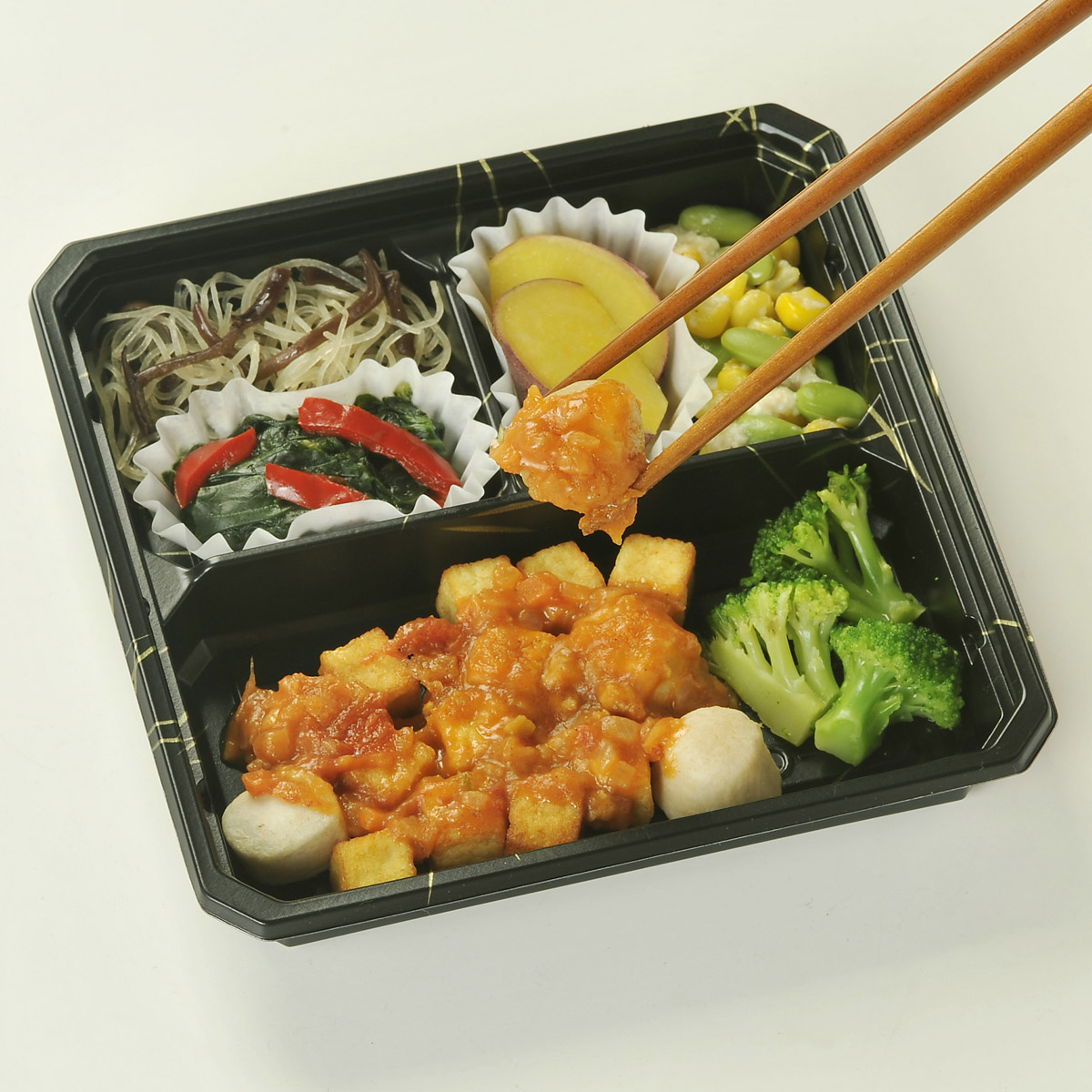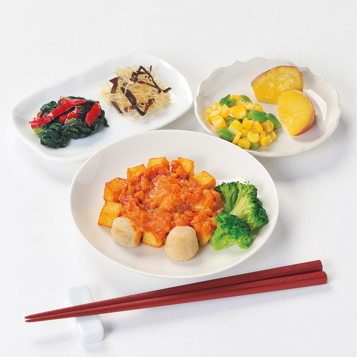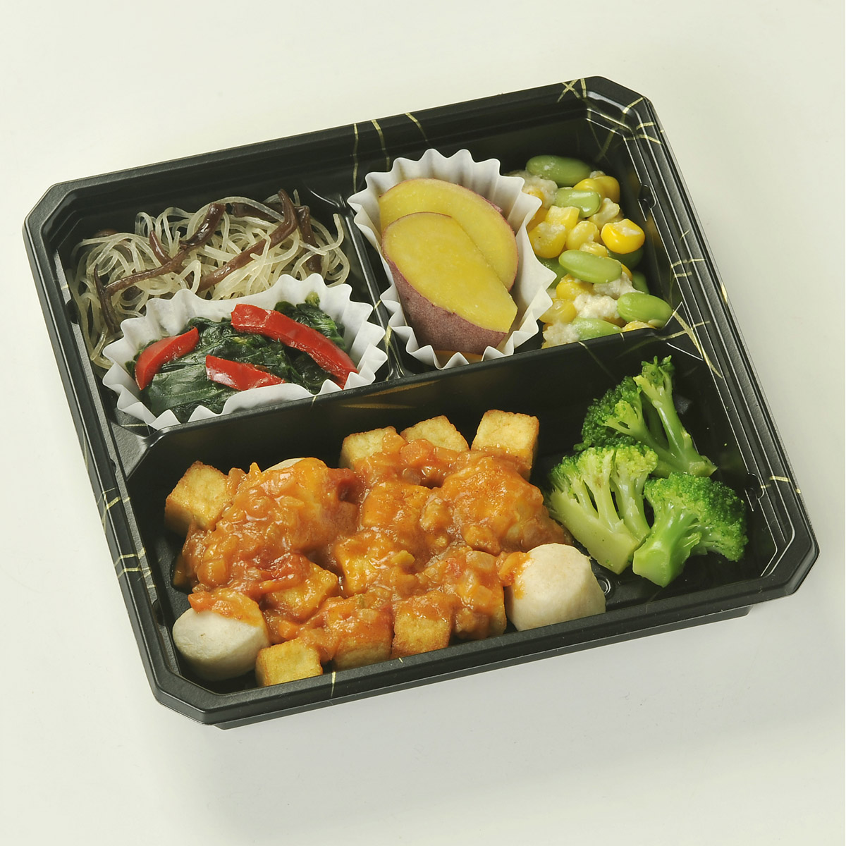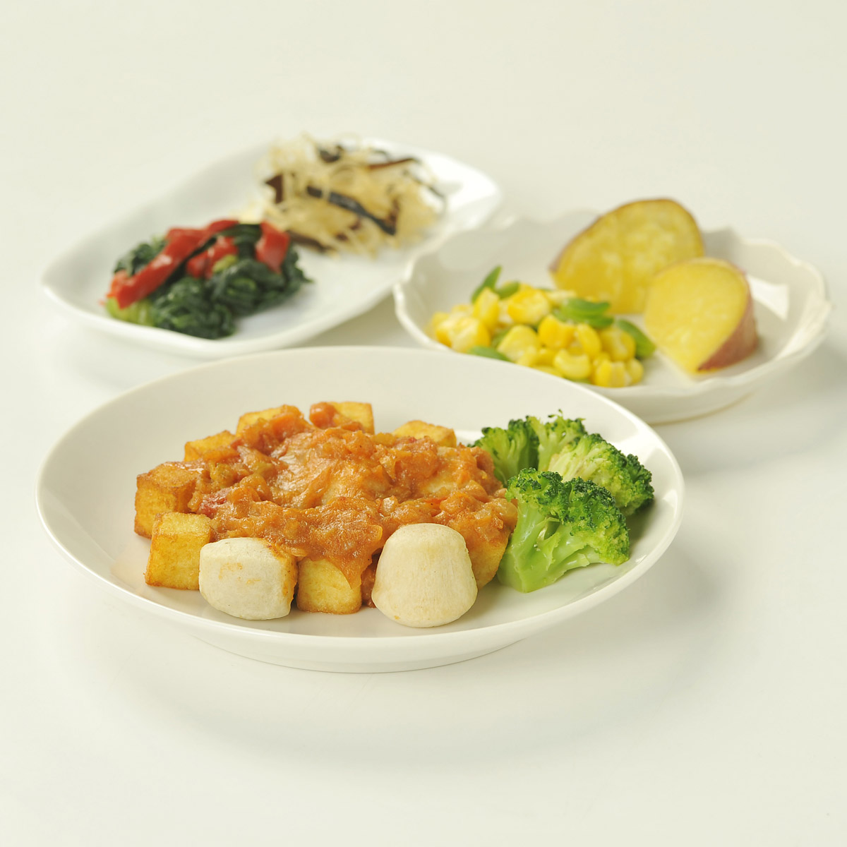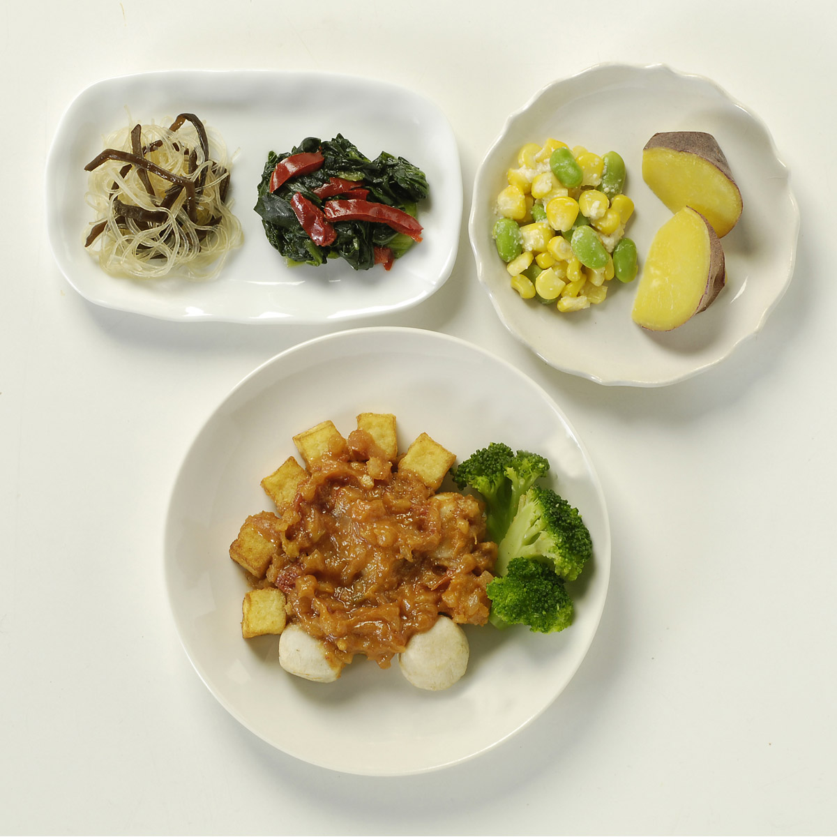 | 原材料名 | さといも、厚揚げ、さつまいも、チンゲン菜、ブロッコリー、玉ねぎ、白和えの素(豆腐、米味噌、砂糖、その他)、調理油、赤ピーマン、トマトピューレー、砂糖、コーン、枝豆、なたね油、牛脂、春雨、トマト・ピューレー漬、ケチャップ、豚肉、レモンジュース、人参、濃口醤油、乳等を主要原料とする食品、赤ワイン、セロリ、ごま油、清酒、乾燥きくらげ、顆粒洋風だし、バター、エキス調味料、濃厚ソース、デミグラスソース、減塩醤油、にんにく、食塩、大豆油、本みりん、顆粒和風だし、黒こしょう、顆粒中華風だし/糊料(加工デンプン、増粘多糖類)、調味料(アミノ酸等)、トレハロース、凝固剤、カラメル色素、酒精、カゼインNa、乳化剤、香料、pH調整剤、酸味料、(一部に小麦・乳成分・牛肉・ごま・大豆・鶏肉・豚肉・りんご・ゼラチンを含む) | ||