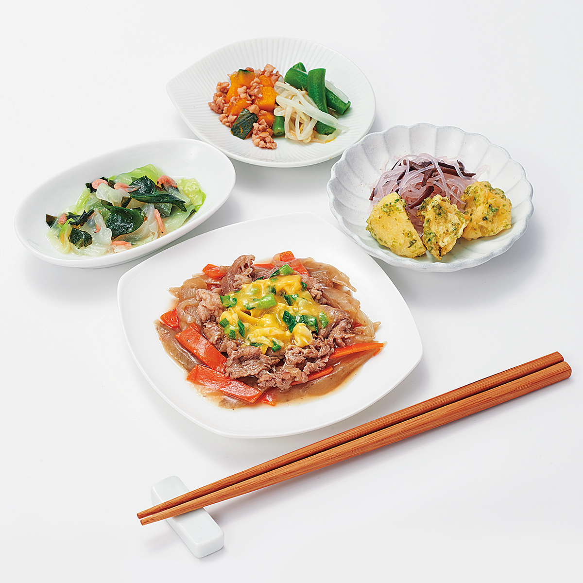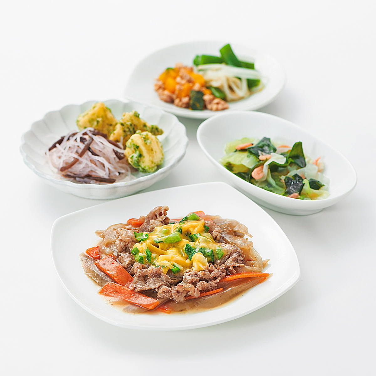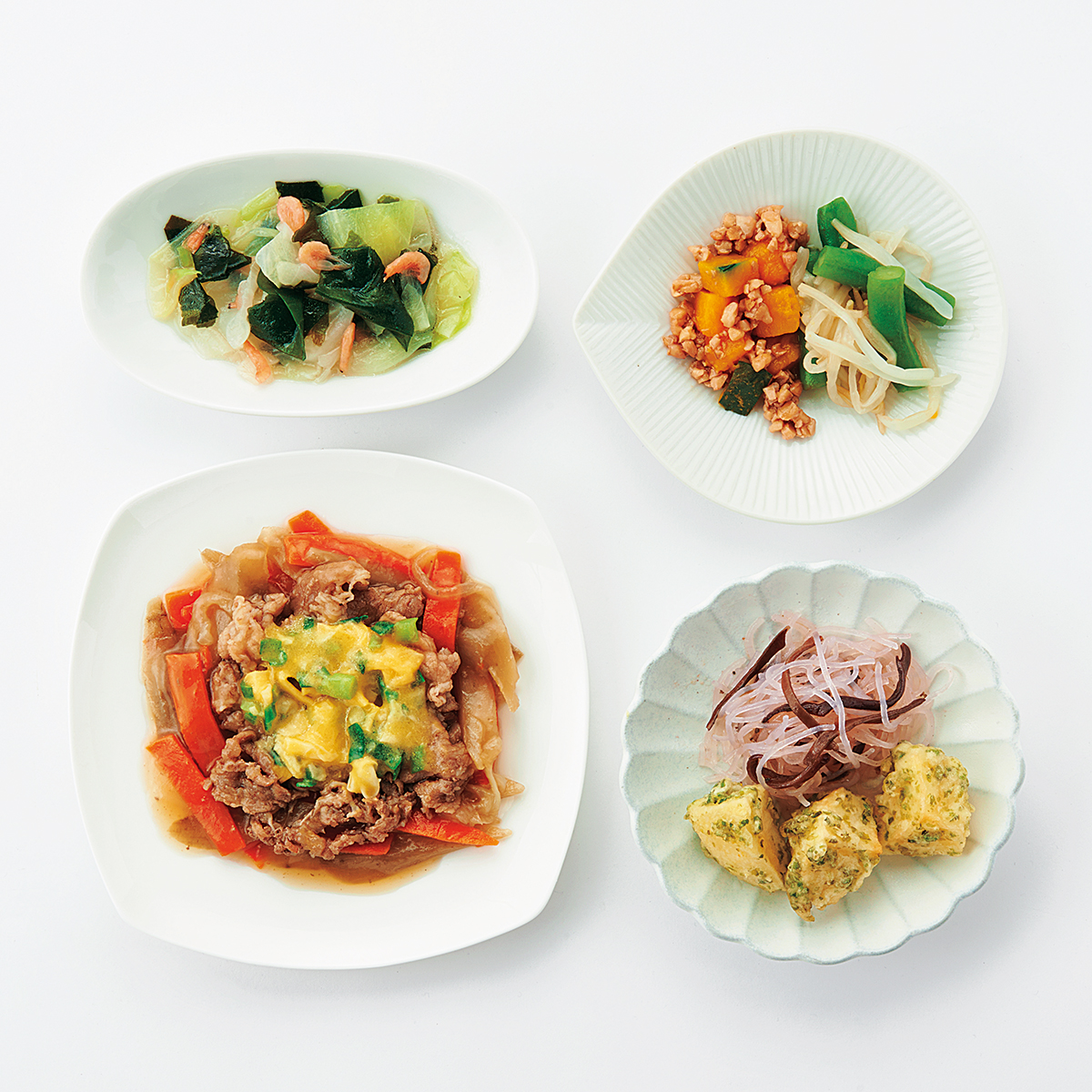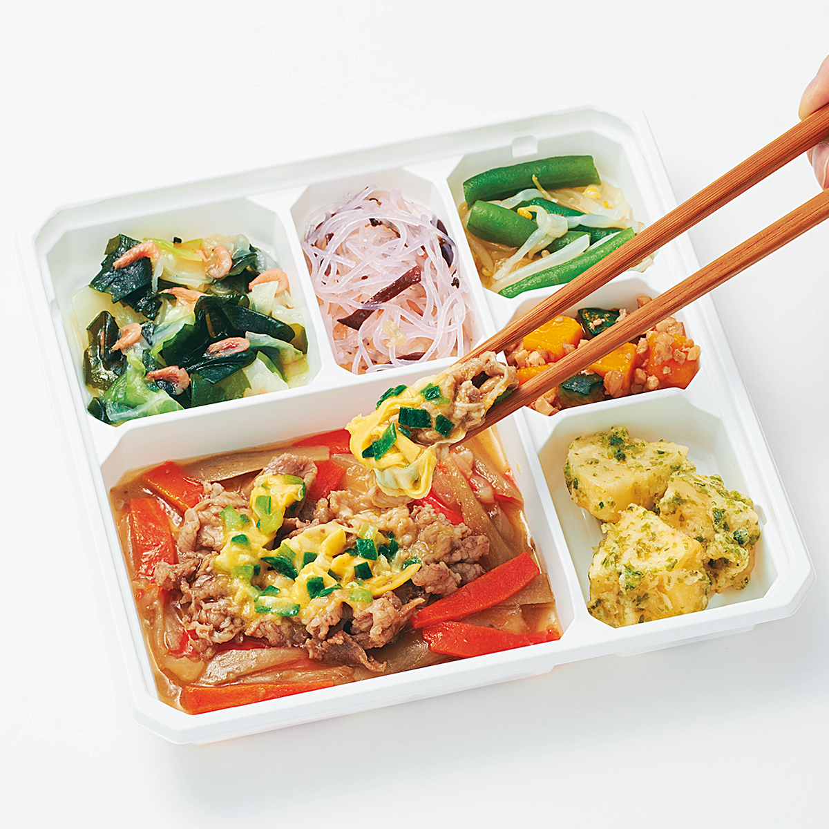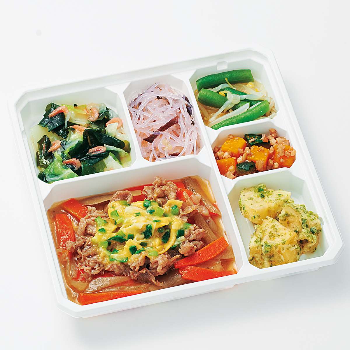| 原材料名 | じゃがいも(国産)、牛肉、キャベツ、もやし、玉ねぎ、ごぼう、なたね油、人参、さやいんげん、かぼちゃ、スクランブルエッグ、天ぷら粉、濃口醤油、砂糖、春雨、にら、くるみ、しそ入り調味梅肉、発酵調味料、清酒、顆粒和風だし、乾燥わかめ、白醤油、果実調味料、乾燥小えび、乾燥きくらげ、食塩、あおさ、乾燥味付赤しそ/加工でん粉、増粘剤(加工でん粉、増粘多糖類)、調味料(アミノ酸等)、膨脹剤、pH調整剤、着色料(クチナシ、紅麹、野菜色素)、酸味料、ピロリン酸Na、マンニット、V.B1、甘味料(ステビア)、(一部にえび・くるみ・小麦・卵・牛肉・大豆を含む) | ||
