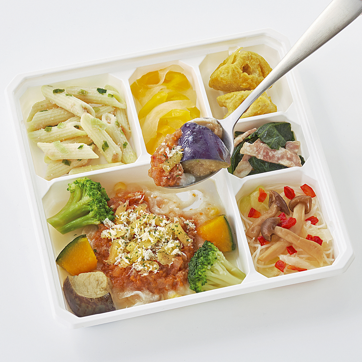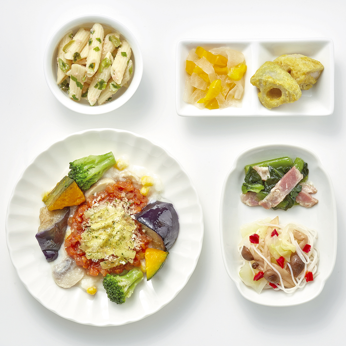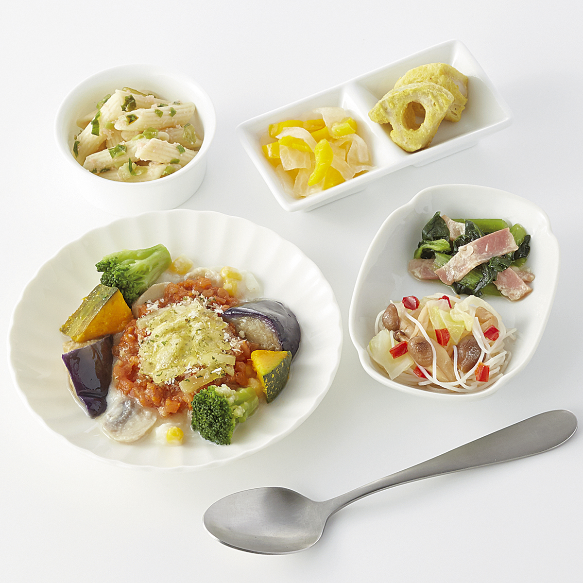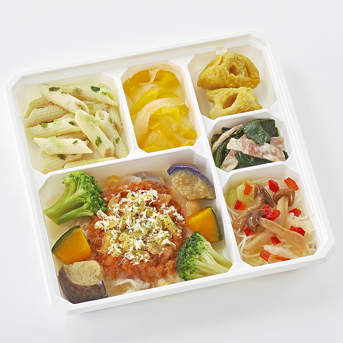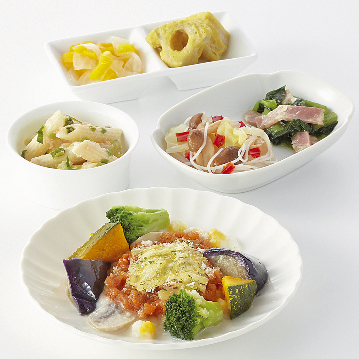 | 原材料名 | れんこん、素揚げなす、ブロッコリー、玉ねぎ、牛乳、ホワイトソース、大根、なたね油、かぼちゃ、黄ピーマン、ペンネ、チンゲン菜、ぶなしめじ水煮、キャベツ、ナチュラルチーズ、ねぎ、マッシュルーム、トマトピューレー、天ぷら粉、ショルダーベーコン、コーン、ビーフン、赤ピーマン、牛脂、トマト・ピューレー漬、ケチャップ、豚肉、人参、セロリ、食塩、たらこ、砂糖、顆粒洋風だし、パン粉、醸造酢、乳等を主要原料とする食品、赤ワイン、大豆油、バター、エキス調味料、濃厚ソース、デミグラスソース、減塩醤油、カレー粉、バターフレーバーオイル、本みりん、にんにく、ゼラチン、黒こしょう、パセリ粉、白こしょう/糊料(加工デンプン、CMC、増粘多糖類)、加工デンプン、調味料(アミノ酸等)、セルロース、リン酸塩(Na)、膨脹剤、着色料(カラメル、カロチノイド、紅麹、コチニール)、乳化剤、酢酸Na、酸化防止剤(V.C)、香料、酸味料、カゼインNa、香辛料、グリシン、pH調整剤、発色剤(亜硝酸Na)、(一部に小麦・卵・乳成分・牛肉・大豆・鶏肉・豚肉・りんご・ゼラチンを含む) | ||