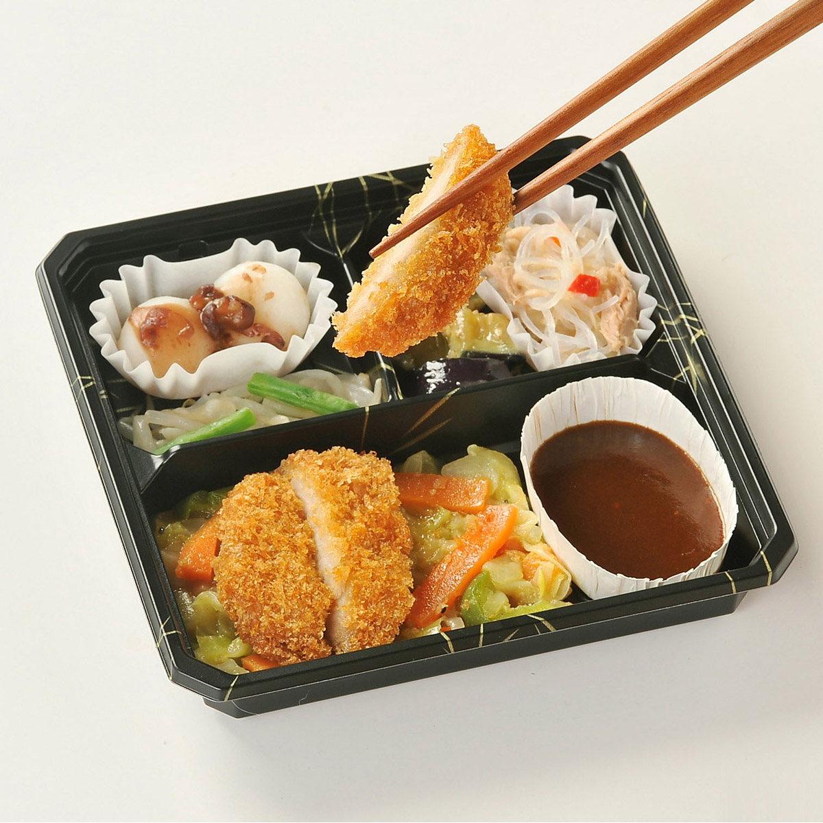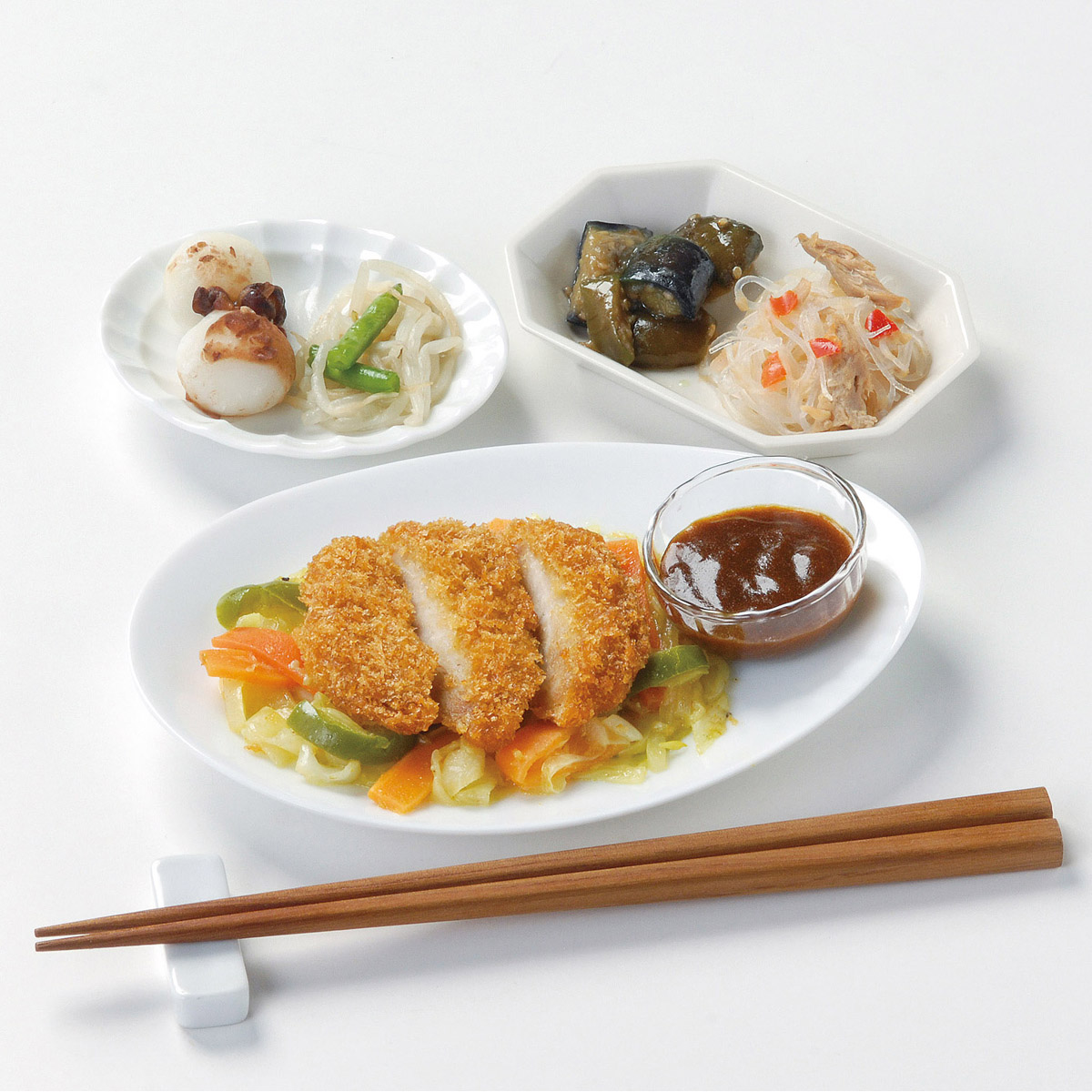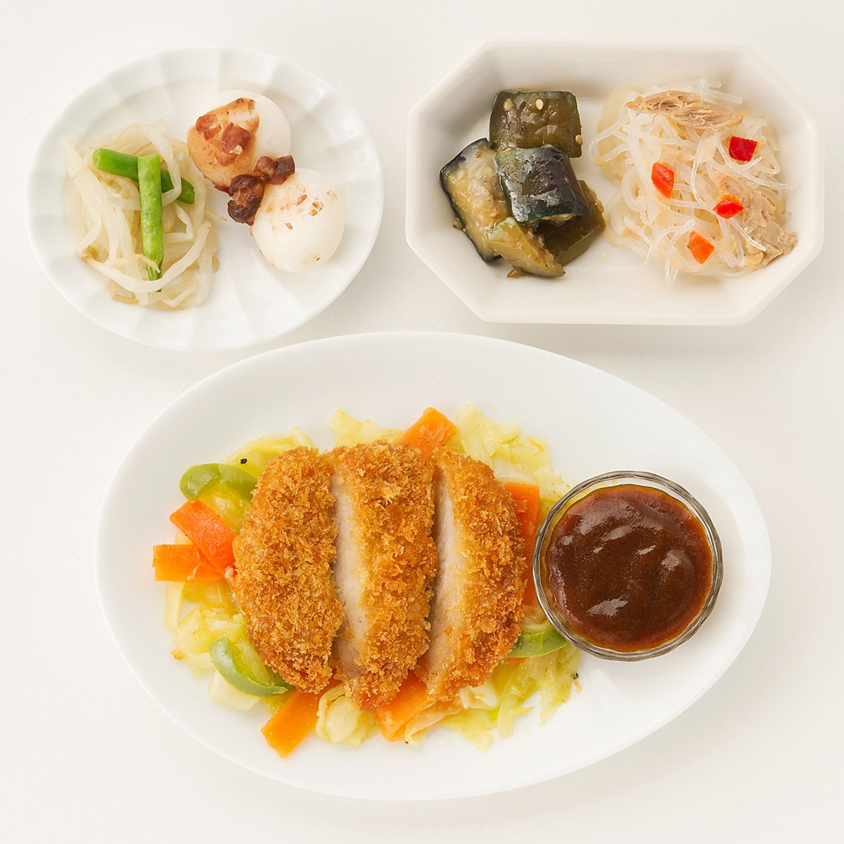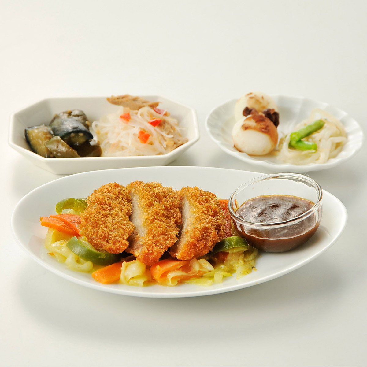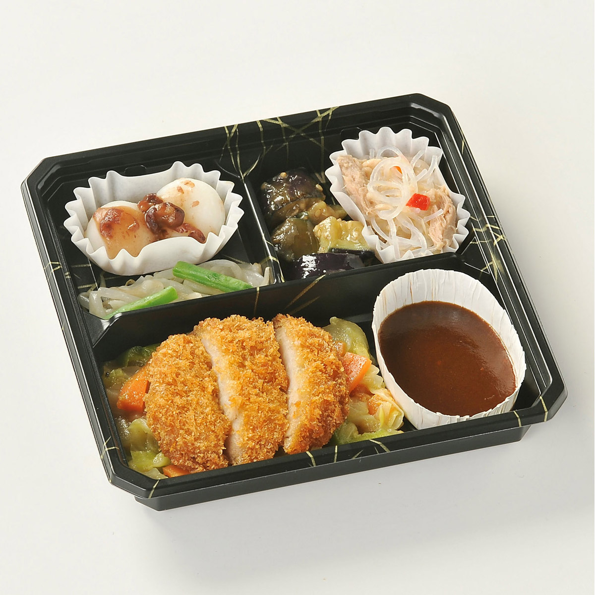 | 原材料名 | トンカツ、キャベツ、玉ねぎ、だんご(上新粉、でん粉)、素揚げなす、サヤインゲン、デミグラスソース、緑ピーマン、ゆであずき、もやし、人参、大豆油、なたね油、濃厚ソース、ツナフレーク、ショートニング、春雨、味噌、赤ピーマン、上白糖、本みりん、清酒、濃口醤油、煎り白ごま、おろしにんにく、醤油加工品、食塩、中華スープの素、顆粒洋風だし、カレー粉、三温糖、顆粒和風だし、黒こしょう、ごま油、白こしょう/糊料(加工デンプン、増粘多糖類)、調味料(アミノ酸等)、カラメル色素、カゼインNa、酸味料、乳化剤、(一部に小麦・卵・乳成分・牛肉・ごま・大豆・鶏肉・豚肉・りんご・ゼラチンを含む) | ||