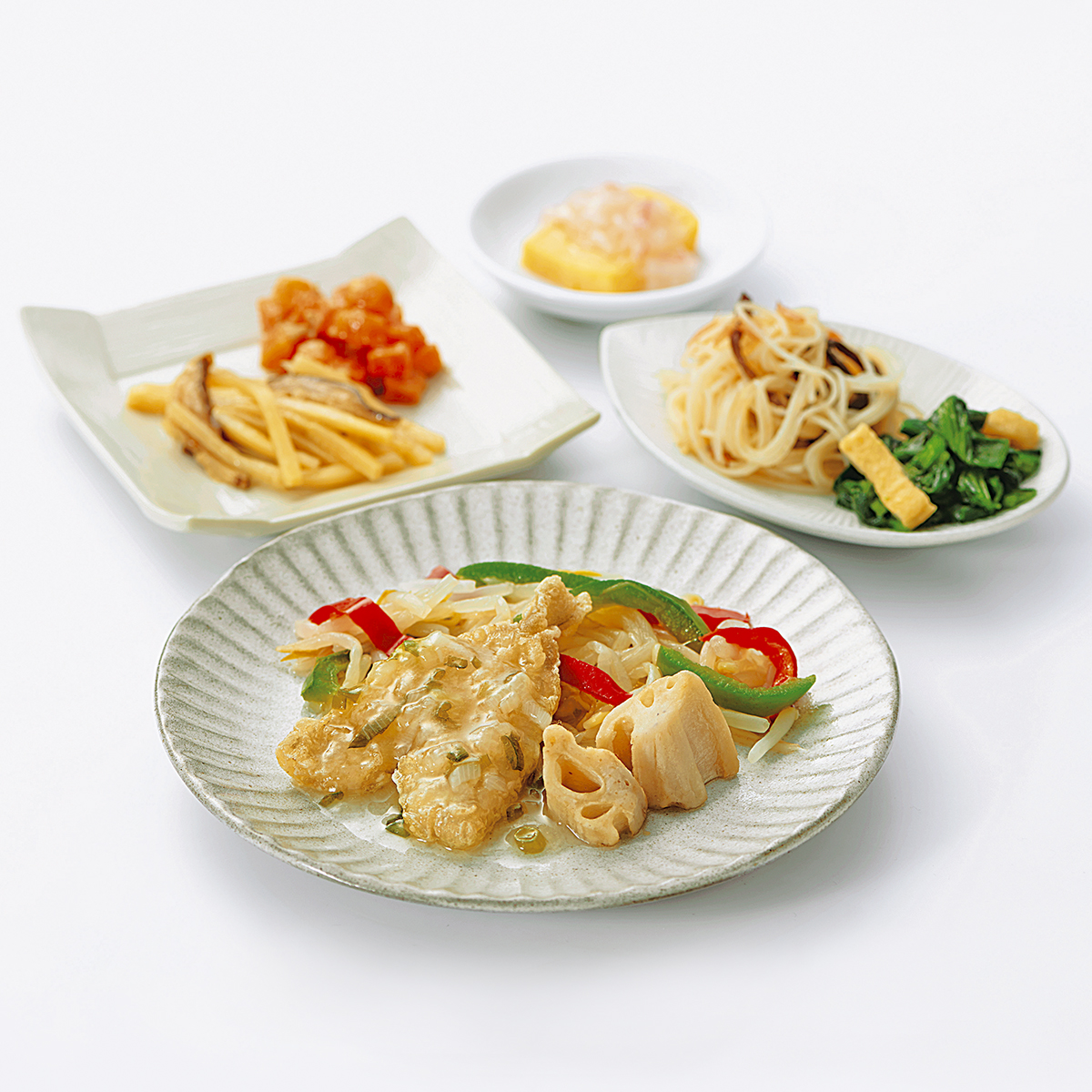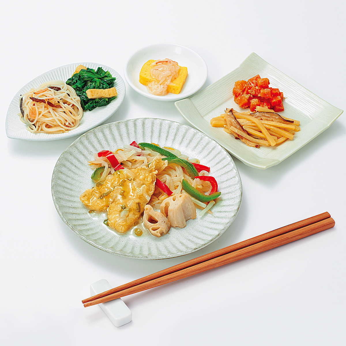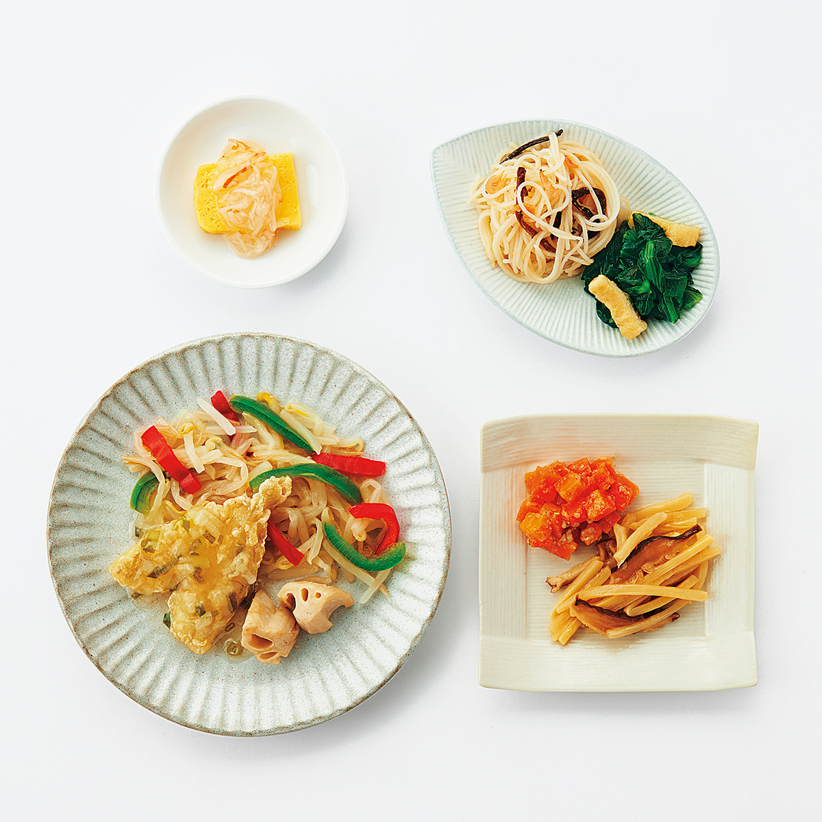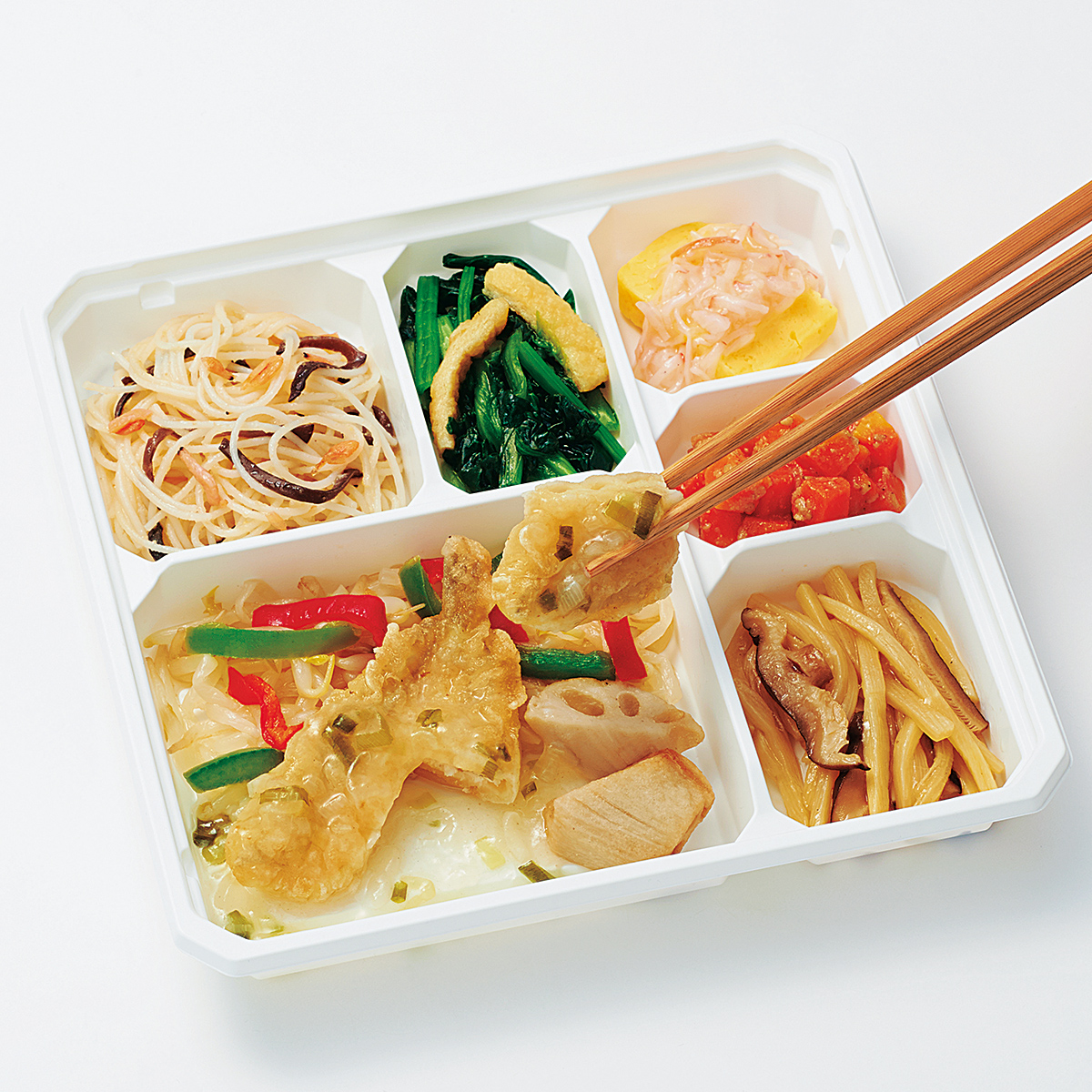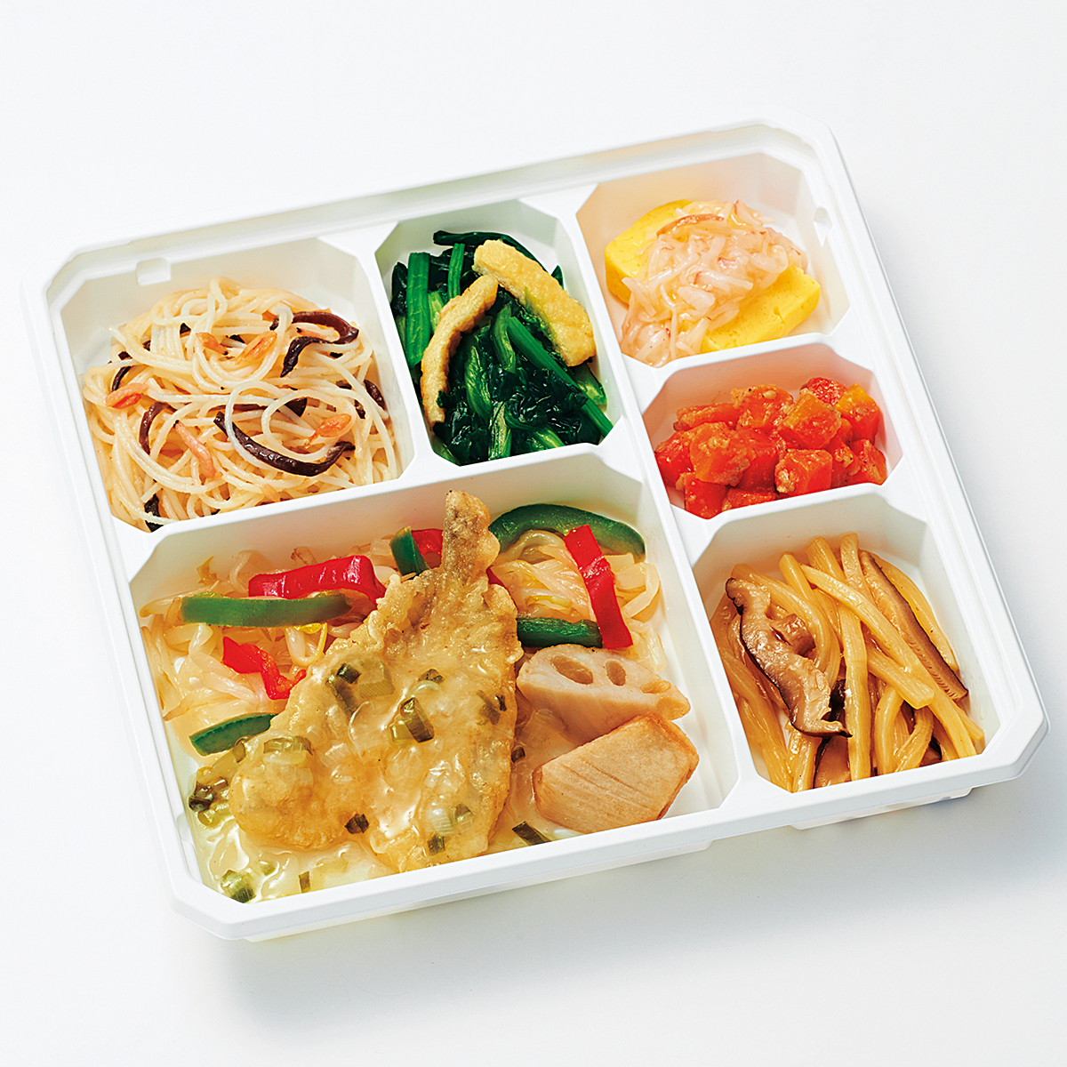 | 原材料名 | 緑豆もやし、キス天ぷら、なたね油、れんこん、小松菜、卵焼、人参、緑ピーマン、たけのこ水煮、赤ピーマン、ビーフン、ねぎ、かに風味かまぼこ、味噌、油揚げ、玉ねぎ、乾燥しいたけ、乾燥きくらげ、食塩、発酵調味料、濃口醤油、液体塩こうじ、清酒、上白糖、顆粒和風だし、乾燥小えび、すり白ごま、煎り白ごま、ゼラチン、白こしょう/糊料(加工デンプン、CMC)、加工デンプン、ソルビット、調味料(アミノ酸等)、グリシン、膨脹剤、乳化剤、炭酸Ca、リン酸塩(Na)、着色料(紅麹、カロチノイド、ラック)、酸味料、香料、(一部に小麦・卵・えび・かに・ごま・大豆・ゼラチンを含む) | ||