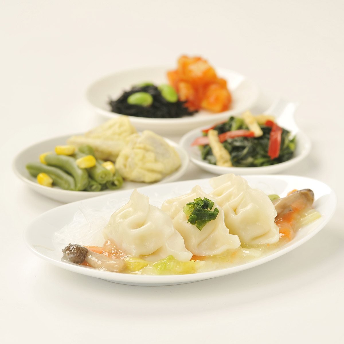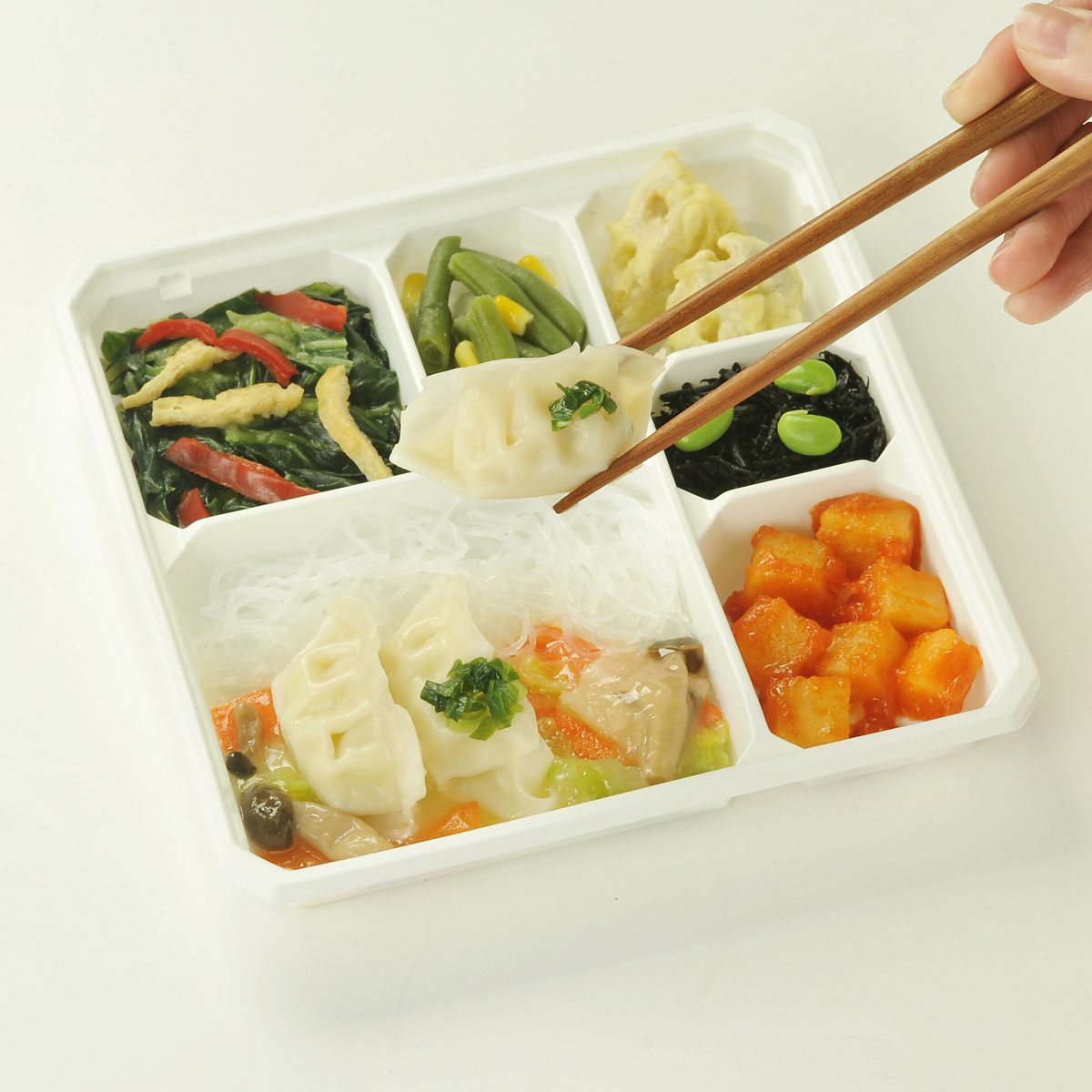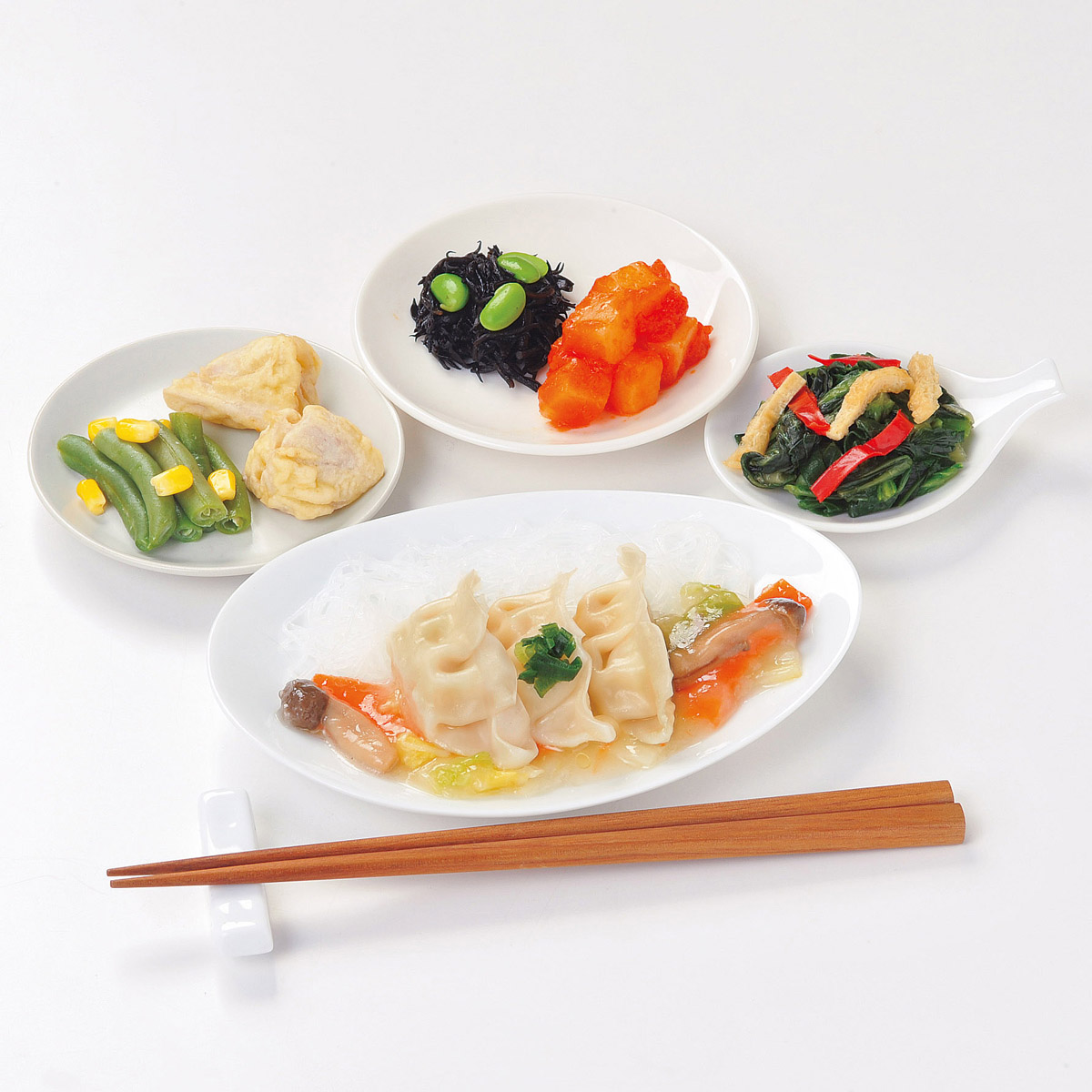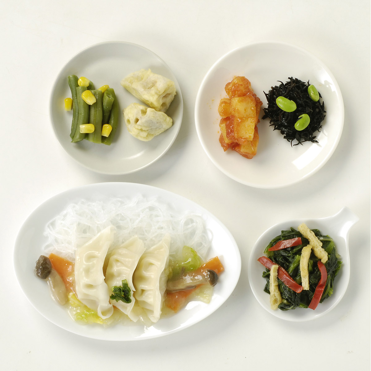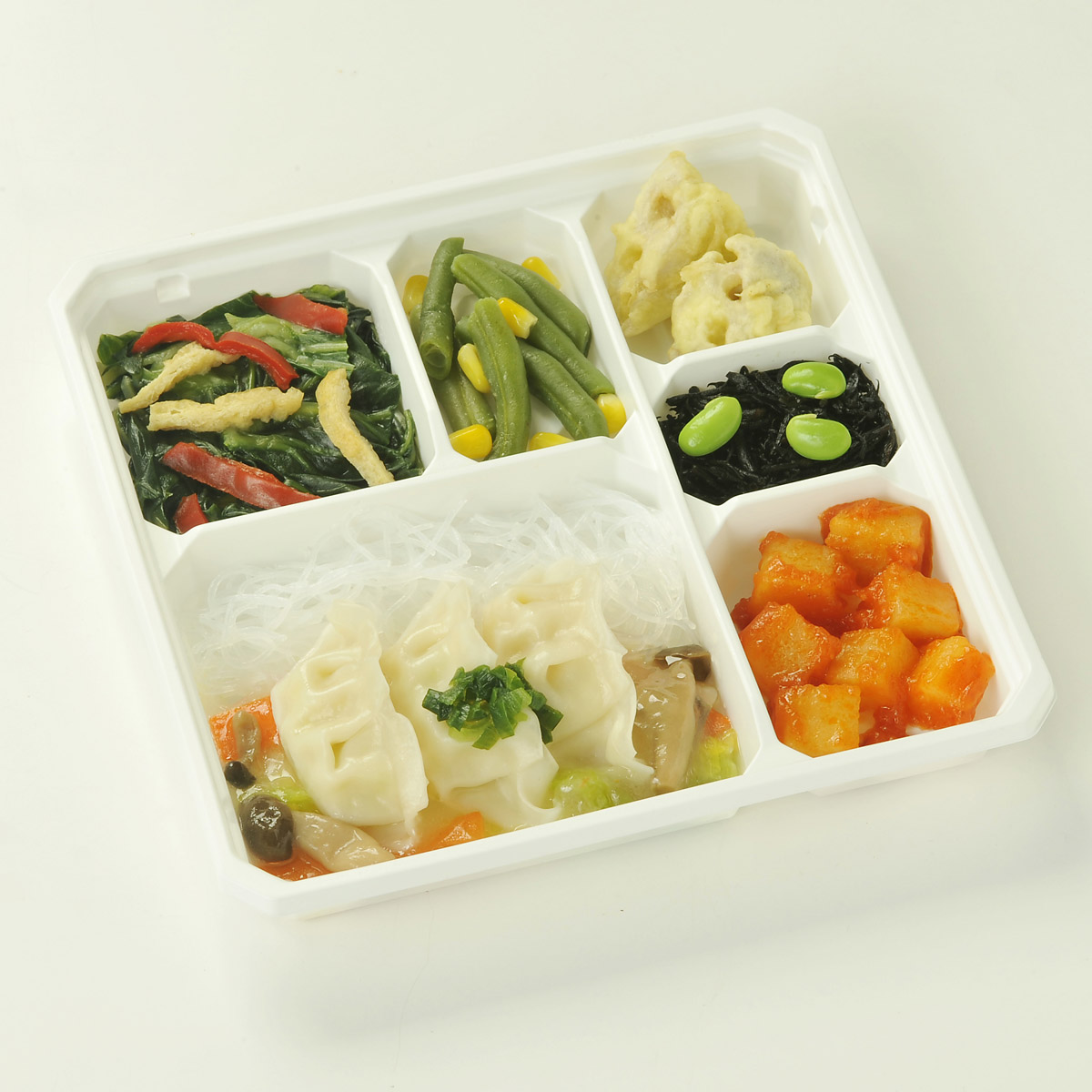 | 原材料名 | 餃子(小麦粉、キャベツ、魚肉すり身、玉ねぎ、豚脂、豆腐、卵白、その他)、れんこん、チンゲン菜、サヤインゲン、じゃがいも、なたね油、白菜、人参、天ぷら粉、ぶなしめじ水煮、コーン、赤ピーマン、トマト・ピューレー漬、油揚げ、枝豆、ねぎ、春雨、ケチャップ、乾燥ひじき、中華スープの素、トマトペースト、三温糖、本みりん、ゼラチン、顆粒中華風だし、淡口醤油、食塩、上白糖、顆粒洋風だし、粉末水あめ、顆粒和風だし、おろしにんにく、白こしょう、黒こしょう/加工デンプン、増粘剤(加工デンプン)、調味料(アミノ酸等)、膨脹剤、クチナシ色素、pH調整剤、酸味料、酸化防止剤(V.C)、凝固剤、(一部に小麦・卵・乳成分・牛肉・ごま・大豆・鶏肉・豚肉・ゼラチンを含む) | ||