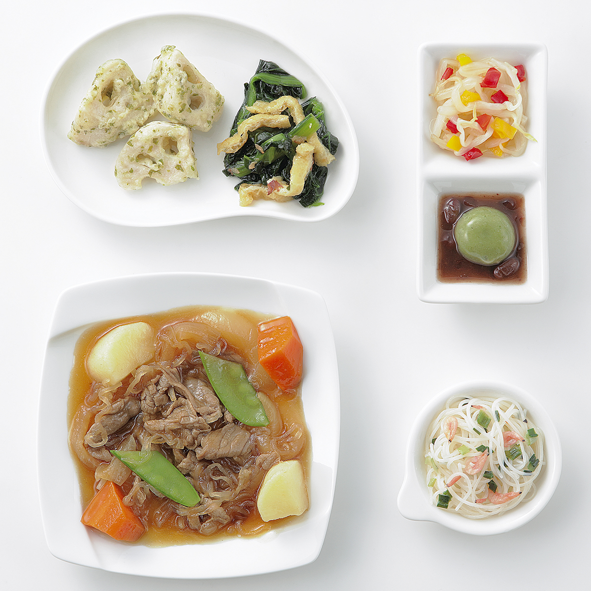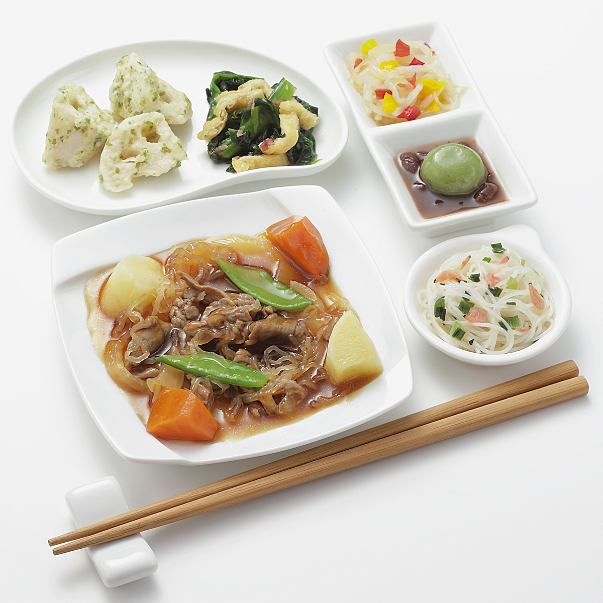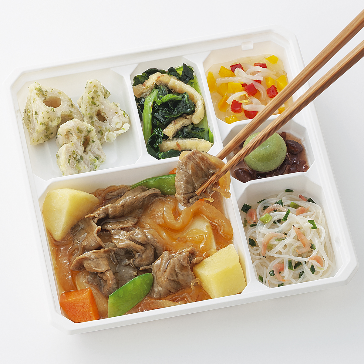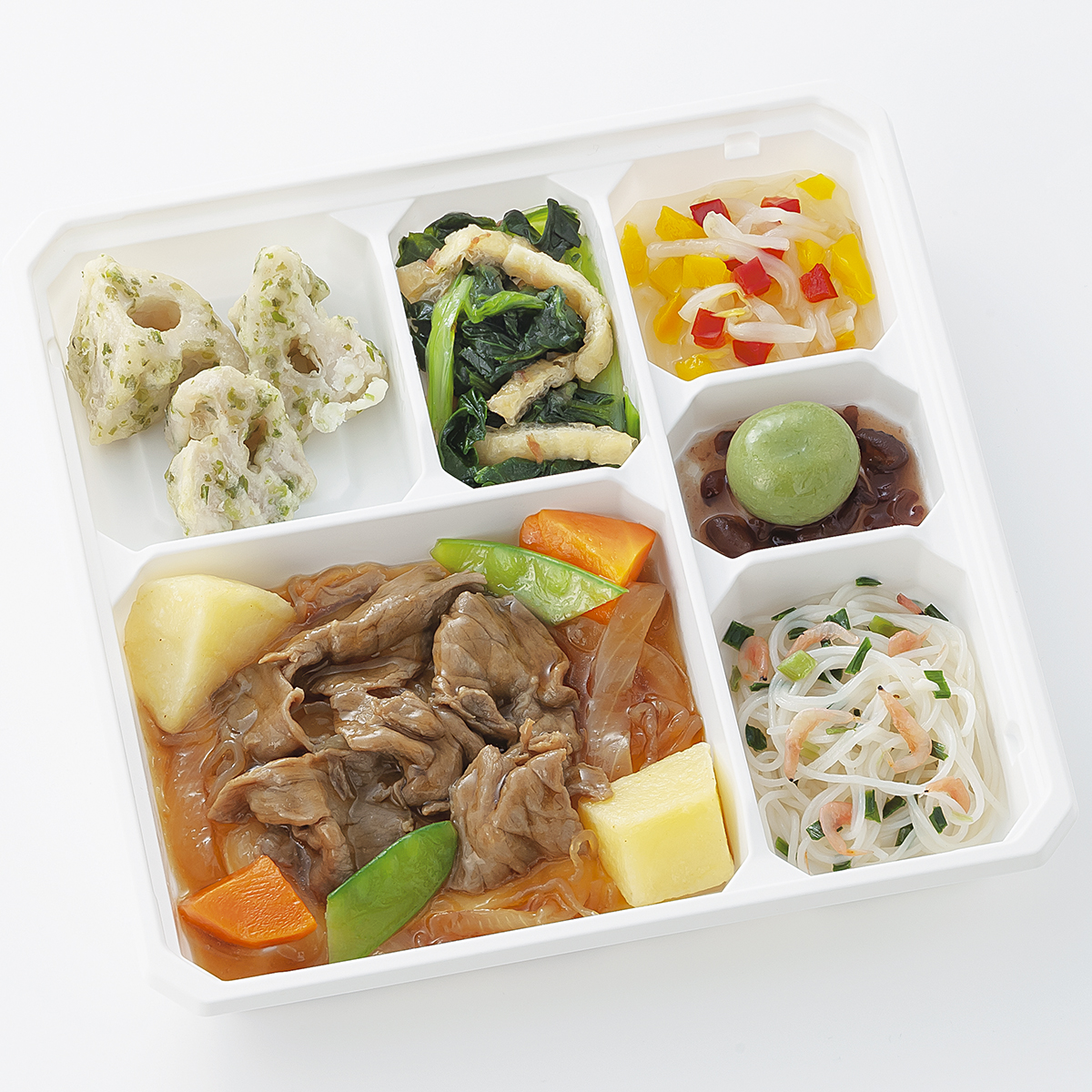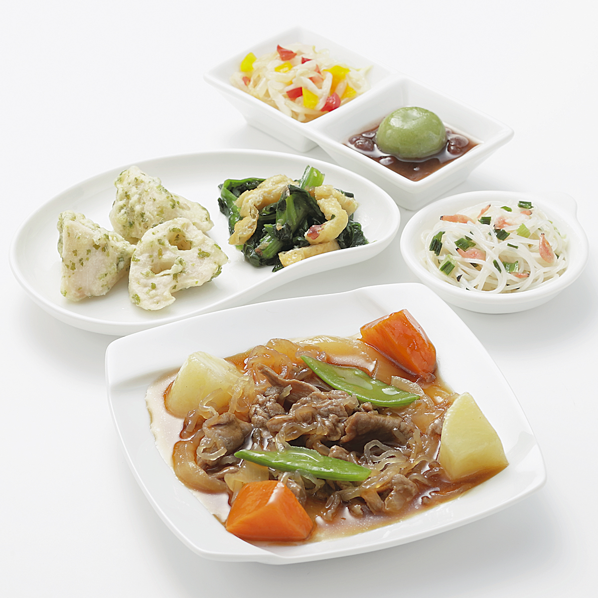 | 原材料名 | れんこん、玉ねぎ、じゃがいも、緑豆もやし、牛肉、なたね油、小松菜、白滝、人参、よもぎ入だんご、減塩醤油、三温糖、天ぷら粉、清酒、ビーフン、キヌサヤ、ゆであずき、にら、黄ピーマン、赤ピーマン、油揚げ、醸造酢、淡口醤油、顆粒和風だし、乾燥小えび、食塩、本みりん、果実調味料、おろししょうが、上白糖、あおさ粉、ごま油、にんにく、かつお削りぶし、中華スープの素、ホタテエキスパウダー、黒こしょう/糊料(加工デンプン、CMC)、加工デンプン、調味料(アミノ酸等)、酵素、膨脹剤、pH調整剤、水酸化Ca、着色料(クチナシ、紅麹)、乳化剤、リン酸塩(Na)、酸味料、(一部に小麦・乳成分・えび・牛肉・ごま・大豆・鶏肉・豚肉・ゼラチンを含む) | ||