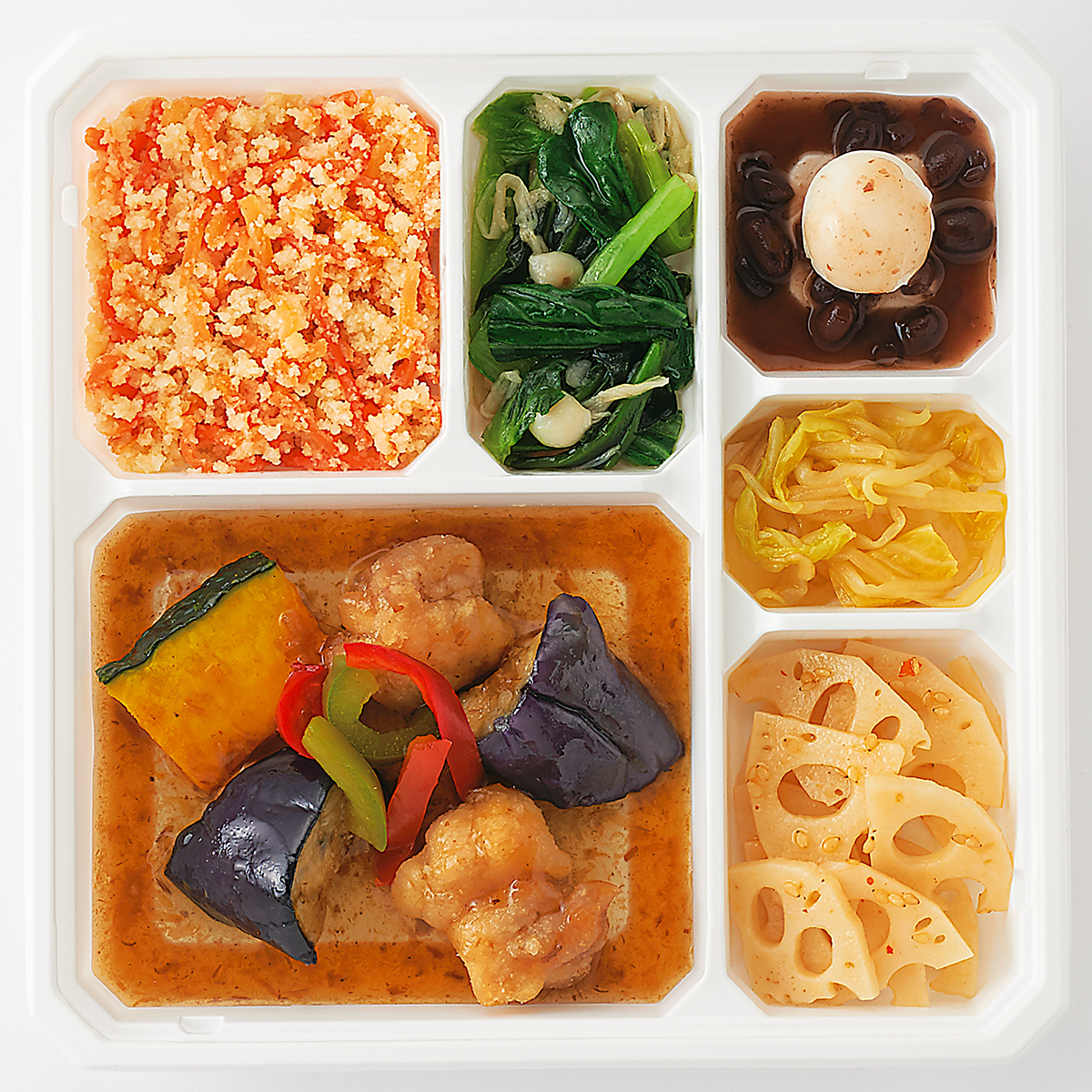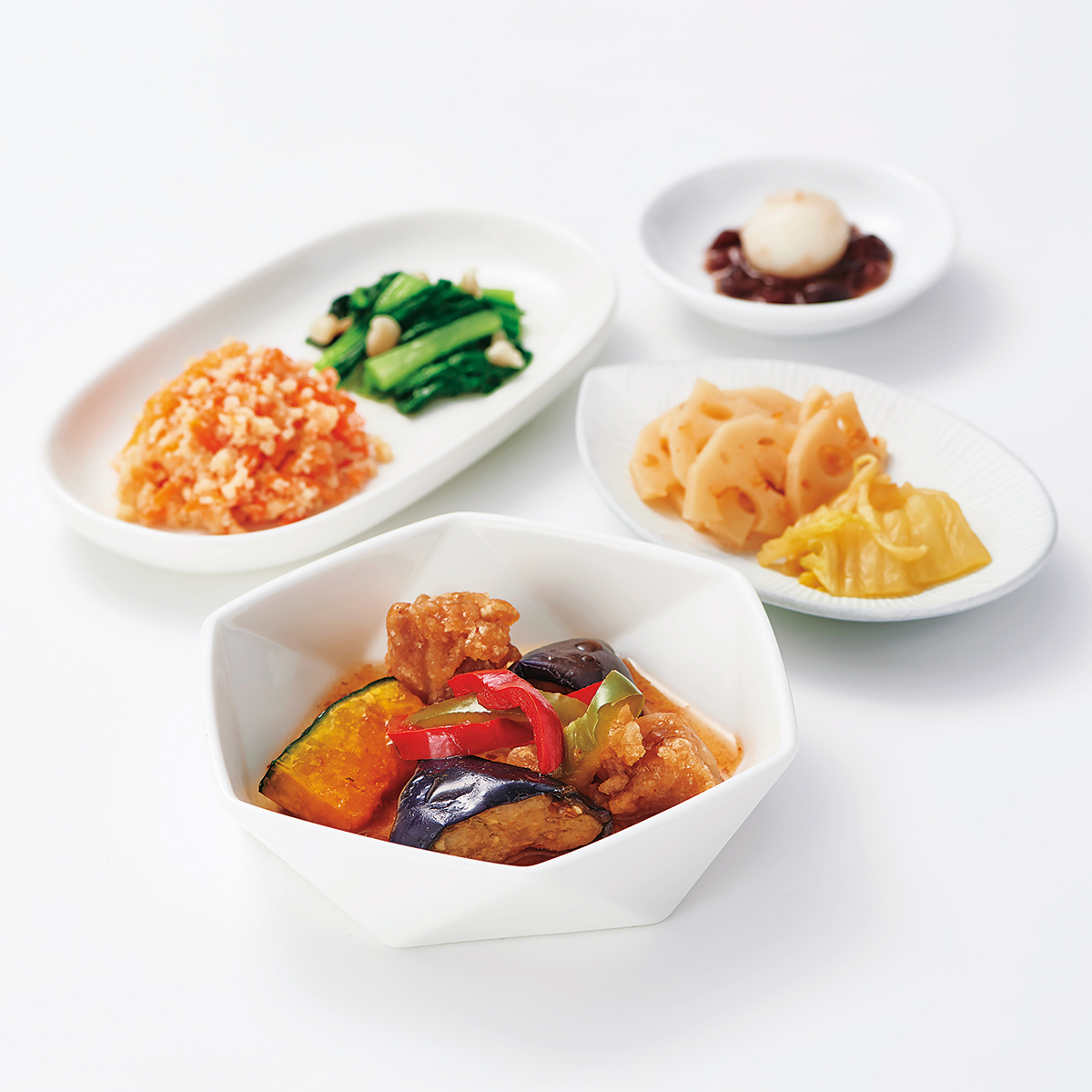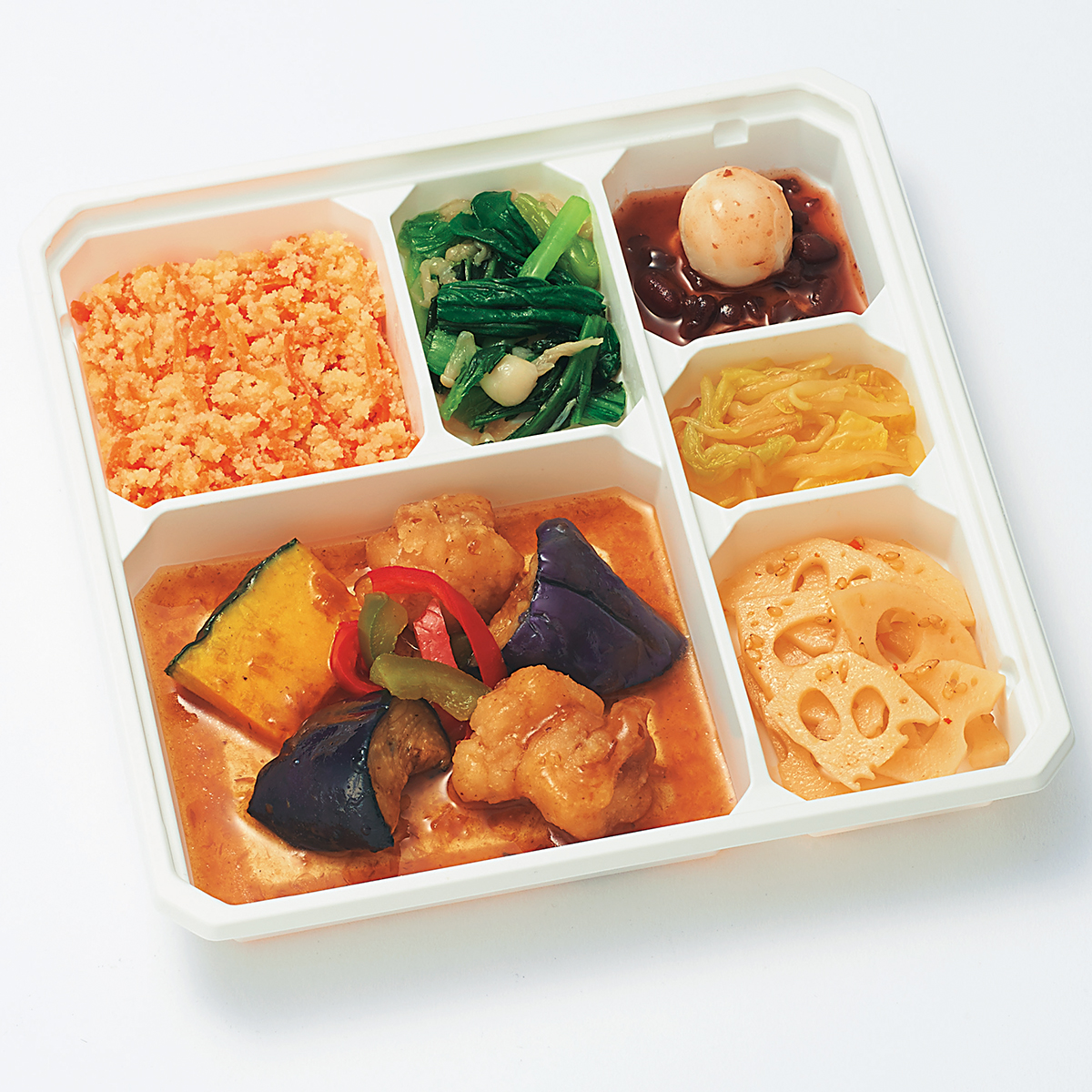 | 原材料名 | 鶏肉、素揚げなす、れんこん水煮、白菜、チンゲン菜、人参、だんご(上新粉、でん粉)、かぼちゃ、ゆであずき、なたね油、もやし、えのきたけ、濃口醤油、赤ピーマン、ごま油、緑ピーマン、発酵調味料、乾燥おから、上白糖、三温糖、淡口醤油、カツオ削りぶし、白醤油、ねりからし、顆粒和風だし、食塩、果実調味料、煎り白ごま、にんにく、豆板醤、唐辛子/加工デンプン、増粘剤(加工デンプン、増粘多糖類)、調味料(アミノ酸等)、pH調整剤、着色料(ウコン)、酸味料、酒精、酸化防止剤(V.C)、香辛料、V.B1、漂白剤(亜硫酸塩)、(一部に小麦・ごま・大豆・鶏肉を含む) | ||