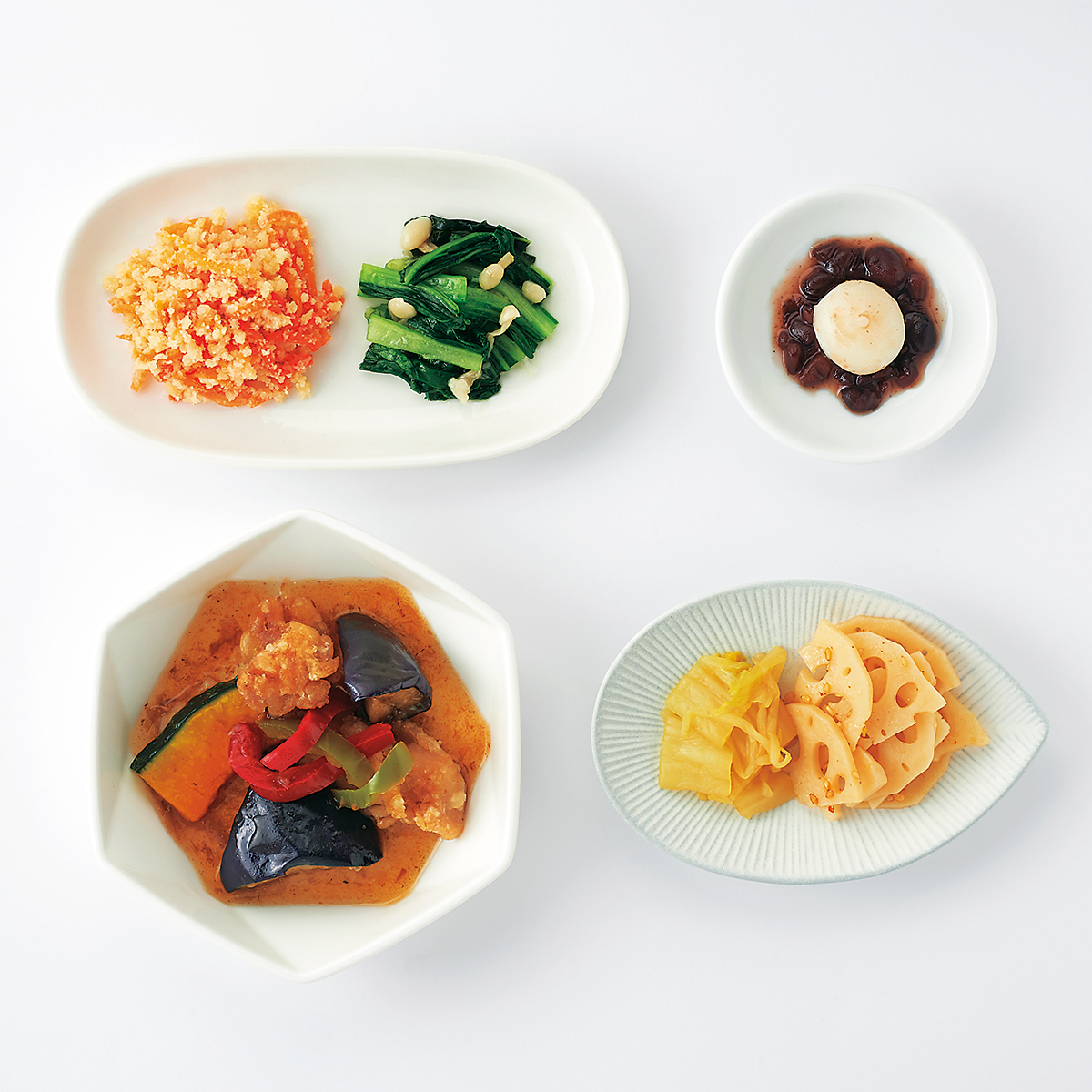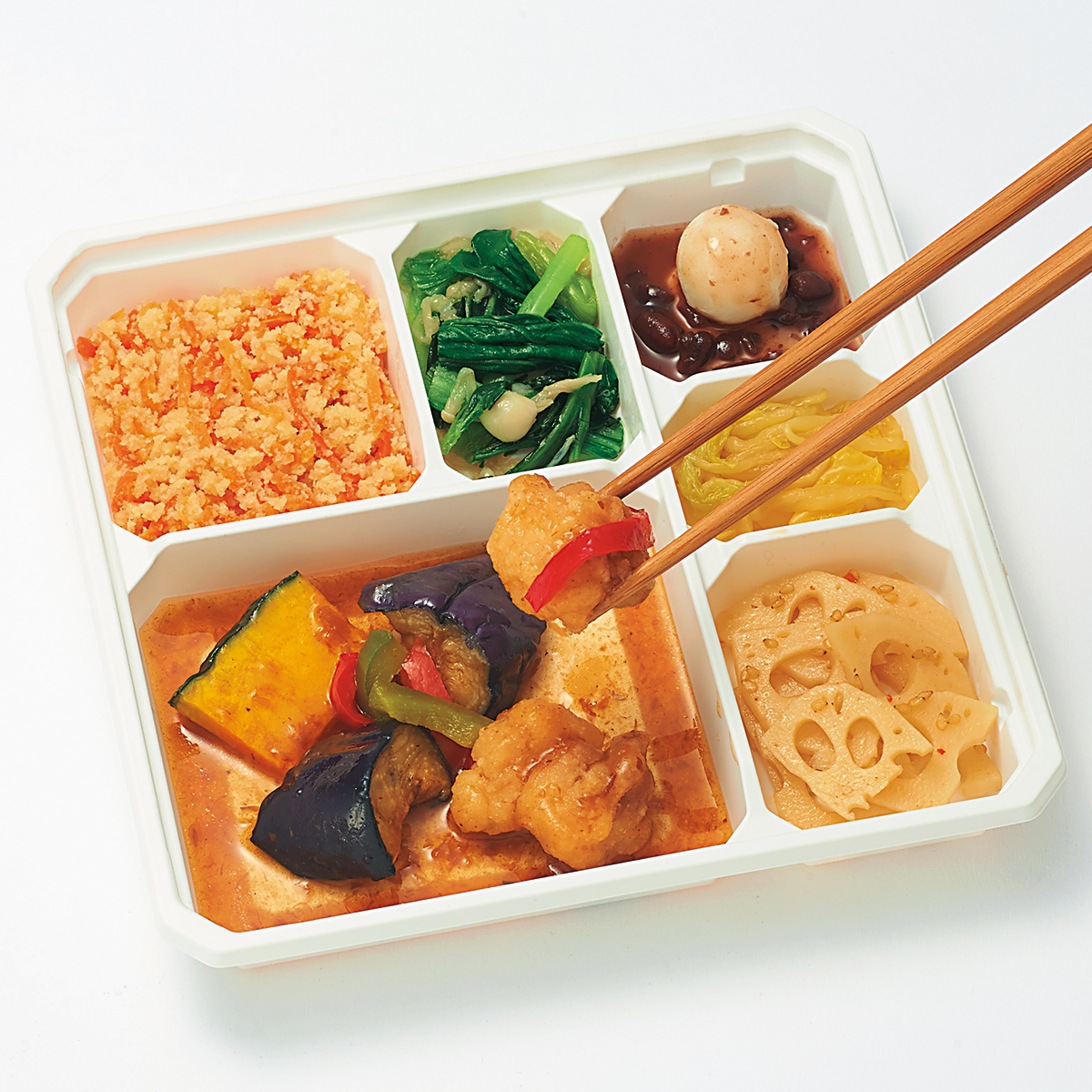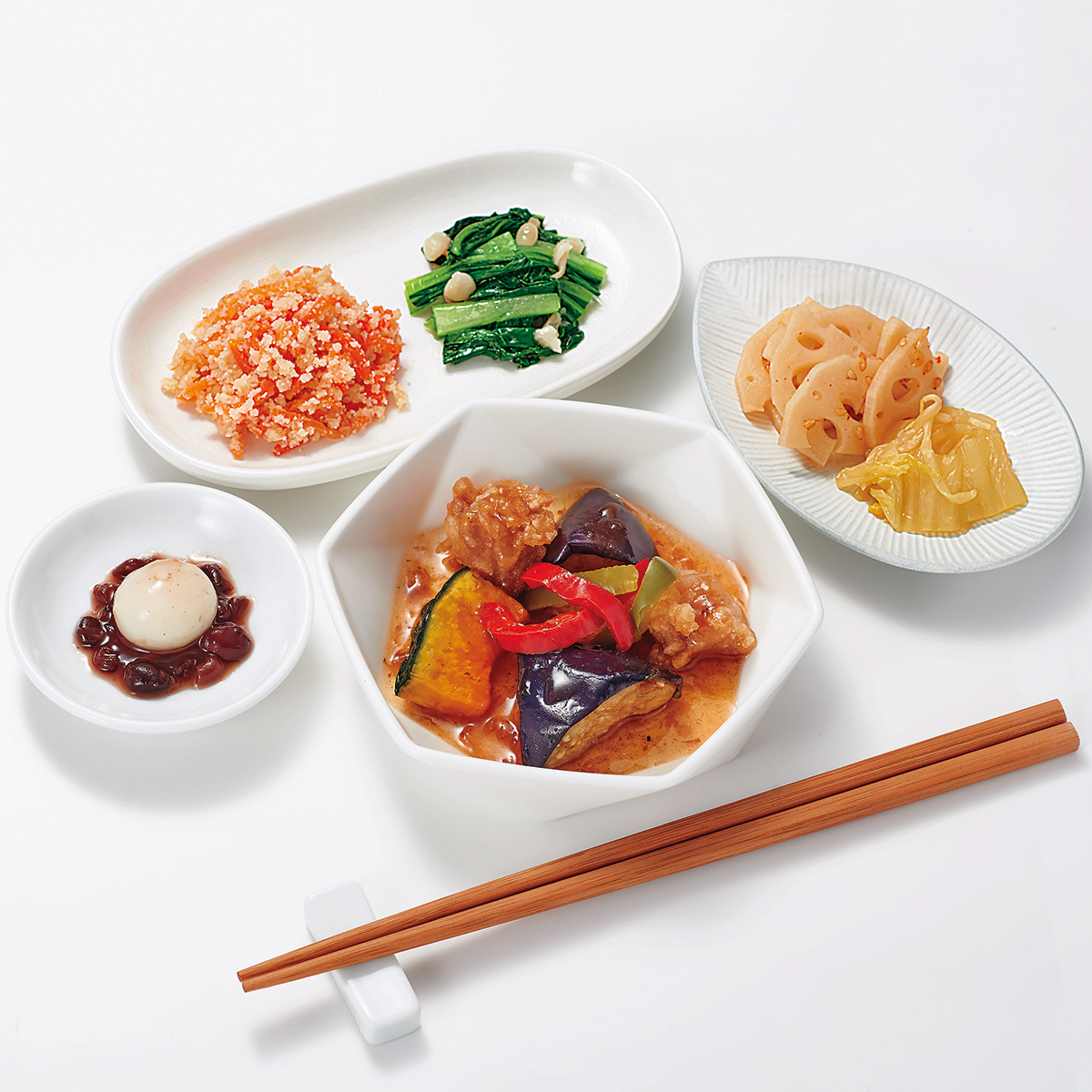 | 原材料名 | 鶏肉、素揚げなす、れんこん水煮、白菜、チンゲン菜、人参、だんご(上新粉、でん粉)、かぼちゃ、ゆであずき、なたね油、もやし、えのきたけ、濃口醤油、赤ピーマン、ごま油、緑ピーマン、発酵調味料、乾燥おから、上白糖、三温糖、淡口醤油、カツオ削りぶし、白醤油、ねりからし、顆粒和風だし、食塩、果実調味料、煎り白ごま、にんにく、豆板醤、唐辛子/加工デンプン、増粘剤(加工デンプン、増粘多糖類)、調味料(アミノ酸等)、pH調整剤、着色料(ウコン)、酸味料、酒精、酸化防止剤(V.C)、香辛料、V.B1、漂白剤(亜硫酸塩)、(一部に小麦・ごま・大豆・鶏肉を含む) | ||