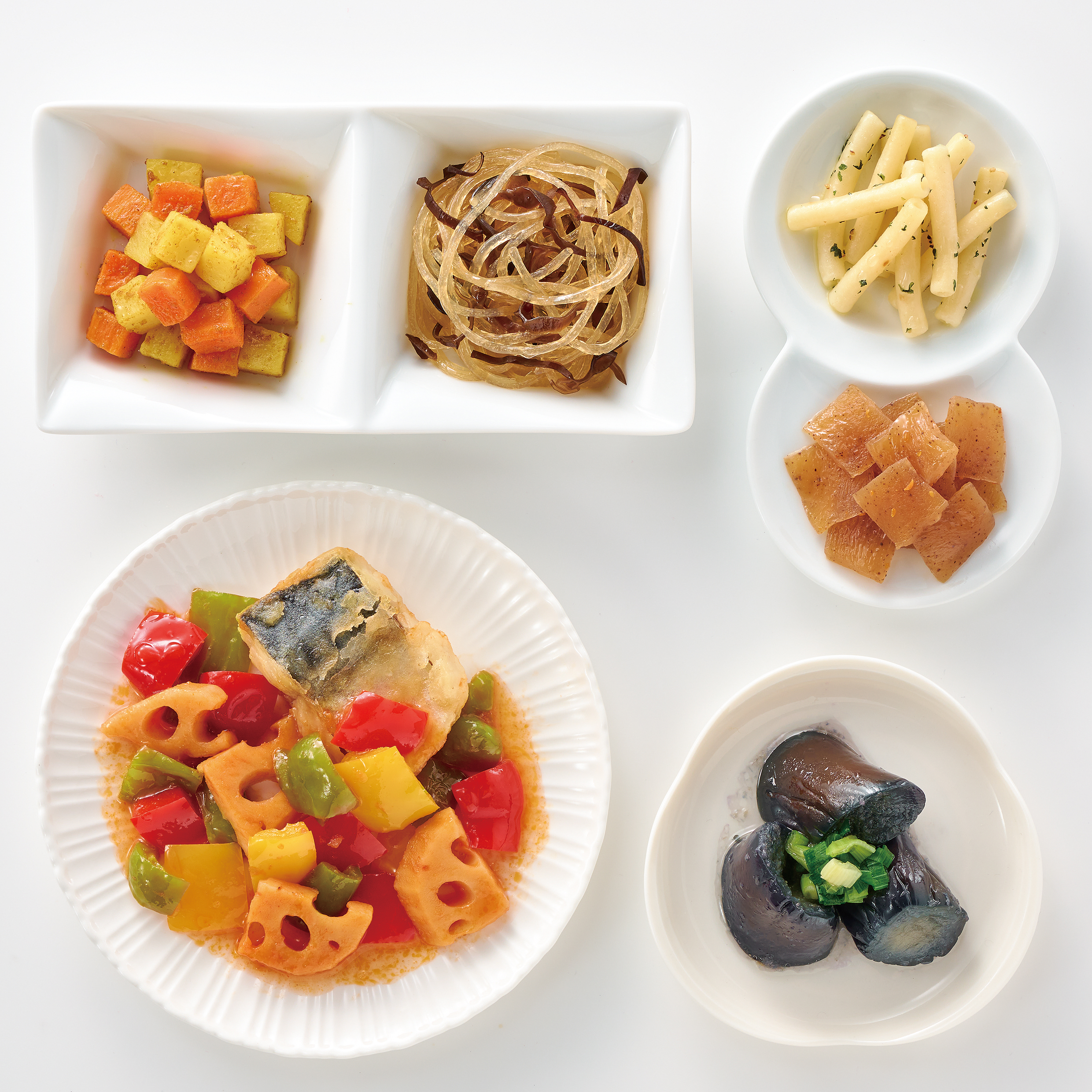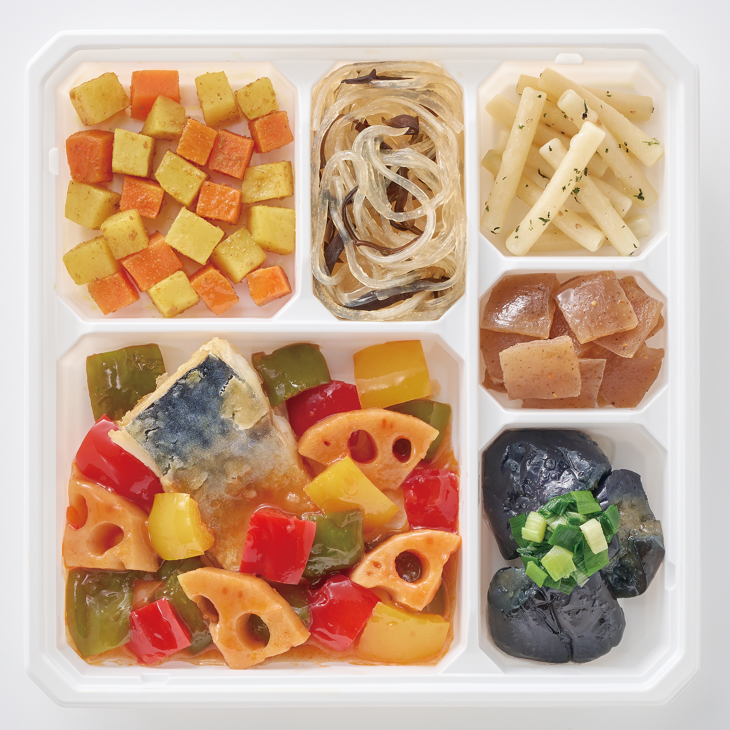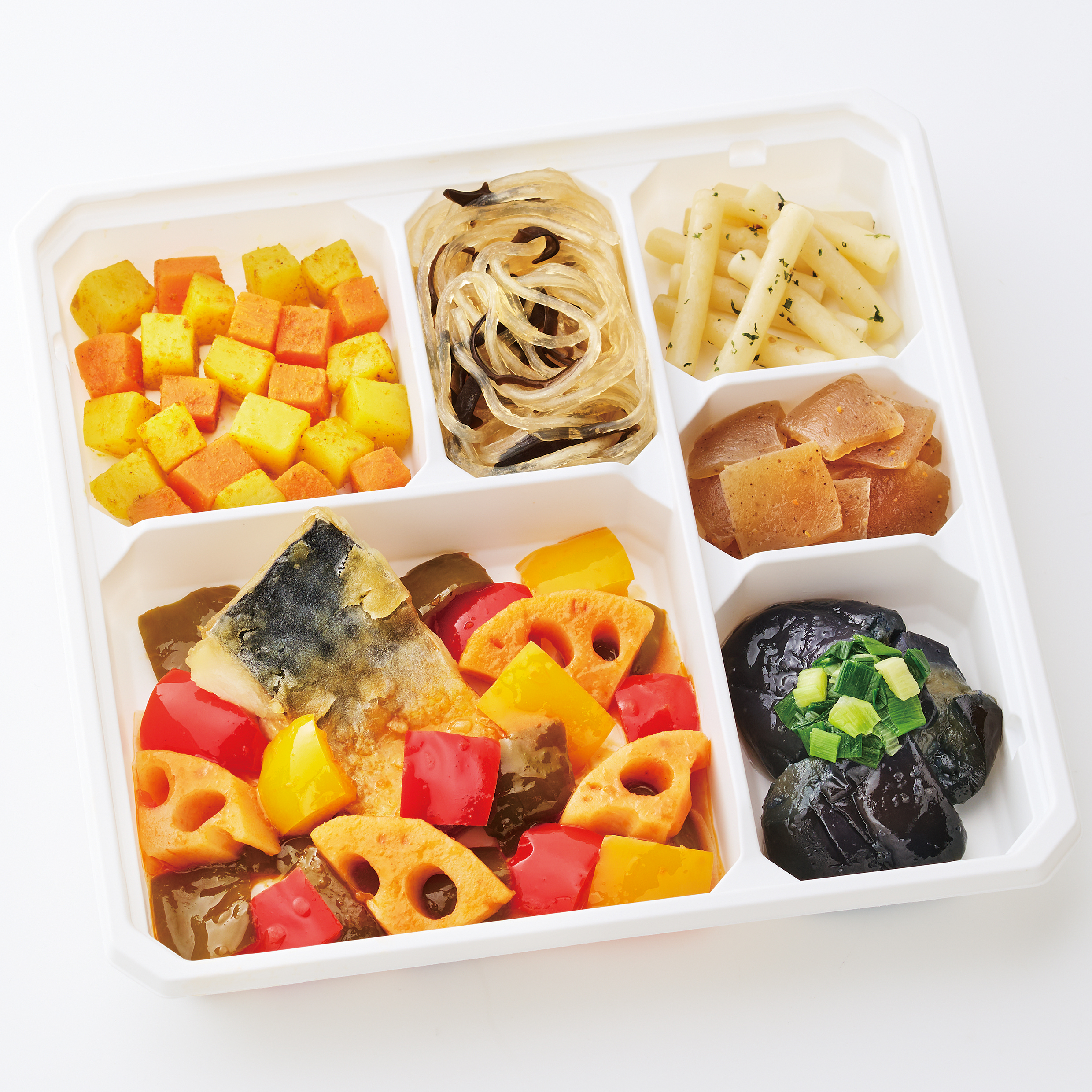 | 原材料名 | なす(国産)、さば、こんにゃく、じゃがいも、にんじん、れんこん、ピーマン、黄パプリカ、赤パプリカ、トマトケチャップ、食用なたね油、パスタ、こいくちしょうゆ(本醸造)、はるさめ、小ねぎ、穀物酢、味付けぽん酢、食用調合油(ごま油、大豆油)、砂糖、バター、しょうが、清酒、みりん、にんにく、きくらげ、乾燥スープ(コンソメ)、パセリ、カレーパウダー、とうがらし、ブラックペッパー/増粘剤(加工でん粉、増粘多糖類)、糊料(繊維素グリコール酸Na)、水酸化Ca、酒精、ミョウバン、香料、酸化防止剤(V.E)、酸味料、調味料(アミノ酸等)、(一部に小麦・乳成分・オレンジ・牛肉・ごま・さば・大豆・鶏肉・ゼラチンを含む) 原材料配合割合 さば 11%(仕込み時) | ||
