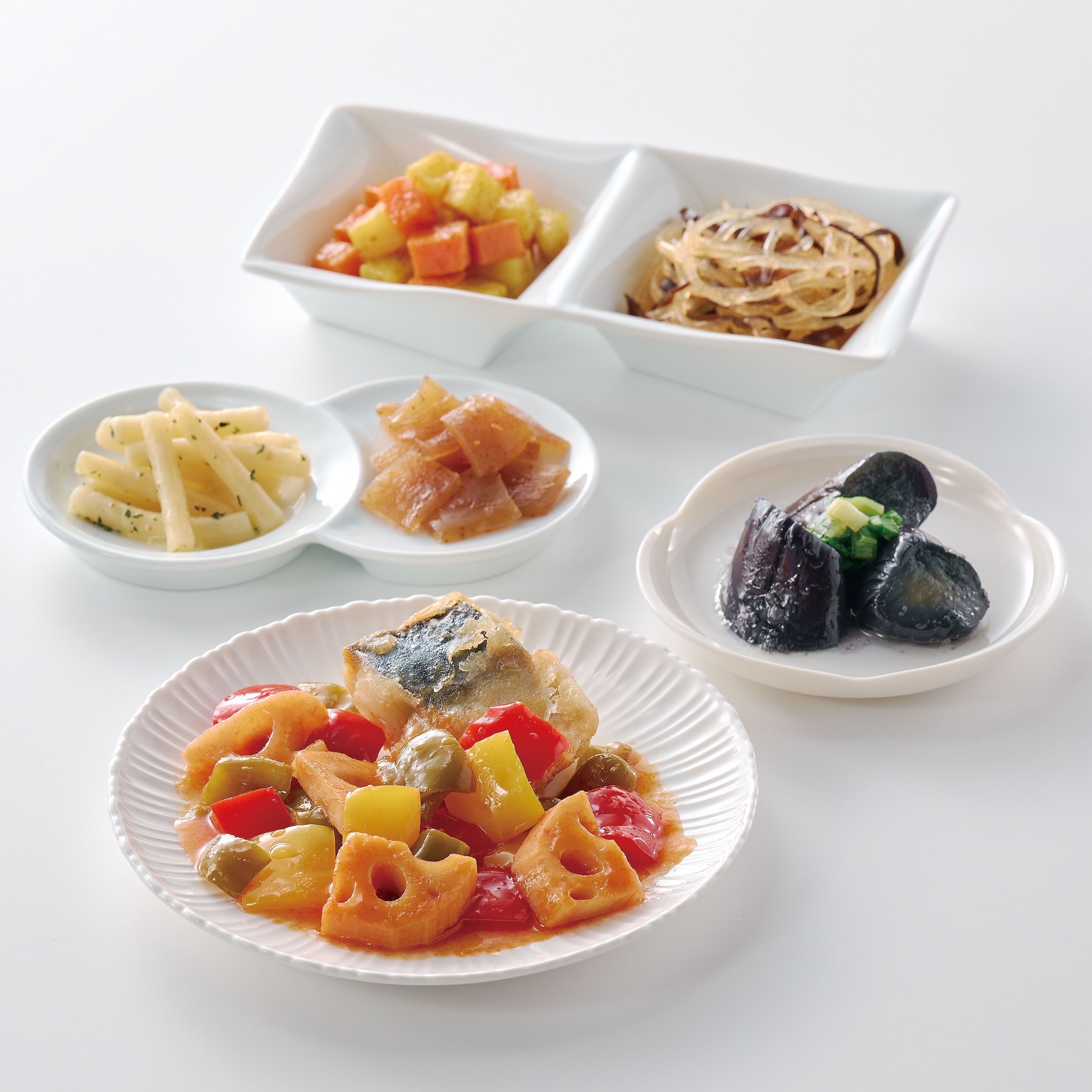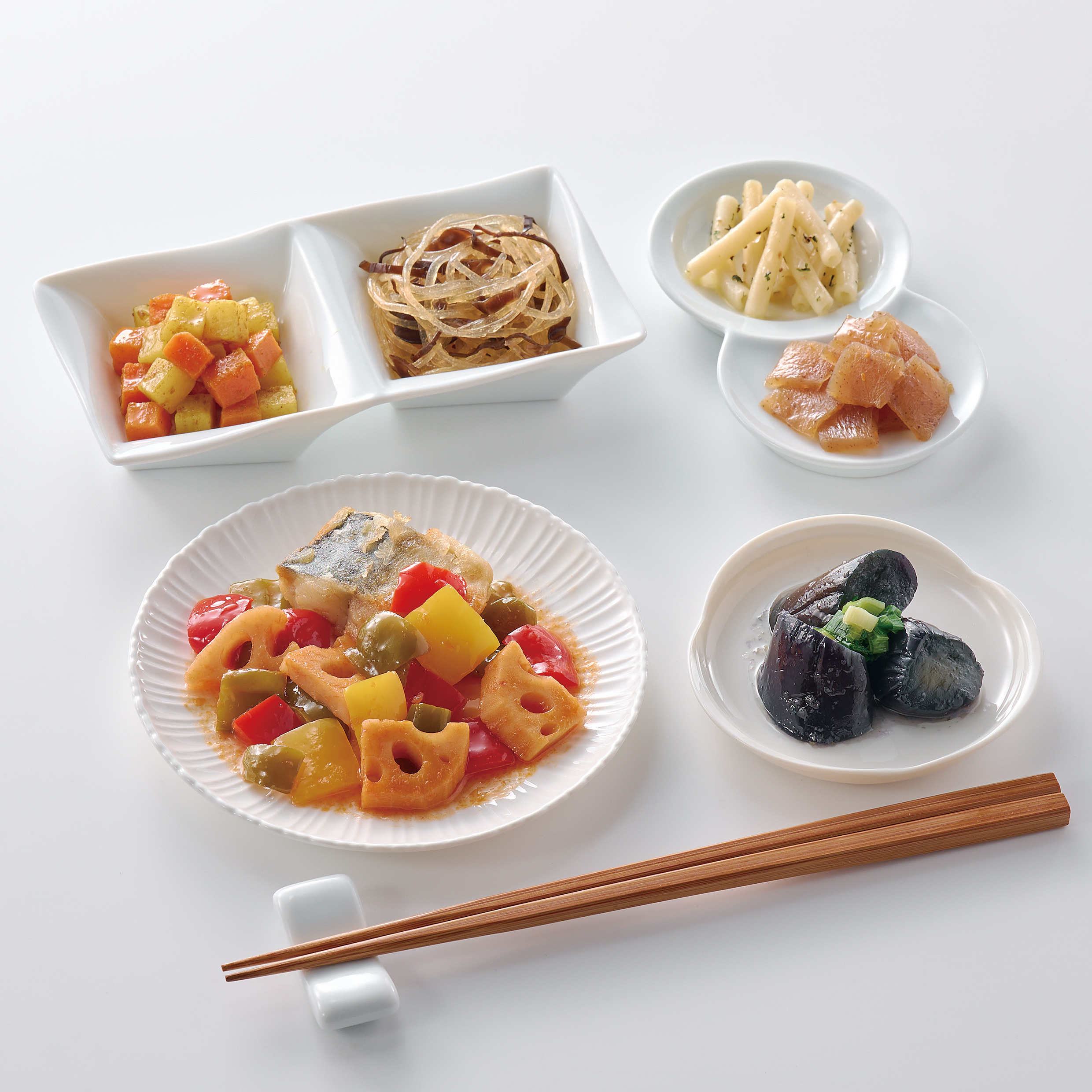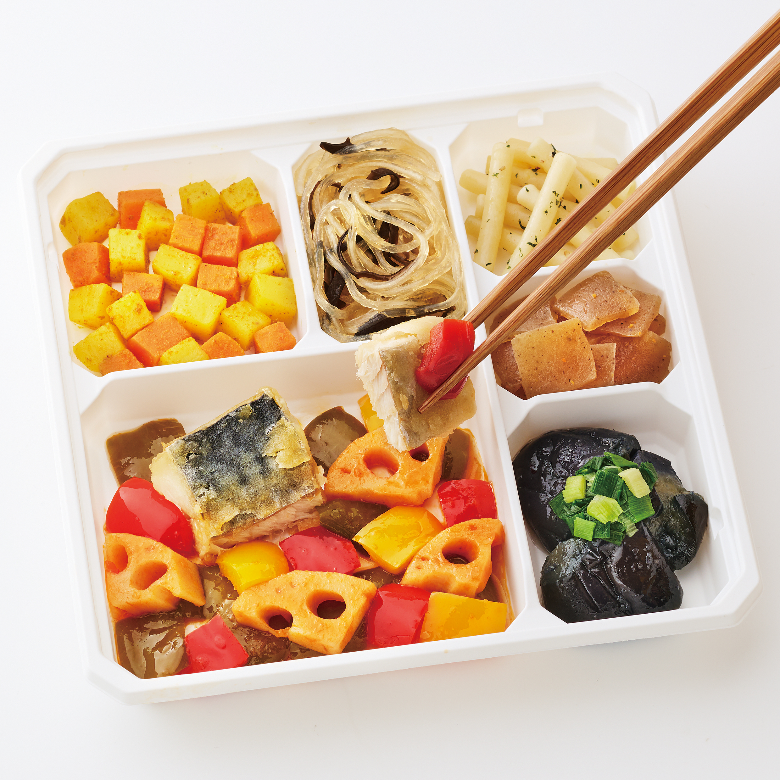 | 原材料名 | なす(国産)、さば、こんにゃく、じゃがいも、にんじん、れんこん、ピーマン、黄パプリカ、赤パプリカ、トマトケチャップ、食用なたね油、パスタ、こいくちしょうゆ(本醸造)、はるさめ、小ねぎ、穀物酢、味付けぽん酢、食用調合油(ごま油、大豆油)、砂糖、バター、しょうが、清酒、みりん、にんにく、きくらげ、乾燥スープ(コンソメ)、パセリ、カレーパウダー、とうがらし、ブラックペッパー/増粘剤(加工でん粉、増粘多糖類)、糊料(繊維素グリコール酸Na)、水酸化Ca、酒精、ミョウバン、香料、酸化防止剤(V.E)、酸味料、調味料(アミノ酸等)、(一部に小麦・乳成分・オレンジ・牛肉・ごま・さば・大豆・鶏肉・ゼラチンを含む) 原材料配合割合 さば 11%(仕込み時) | ||