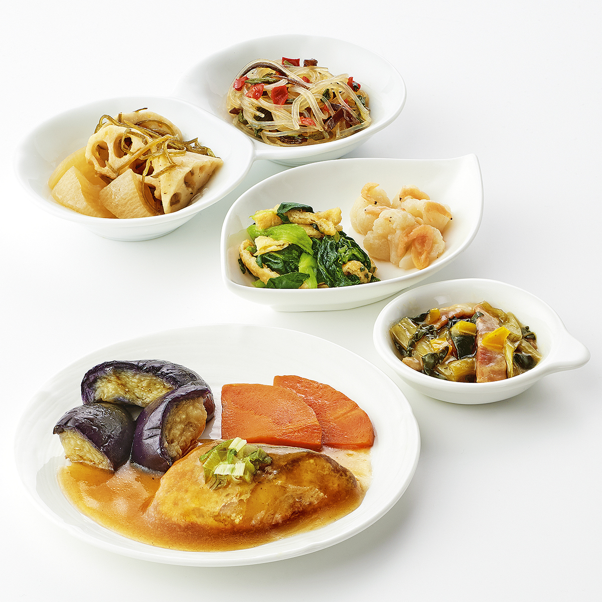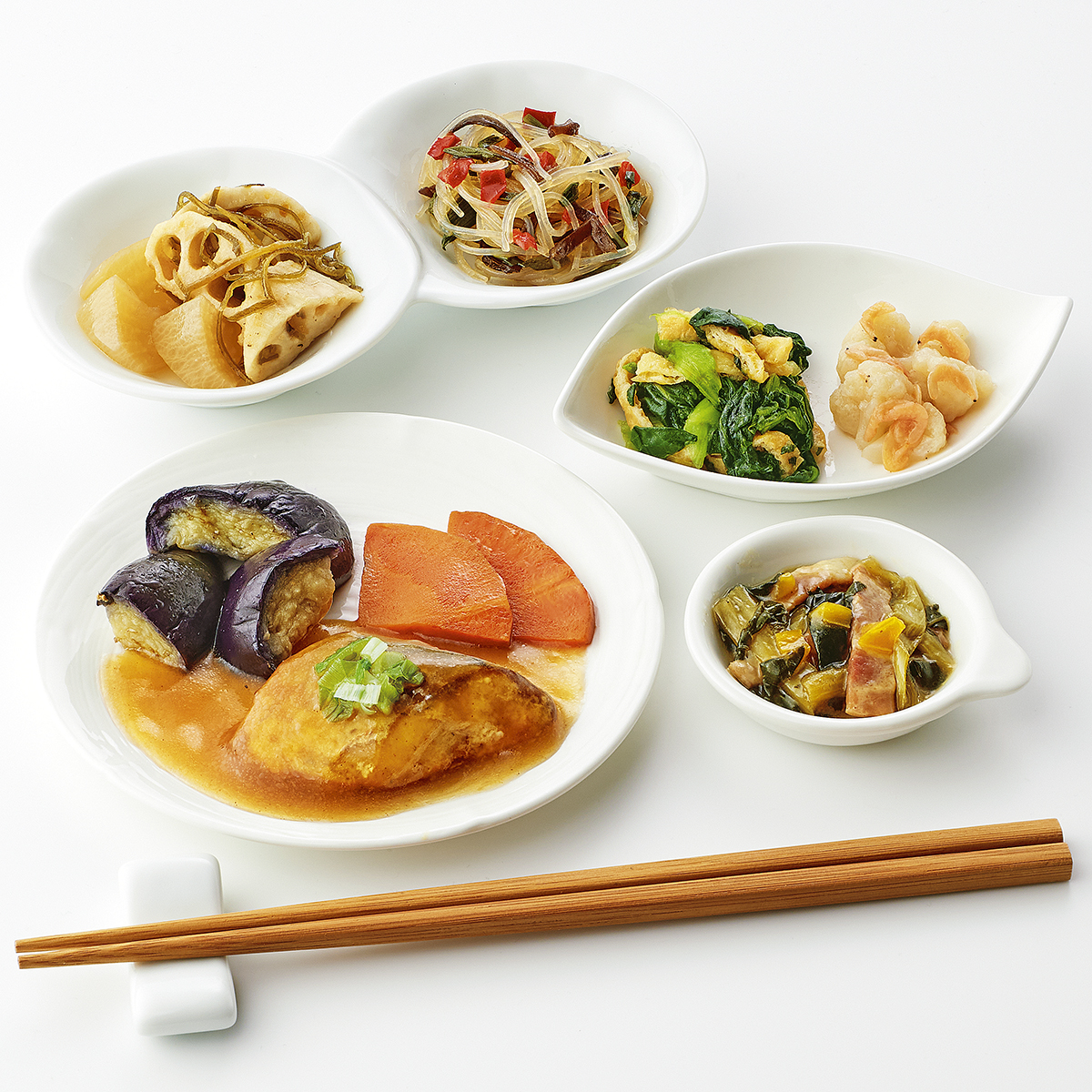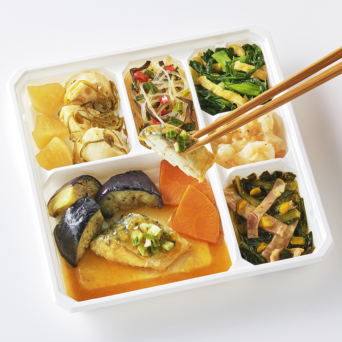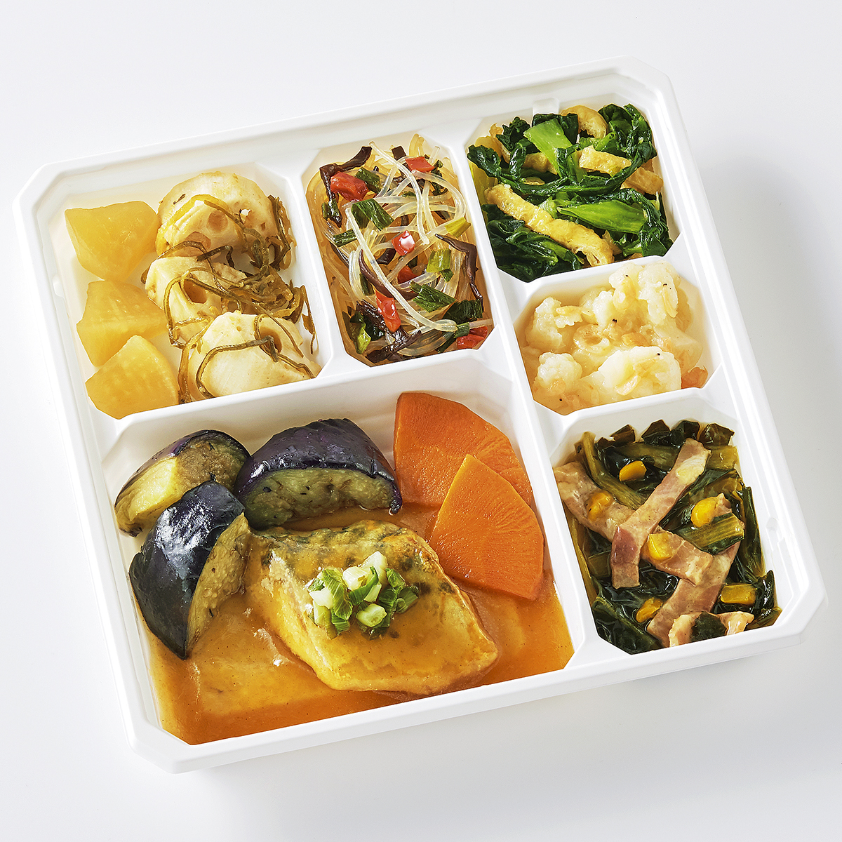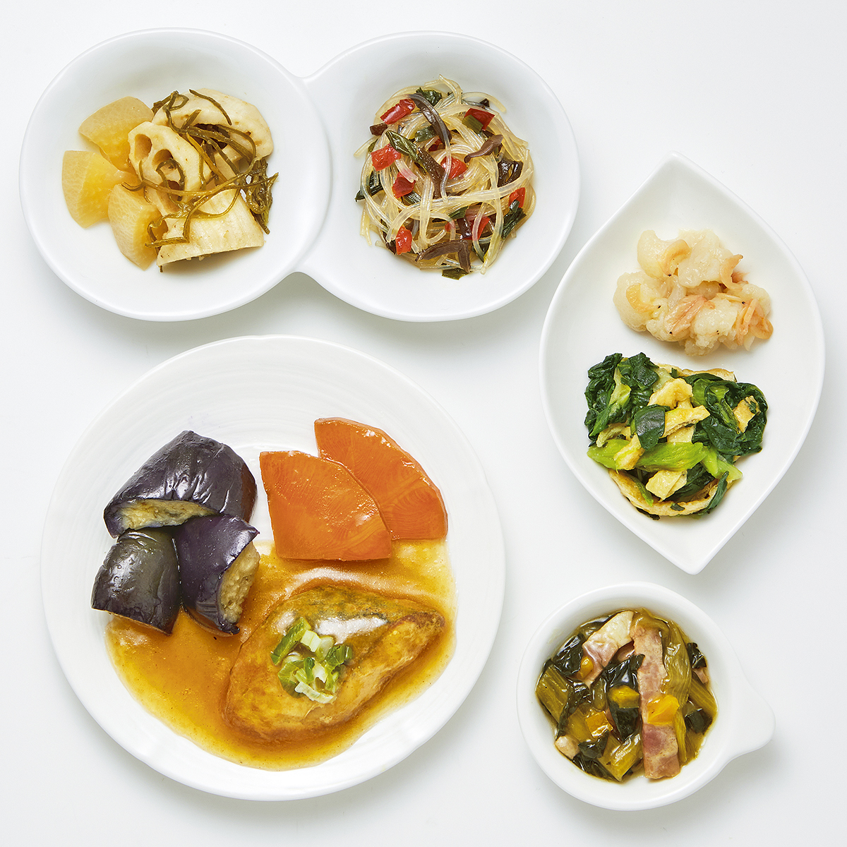 | 原材料名 | 揚げなす(中国製造)、さば、れんこん、チンゲン菜、大根、カリフラワー、清酒、小松菜、人参、濃口醤油、なたね油、本みりん、春雨、ねぎ、ベーコン、おろし生姜、生姜入り醤油だれ、砂糖、味付ぽん酢、油揚げ、赤ピーマン、にら、黄ピーマン、顆粒和風だし、しそ入り調味梅肉、バター風味油、みそ、減塩醤油、淡口醤油、ごま油、乾燥昆布、乾燥きくらげ、乾燥小えび、おろしゆず、食塩、顆粒中華風だし/増粘剤(加工でん粉)、調味料(アミノ酸等)、リン酸塩(Na)、酸味料、香料、酸化防止剤(V.C)、着色料(紅麹、野菜色素、カルミン酸、カロチン)、乳化剤、V.B1、pH調整剤、発色剤(亜硝酸Na)、甘味料(ステビア)、(一部にえび・小麦・卵・乳成分・牛肉・ごま・さば・大豆・鶏肉・豚肉・ゼラチンを含む) | ||
