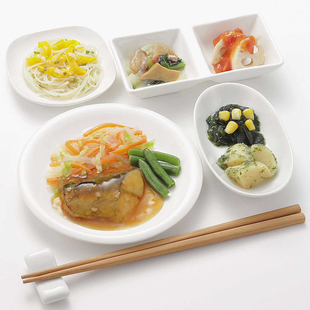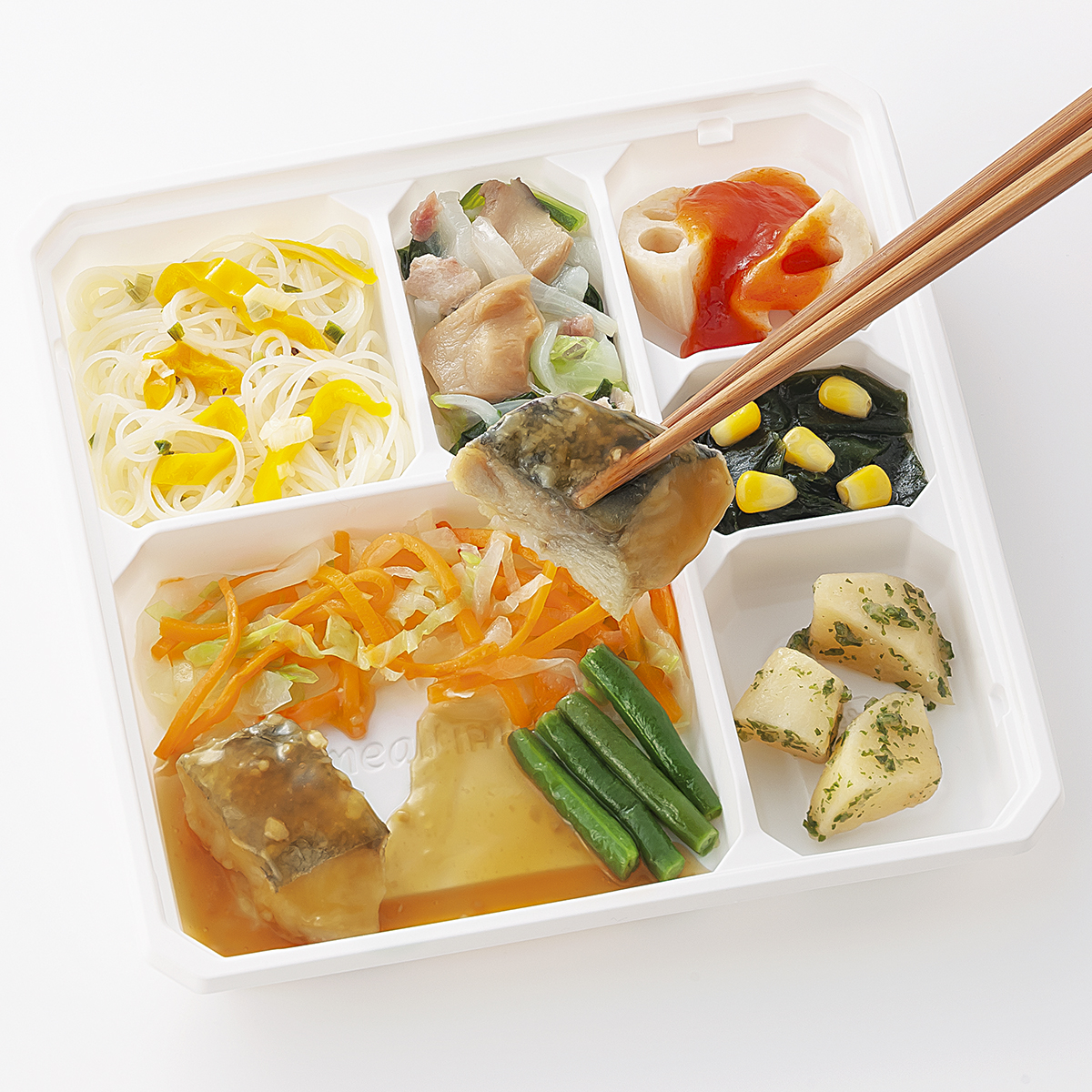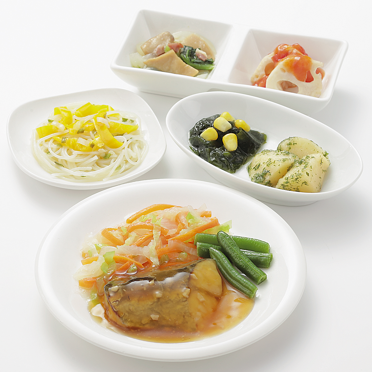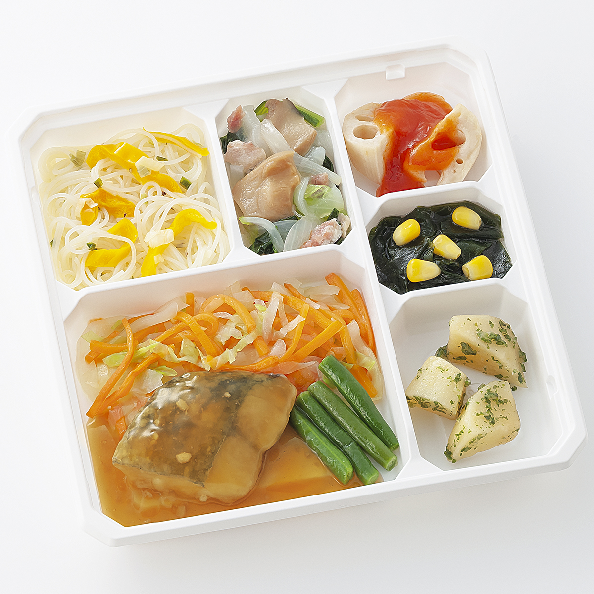 | 原材料名 | サワラ、じゃがいも、れんこん、キャベツ、なたね油、玉ねぎ、人参、黄ピーマン、ビーフン、サヤインゲン、小松菜、コーン、エリンギ水煮、ねぎ、トマト・ピューレー漬、濃口醤油、ごま油、ケチャップ、三温糖、バターフレーバーオイル、食塩、中華スープの素、にんにく、焼ベーコン、調合油(なたね油、ごま油)、乾燥わかめ、顆粒洋風だし、パセリ粉、白こしょう、黒こしょう/糊料(加工デンプン、CMC)、加工デンプン、調味料(アミノ酸等)、乳化剤、リン酸塩(Na)、香料、くん液、pH調整剤、酸味料、酸化防止剤(エリソルビン酸Na)、香辛料、発色剤(亜硝酸Na)、着色料(カロテン、カラメル)、(一部に小麦・乳成分・牛肉・ごま・大豆・鶏肉・豚肉・ゼラチンを含む) | ||