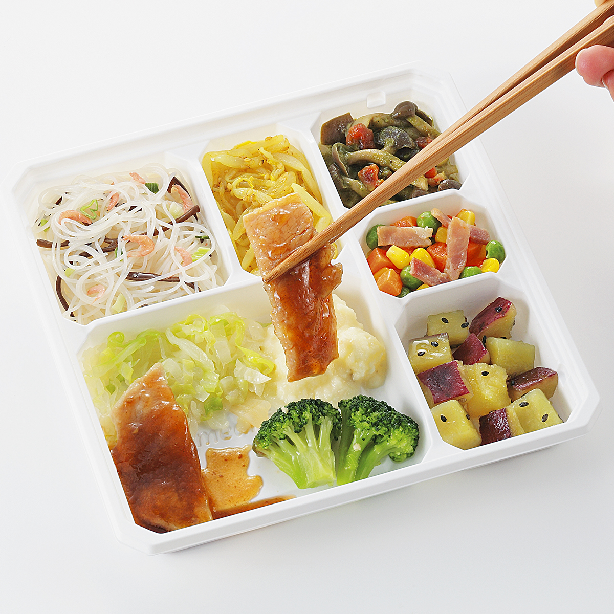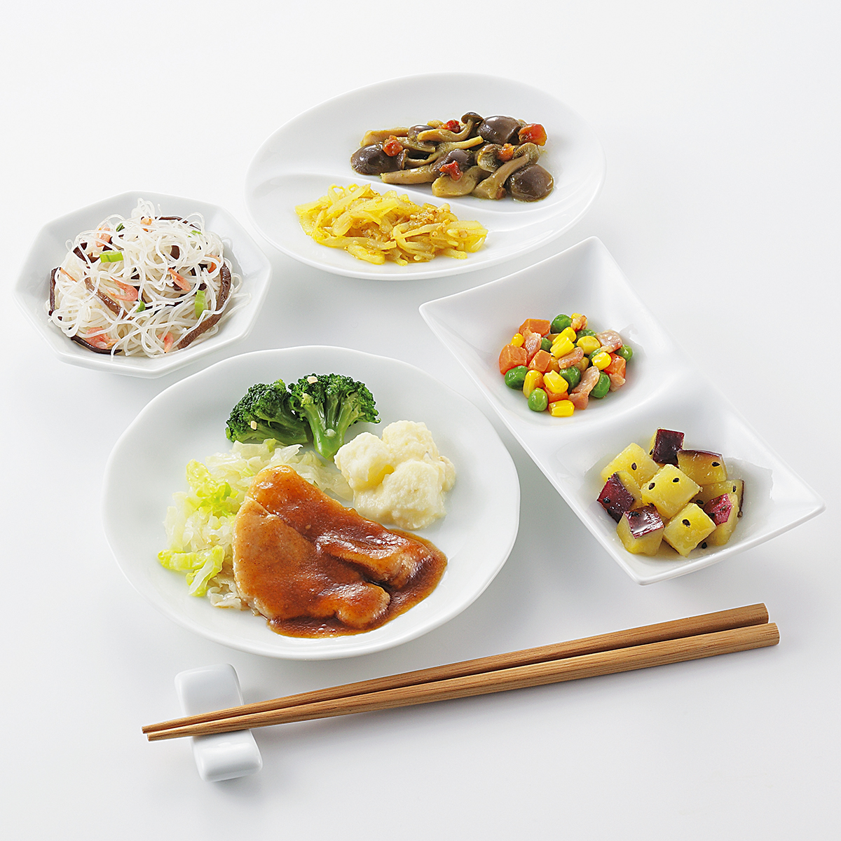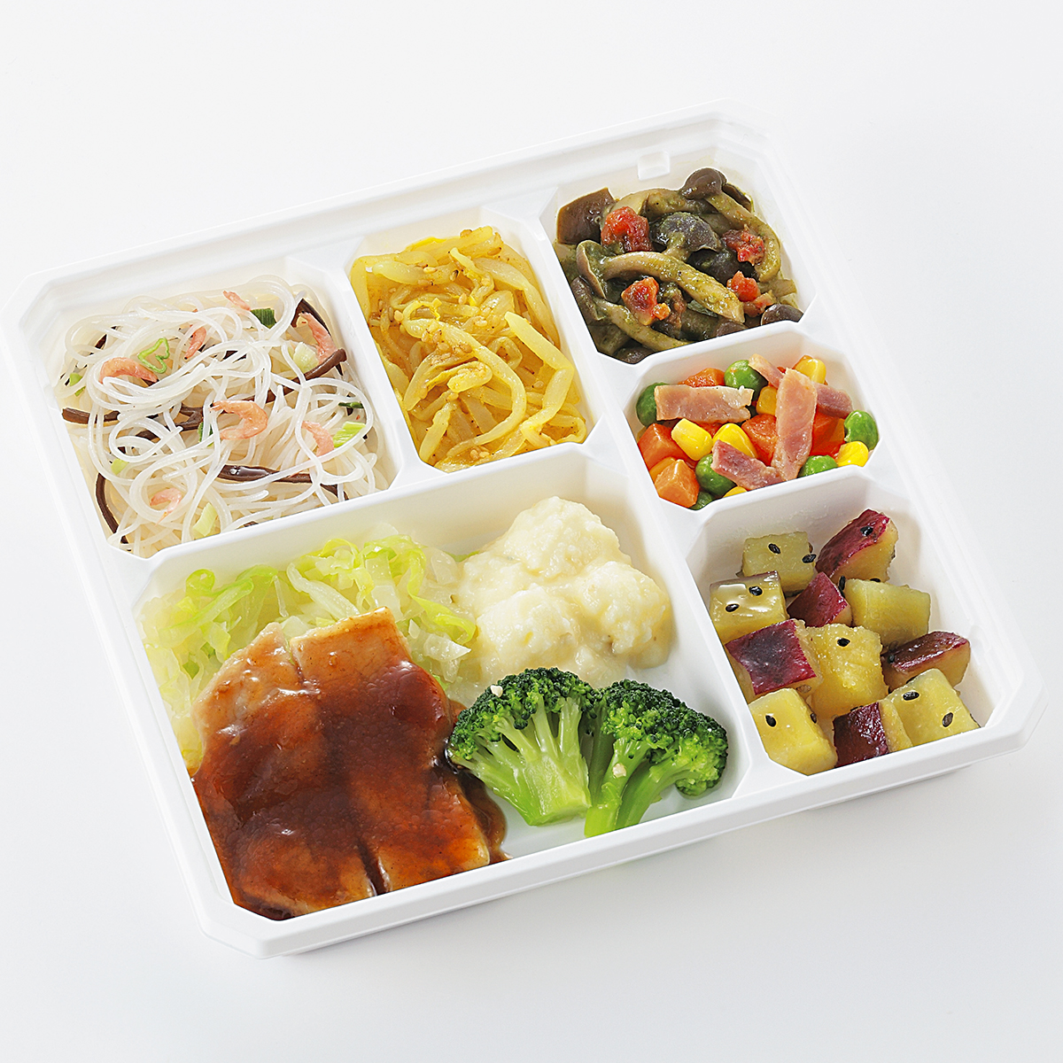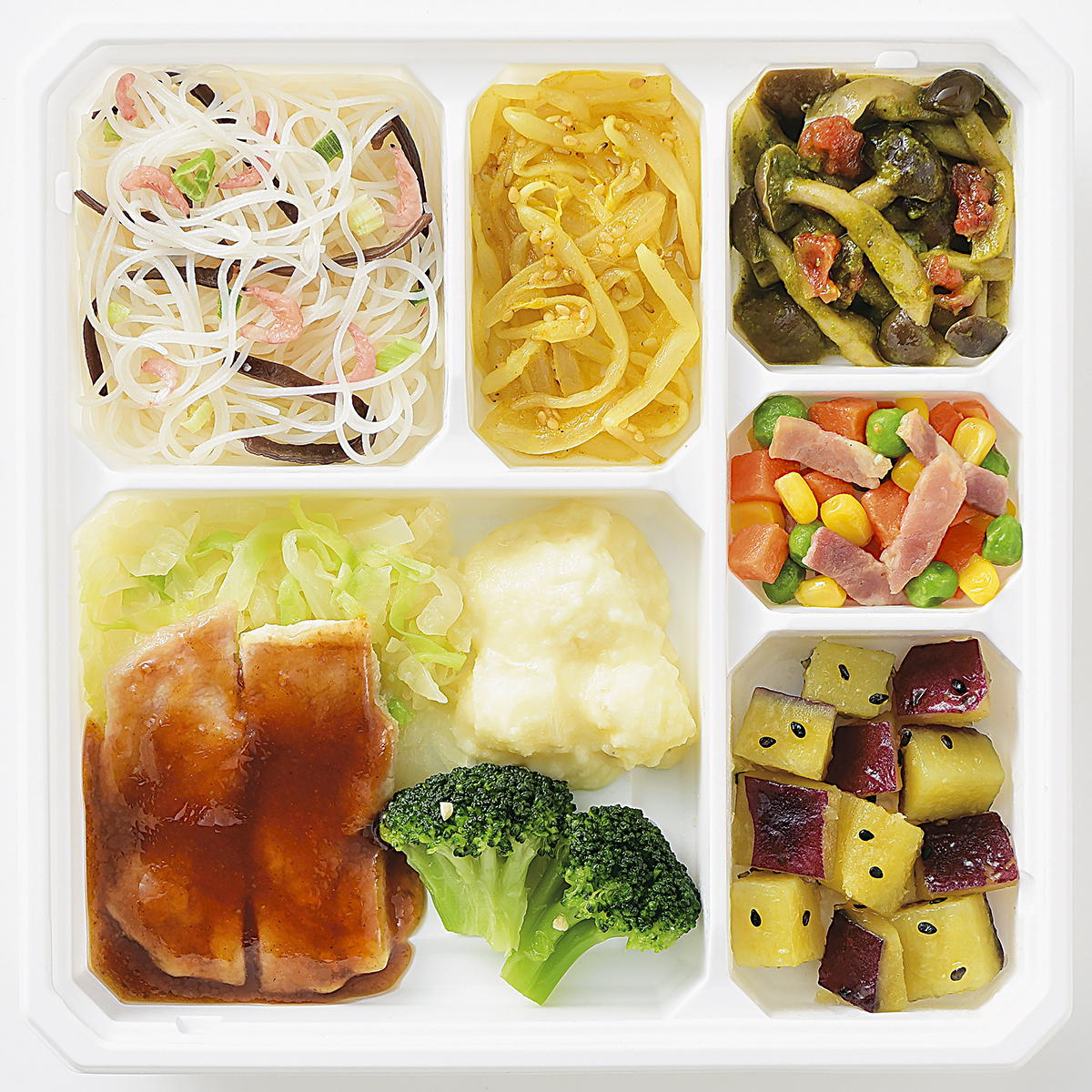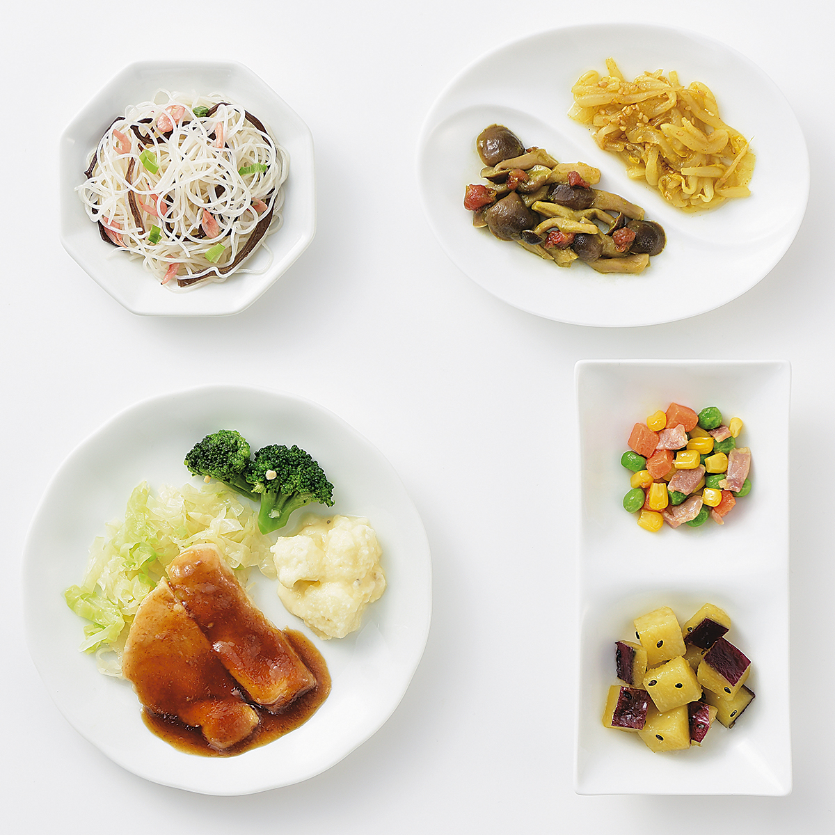 | 原材料名 | さつまいも、豚肉加工品、緑豆もやし、キャベツ、ブロッコリー、ミックスベジタブル(人参、コーン、グリンピース)、じゃがいも加工品、ぶなしめじ水煮、なたね油、ビーフン、じゃがいも、上白糖、玉ねぎ、マヨネーズ風ソース、ねぎ、トマト・ピューレー漬、ベーコン、ウスターソース、バジルソース、調合油(なたね油、ごま油)、ほうれん草ピューレー、バターフレーバーオイル、濃厚ソース、食塩、減塩醤油、煎り白ごま、りんごソース、おろしにんにく、顆粒洋風だし、乾燥きくらげ、果実調味料、乾燥小えび、カレー粉、煎り黒ごま、ごま油、にんにく、中華スープの素、ホタテエキスパウダー、白こしょう、黒こしょう/加工デンプン、糊料(加工デンプン、CMC、キサンタン)、調味料(アミノ酸等)、着色料(カラメル、紅麹、コチニール、カロチノイド)、トレハロース、pH調整剤、リン酸塩(Na)、乳化剤、香料、酸化防止剤(V.C)、酸味料、香辛料、発色剤(亜硝酸Na)、(一部に小麦・卵・乳成分・えび・牛肉・ごま・大豆・鶏肉・豚肉・りんご・ゼラチンを含む) | ||