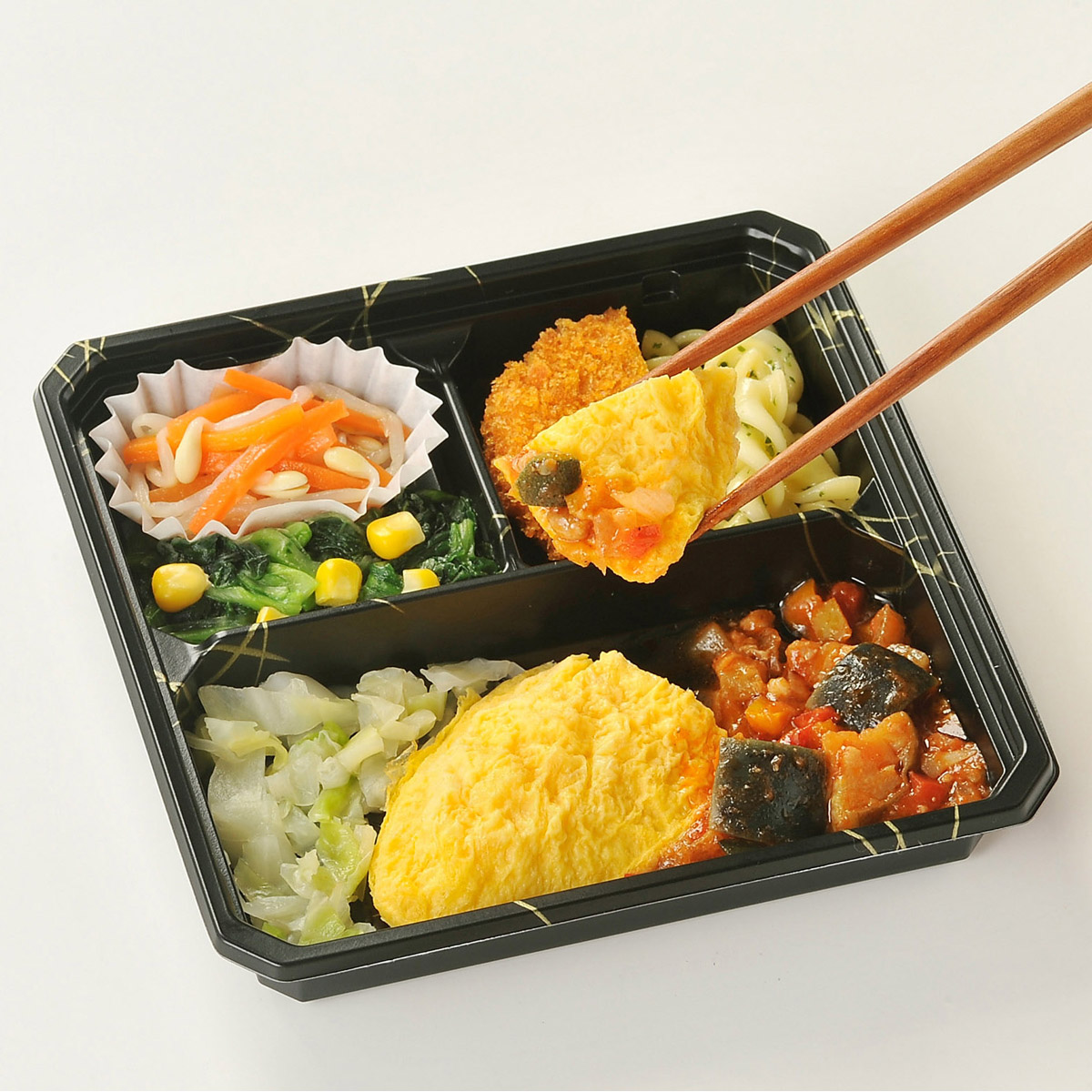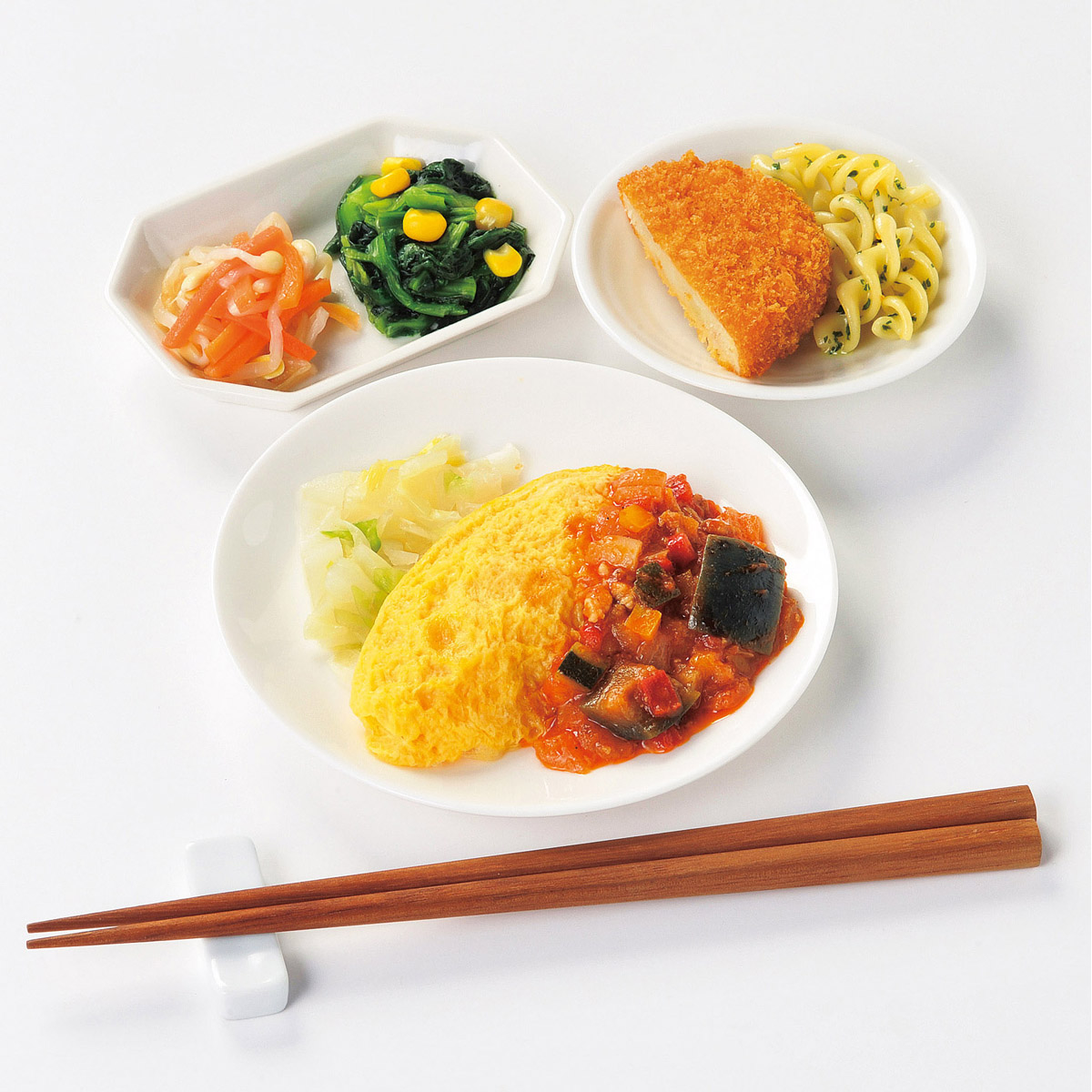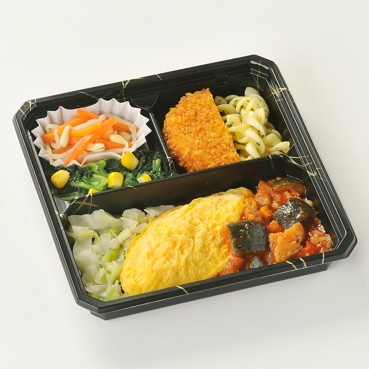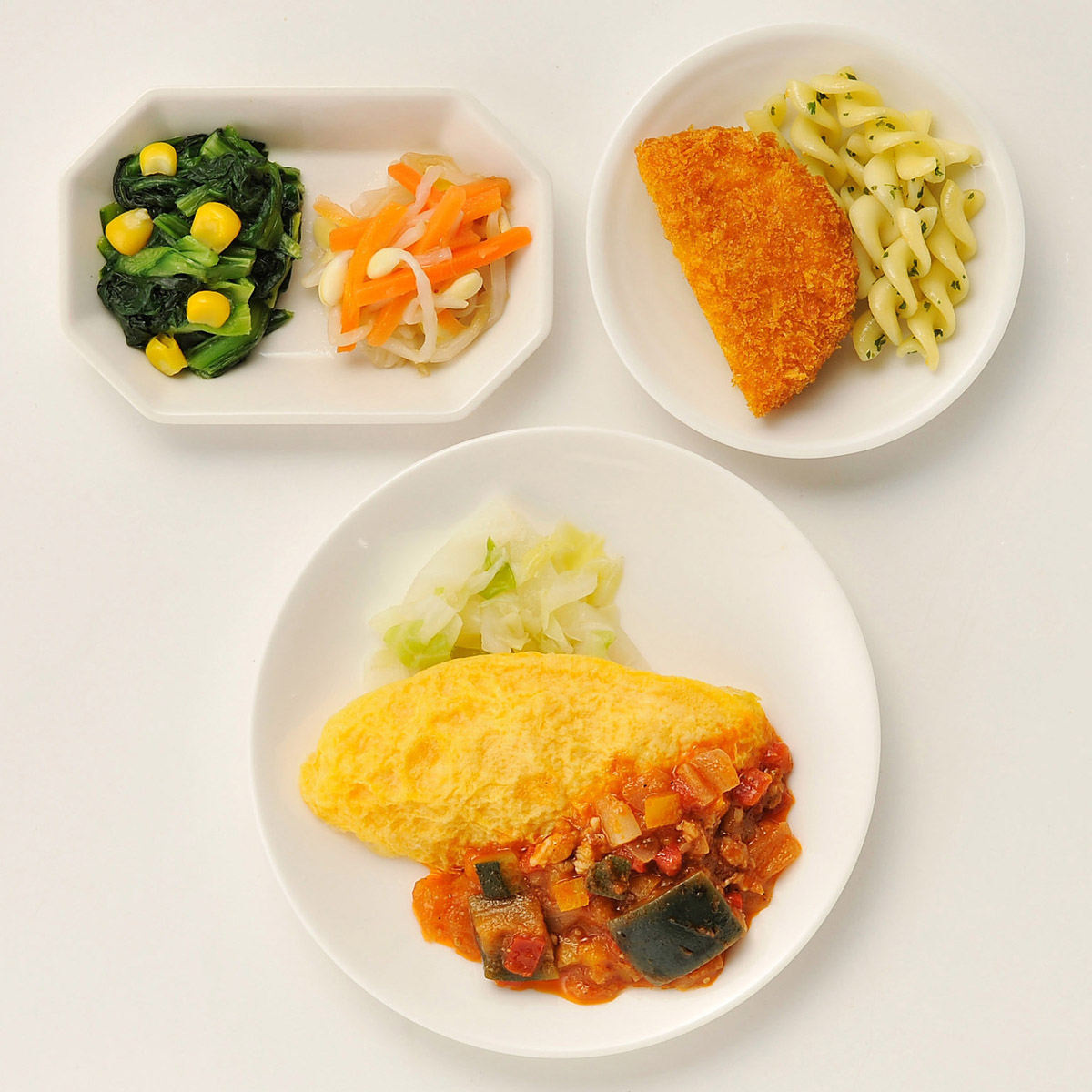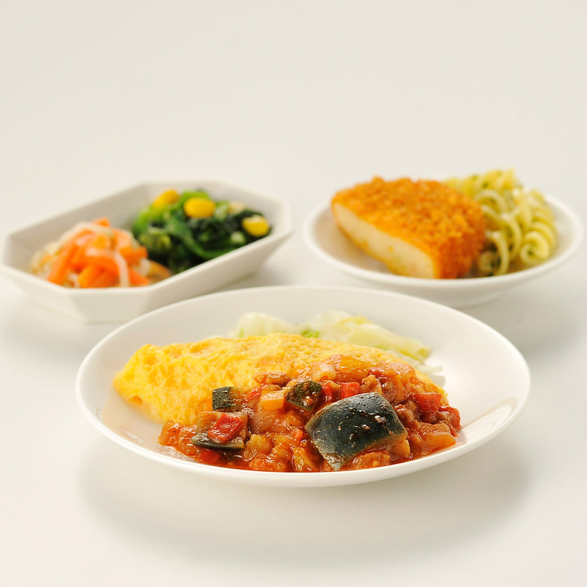 | 原材料名 | オムレツ(国内製造)、コロッケ、キャベツ、小松菜、トマトピューレー、人参、大豆もやし、マカロニ、ズッキーニ、黄ピーマン、玉ねぎ、赤ピーマン、揚げなす、大豆油、なたね油、豚肉、コーン、食塩、加工油脂、ごま油、おろしにんにく、バター風味油、パセリ、こしょう、バジル/増粘剤(加工でん粉、増粘多糖類)、調味料(アミノ酸等)、加工でん粉、香料、乳化剤、着色料(カロチノイド)、(一部に小麦・卵・乳成分・ごま・大豆・豚肉を含む) | ||