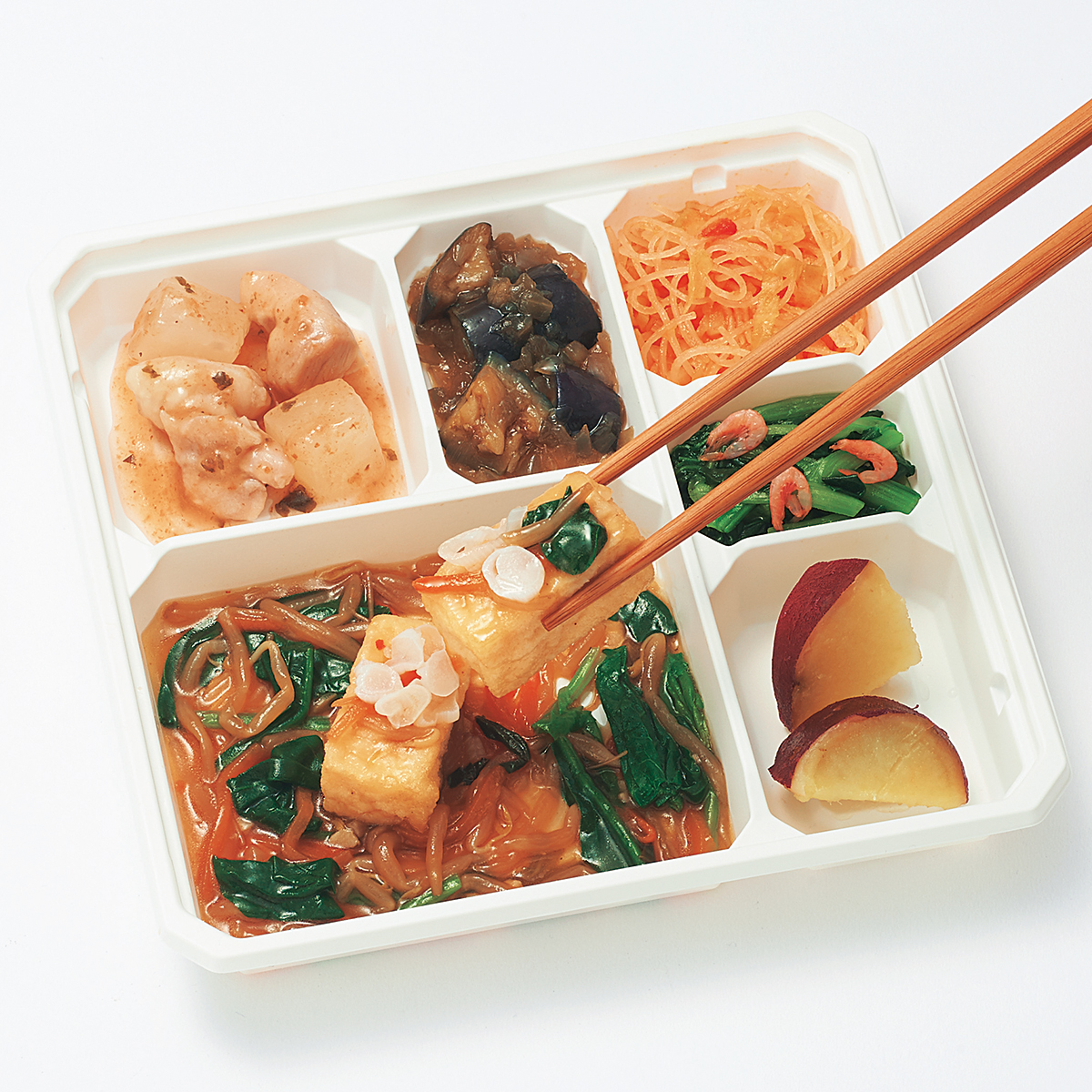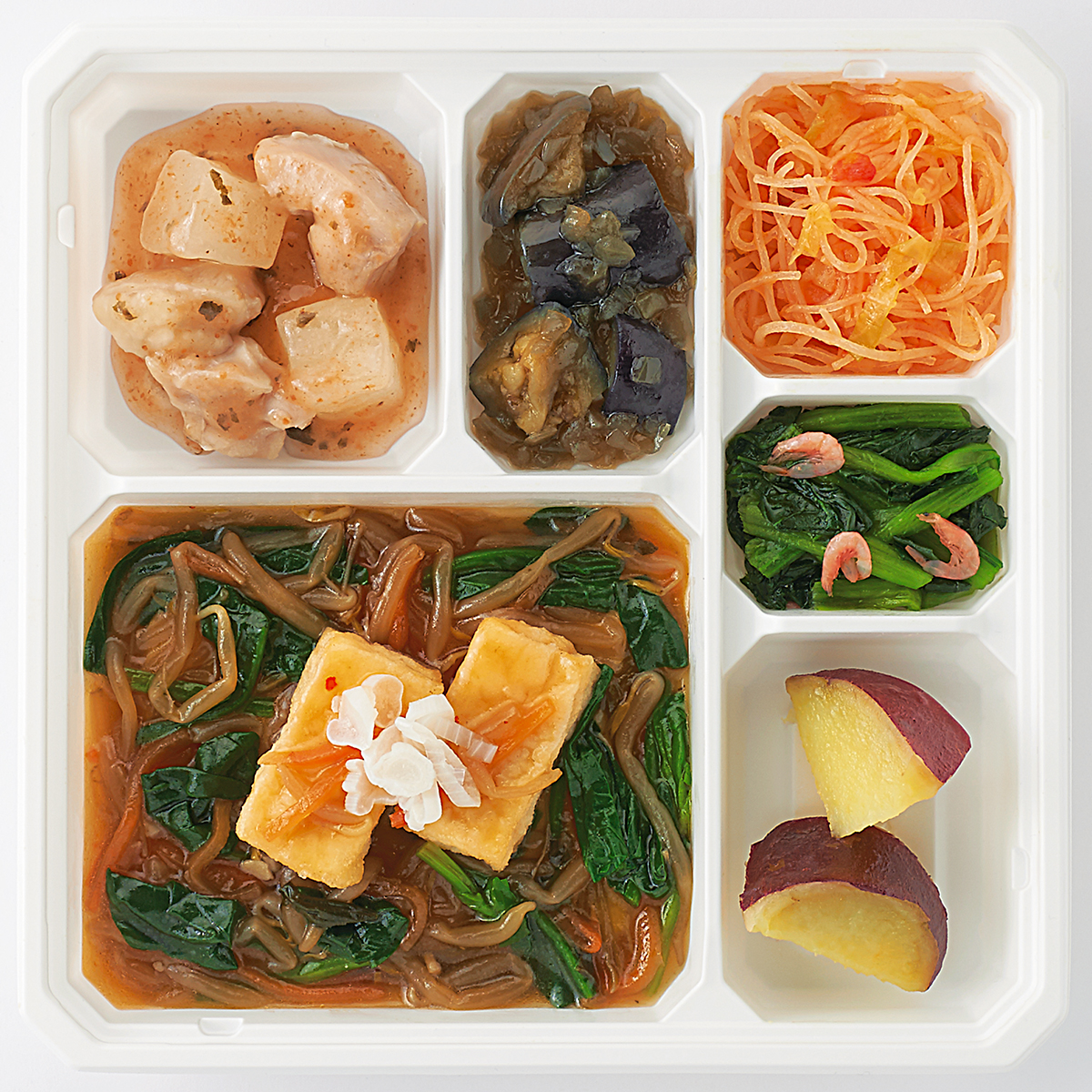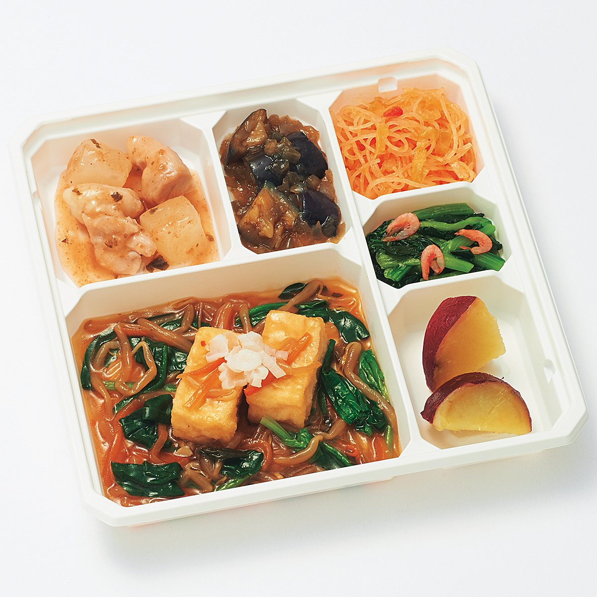 | 原材料名 | 揚げ出し豆腐(国内製造)、鶏肉、さつまいも、もやし、小松菜、揚げなす、ほうれん草、なたね油、大根、キャベツ、砂糖、減塩醤油、人参、玉ねぎ、本みりん、ねぎ、春雨、和風調味液、ケチャップ、しそ入り調味梅肉、ごま油、濃口醤油、トマト・ピューレー漬、にんにく、醸造酢、果実調味料、レモン果汁、顆粒和風だし、乾燥小えび、食塩、トウバンジャン/増粘剤(加工でん粉)、安定剤(加工でん粉)、豆腐用凝固剤、調味料(アミノ酸等)、pH調整剤、着色料(野菜色素、紅麹)、酸味料、マンニット、V.B1、甘味料(ステビア)、香料、(一部にえび・小麦・ごま・さば・大豆・鶏肉・魚醤(魚介類)を含む) | ||