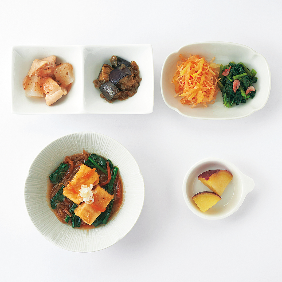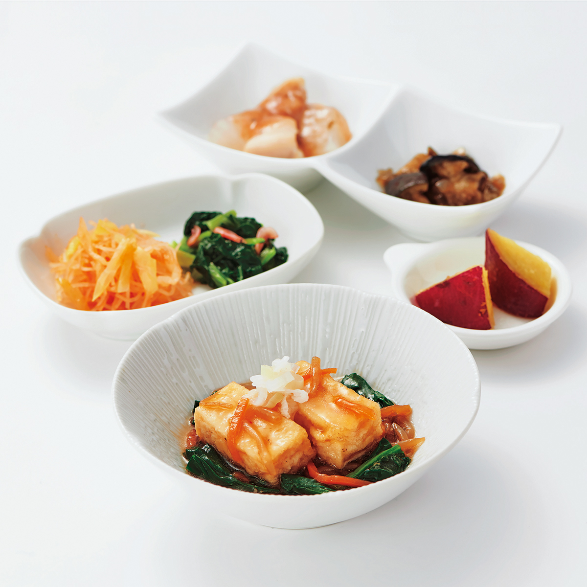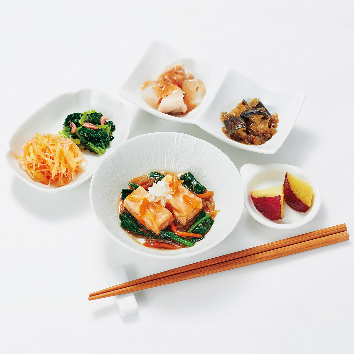 | 原材料名 | 揚げ出し豆腐(国内製造)、鶏肉、さつまいも、もやし、小松菜、揚げなす、ほうれん草、なたね油、大根、キャベツ、砂糖、減塩醤油、人参、玉ねぎ、本みりん、ねぎ、春雨、和風調味液、ケチャップ、しそ入り調味梅肉、ごま油、濃口醤油、トマト・ピューレー漬、にんにく、醸造酢、果実調味料、レモン果汁、顆粒和風だし、乾燥小えび、食塩、トウバンジャン/増粘剤(加工でん粉)、安定剤(加工でん粉)、豆腐用凝固剤、調味料(アミノ酸等)、pH調整剤、着色料(野菜色素、紅麹)、酸味料、マンニット、V.B1、甘味料(ステビア)、香料、(一部にえび・小麦・ごま・さば・大豆・鶏肉・魚醤(魚介類)を含む) | ||