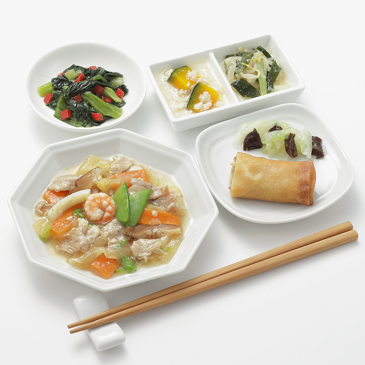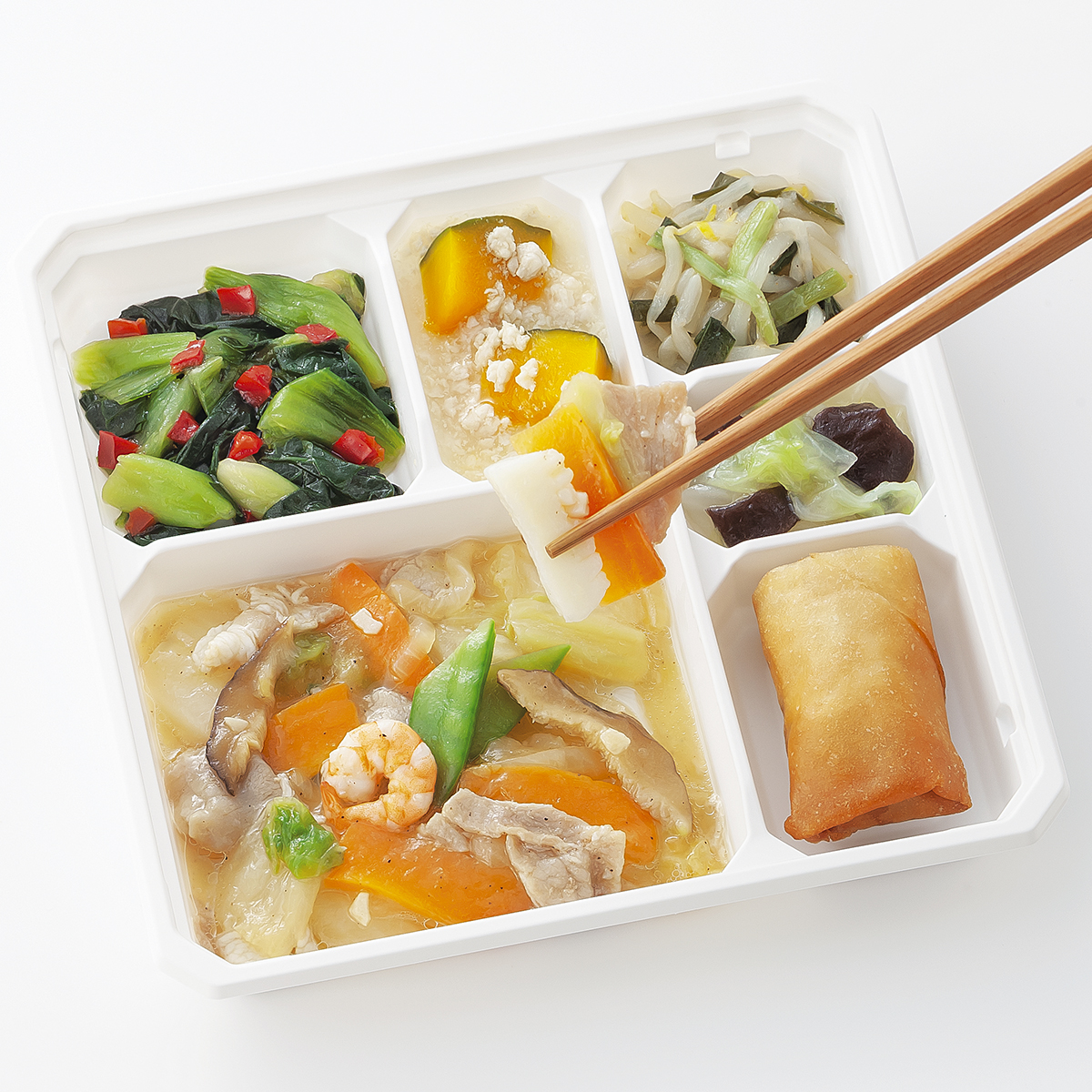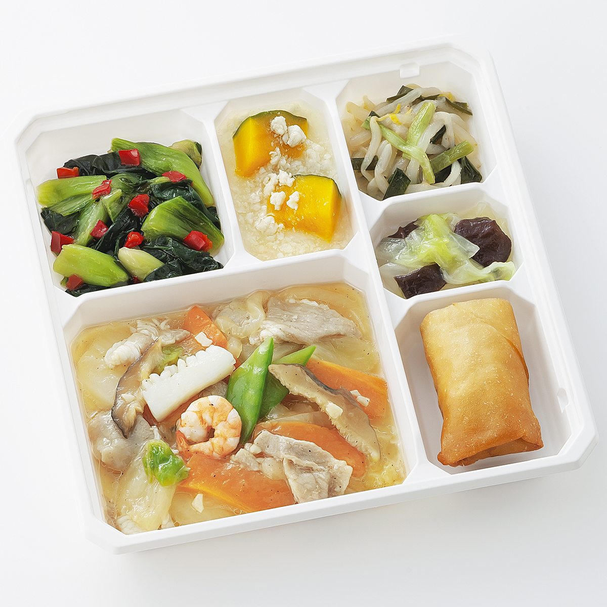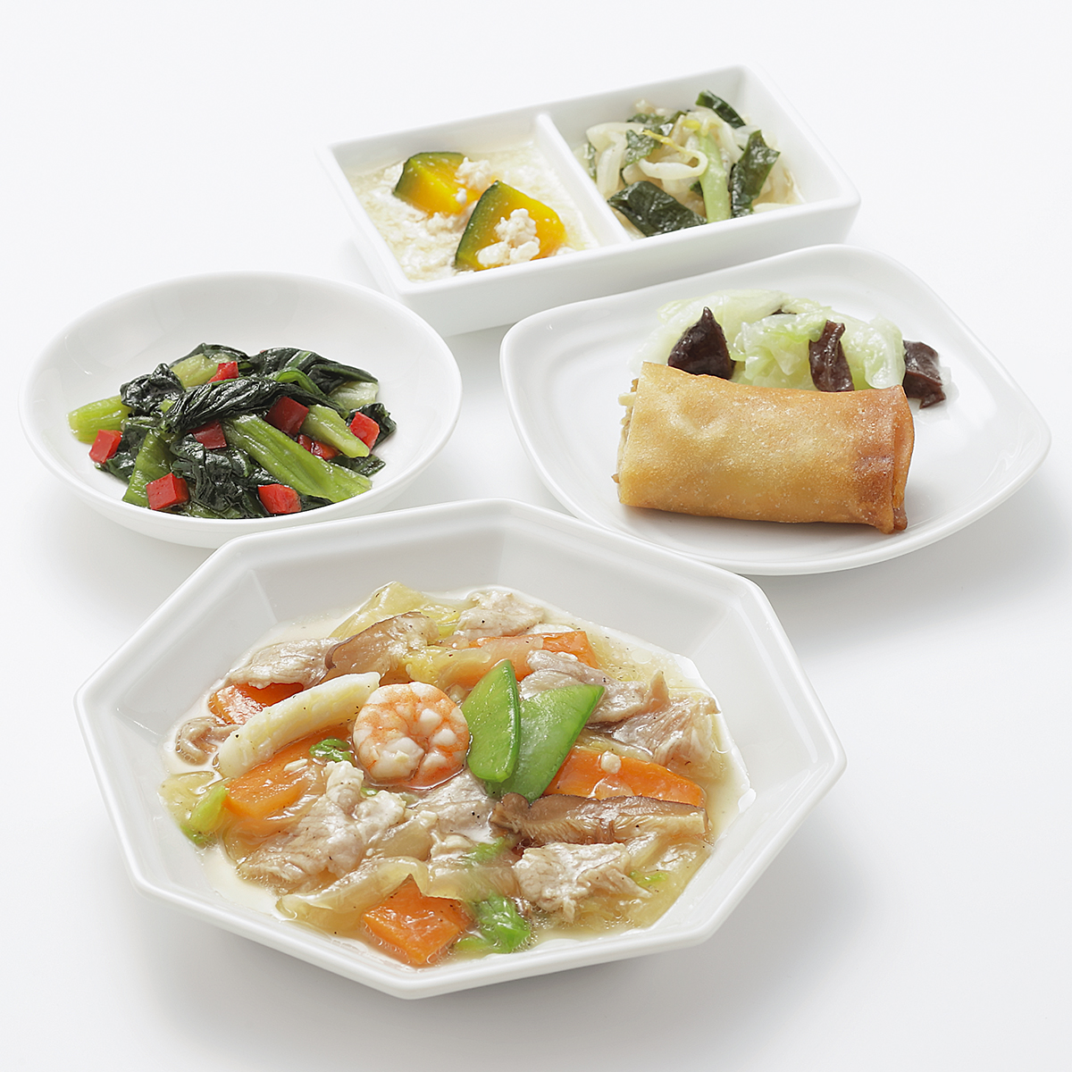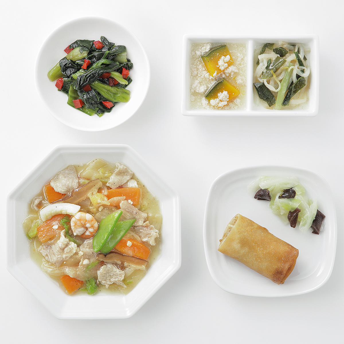| 原材料名 | 白菜、春巻、チンゲン菜、緑豆もやし、なたね油、玉ねぎ、豚肉、キャベツ、人参、かぼちゃ、いか下処理済、えび、キヌサヤ、鶏肉、にら、赤ピーマン、濃口醤油、顆粒中華風だし、乾燥しいたけ、清酒、淡口醤油、にんにく、すり白ごま、醸造酢、乾燥きくらげ、食塩、果実調味料、おろしにんにく、砂糖、本みりん、顆粒和風だし、豆板醤、黒こしょう、白こしょう/増粘剤(加工デンプン、キサンタン)、調味料(アミノ酸等)、ソルビット、加工デンプン、pH調整剤、乳化剤、カラメル色素、酸味料、(一部に小麦・えび・いか・牛肉・ごま・大豆・鶏肉・豚肉・ゼラチンを含む | ||
