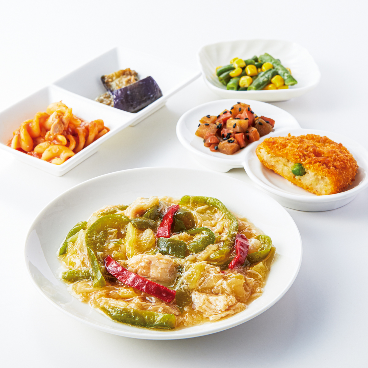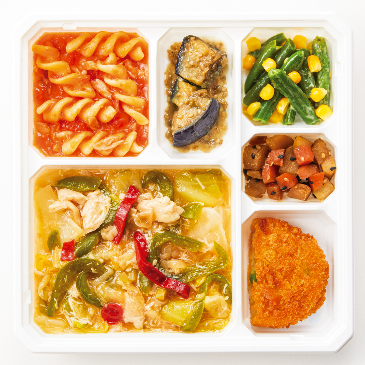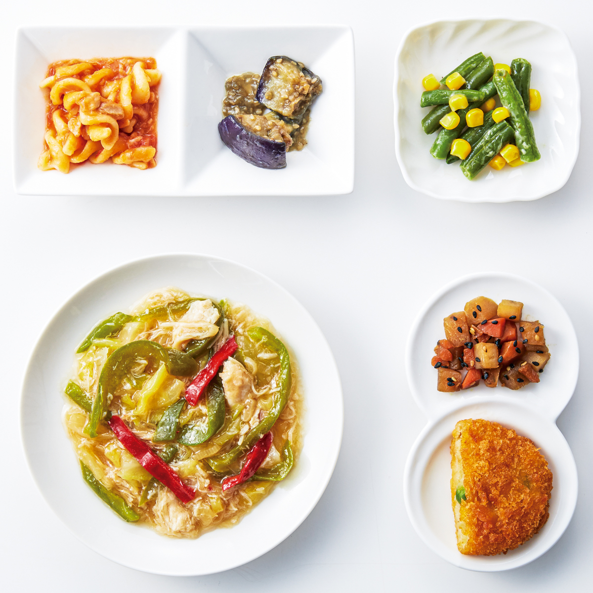 | 原材料名 | キャベツ(国産)、コロッケ、ピーマン、蒸し鶏、さやいんげん、揚げなす、じゃがいも、なたね油、赤ピーマン、大豆油、マカロニ、濃口醤油、砂糖、トマト・ピューレー漬、ねぎ、コーン、人参、ツナフレーク、ケチャップ、本みりん、みそ、減塩醤油、ごま、清酒、加工油脂、醸造酢、ごま油、生姜、ねりからし、食塩、顆粒洋風だし、にんにく、おろしにんにく、顆粒和風だし、こしょう/増粘剤(加工でん粉、増粘多糖類)、調味料(アミノ酸等)、酒精、ポリリン酸Na、酸化防止剤(V.C)、加工でん粉、酸味料、着色料(ウコン、カロチノイド)、香辛料、乳化剤、(一部に小麦・卵・乳成分・牛肉・ごま・大豆・鶏肉を含む) | ||