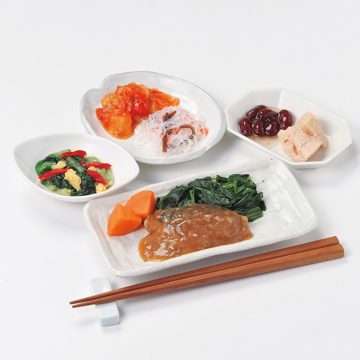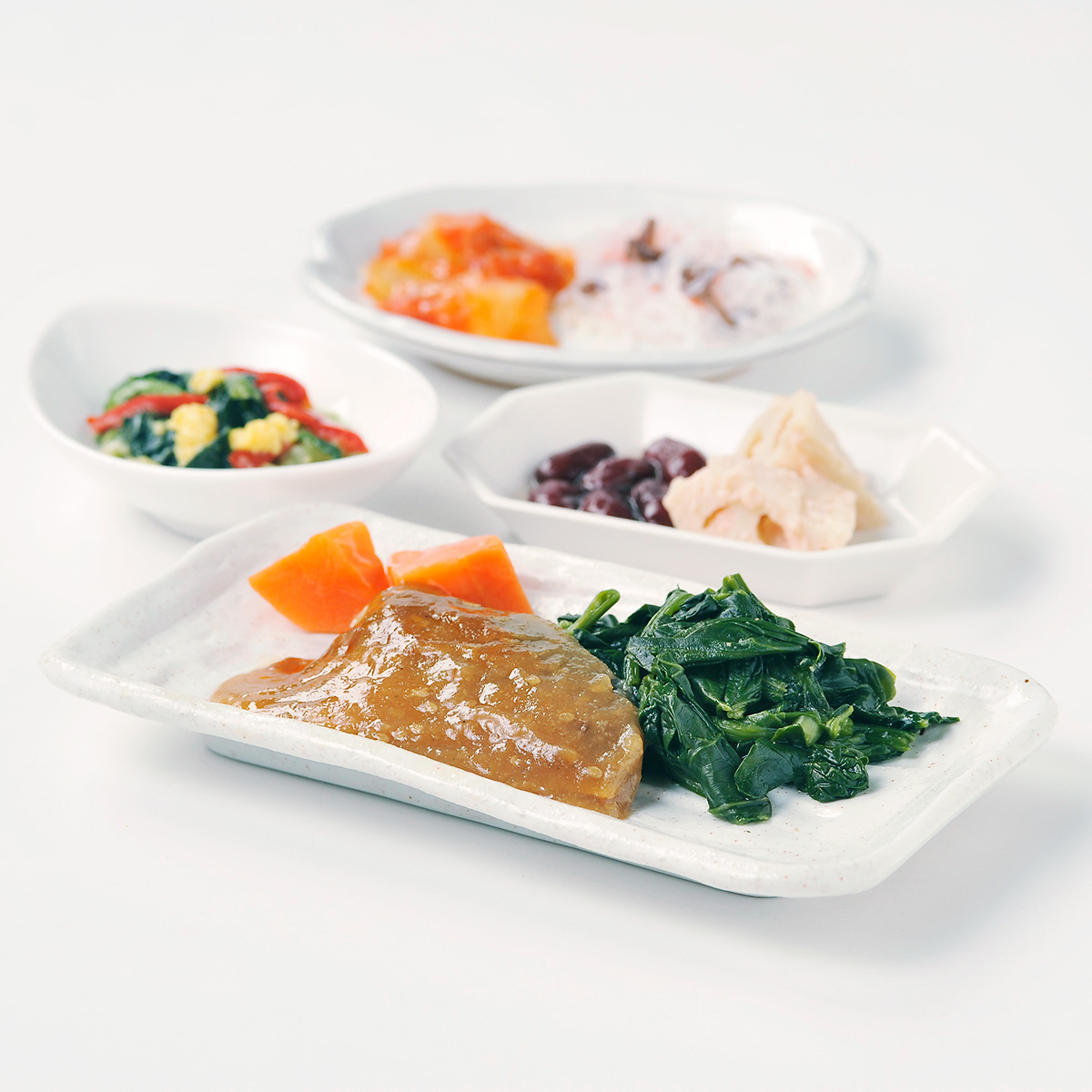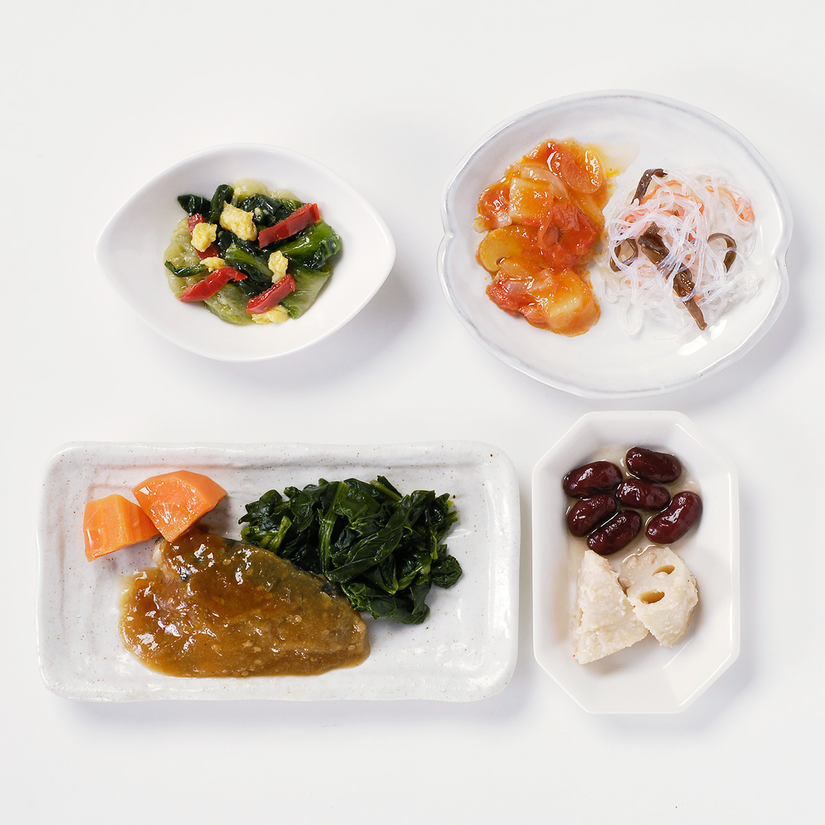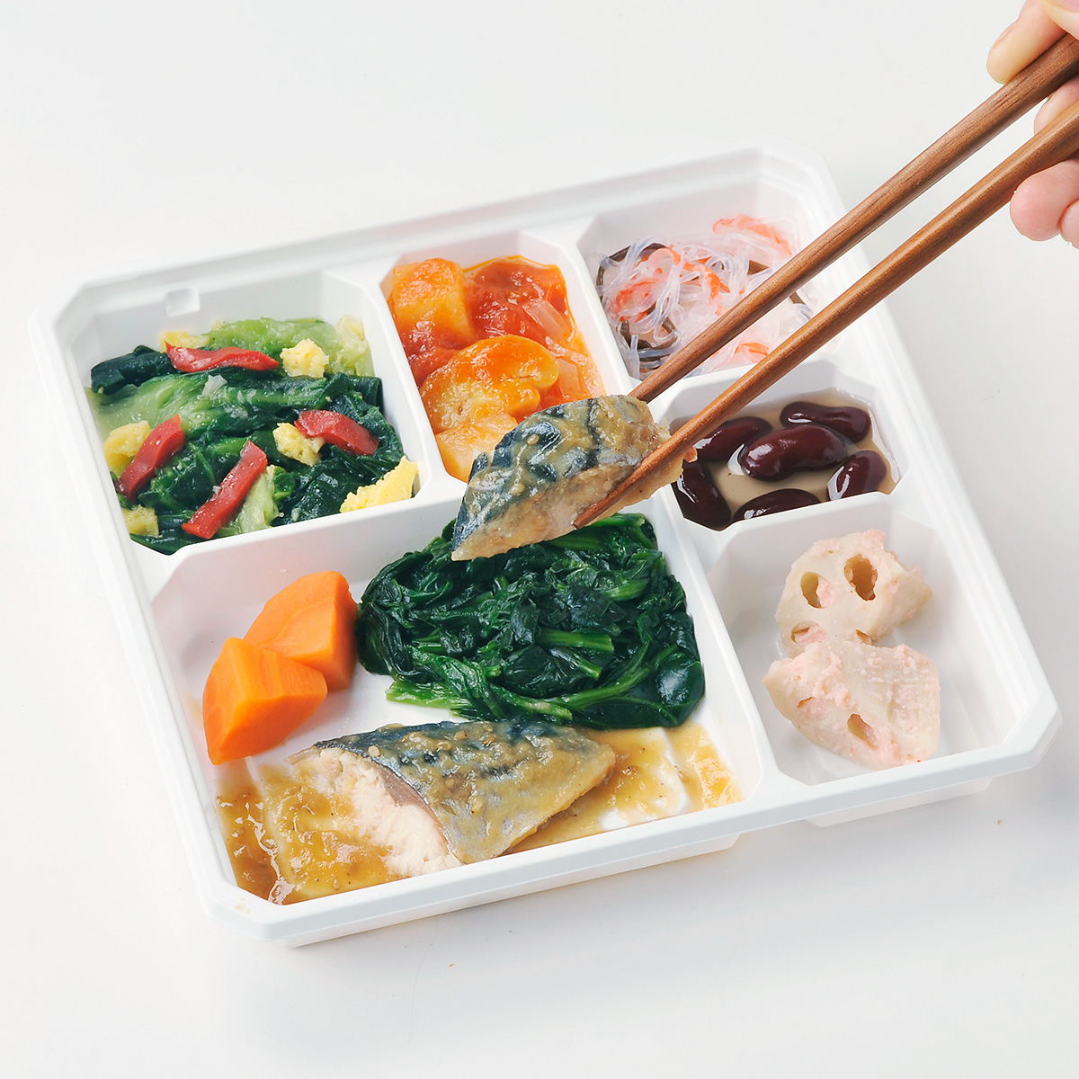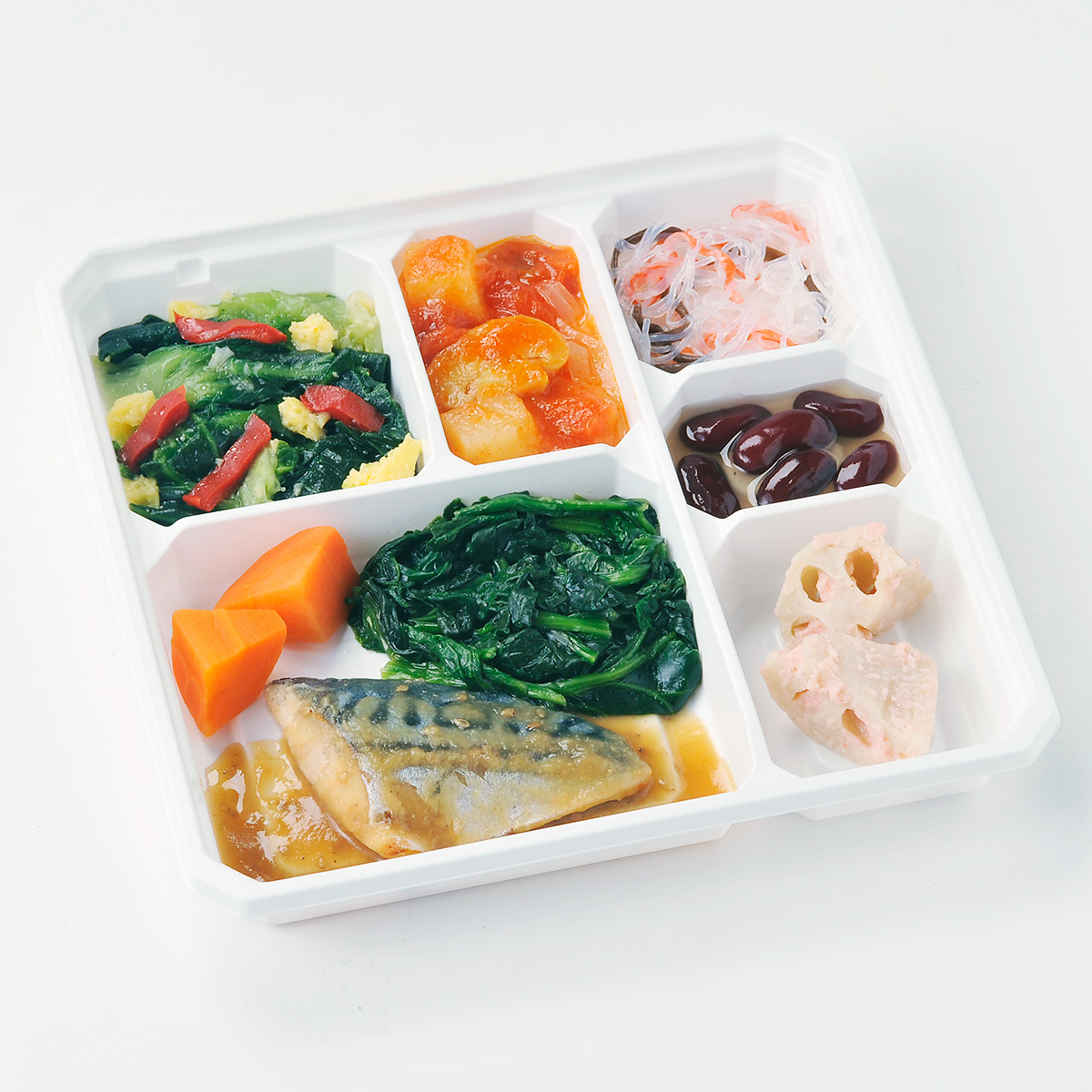 | 原材料名 | さば、ほうれん草、チンゲン菜、れんこん、砂糖、人参、味噌、なたね油、ゆで赤インゲン豆、炒り卵、赤ピーマン、じゃがいも、トマト・ピューレー漬、清酒、マッシュルーム、春雨、玉ねぎ、かに風味かまぼこ、たらこ、減塩醤油、本みりん、牛乳、ケチャップ、ホワイトソース、はちみつ、乾燥きくらげ、おろししょうが、すり白ごま、煎り白ごま、顆粒和風だし、顆粒中華風だし、食塩、大豆油、顆粒洋風だし、おろしにんにく、ゼラチン、白こしょう/増粘剤(加工デンプン、キサンタン)、加工デンプン、調味料(アミノ酸等)、着色料(紅麹)、酢酸Na、酸味料、ソルビット、マンニット、グリシン、pH調整剤、香料、(一部に小麦・卵・乳成分・かに・牛肉・ごま・さば・大豆・鶏肉・豚肉・ゼラチンを含む) | ||