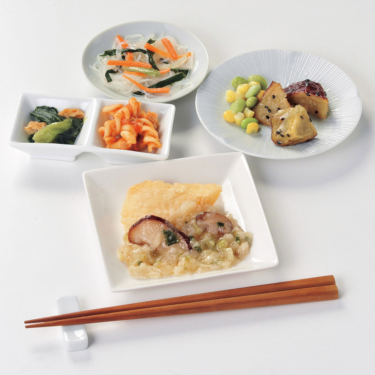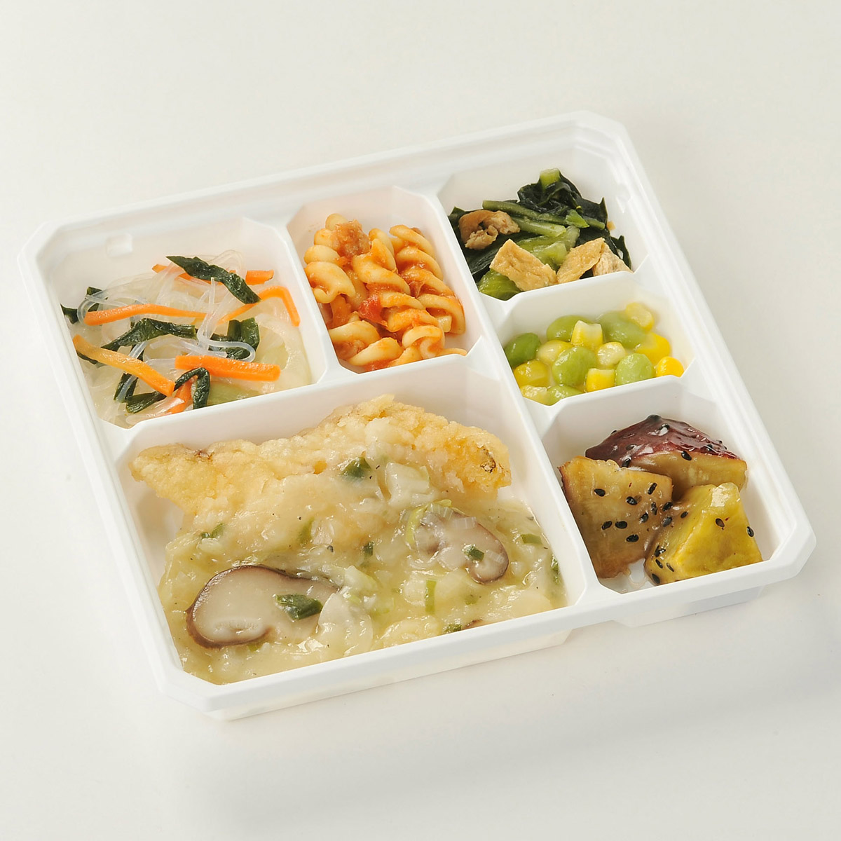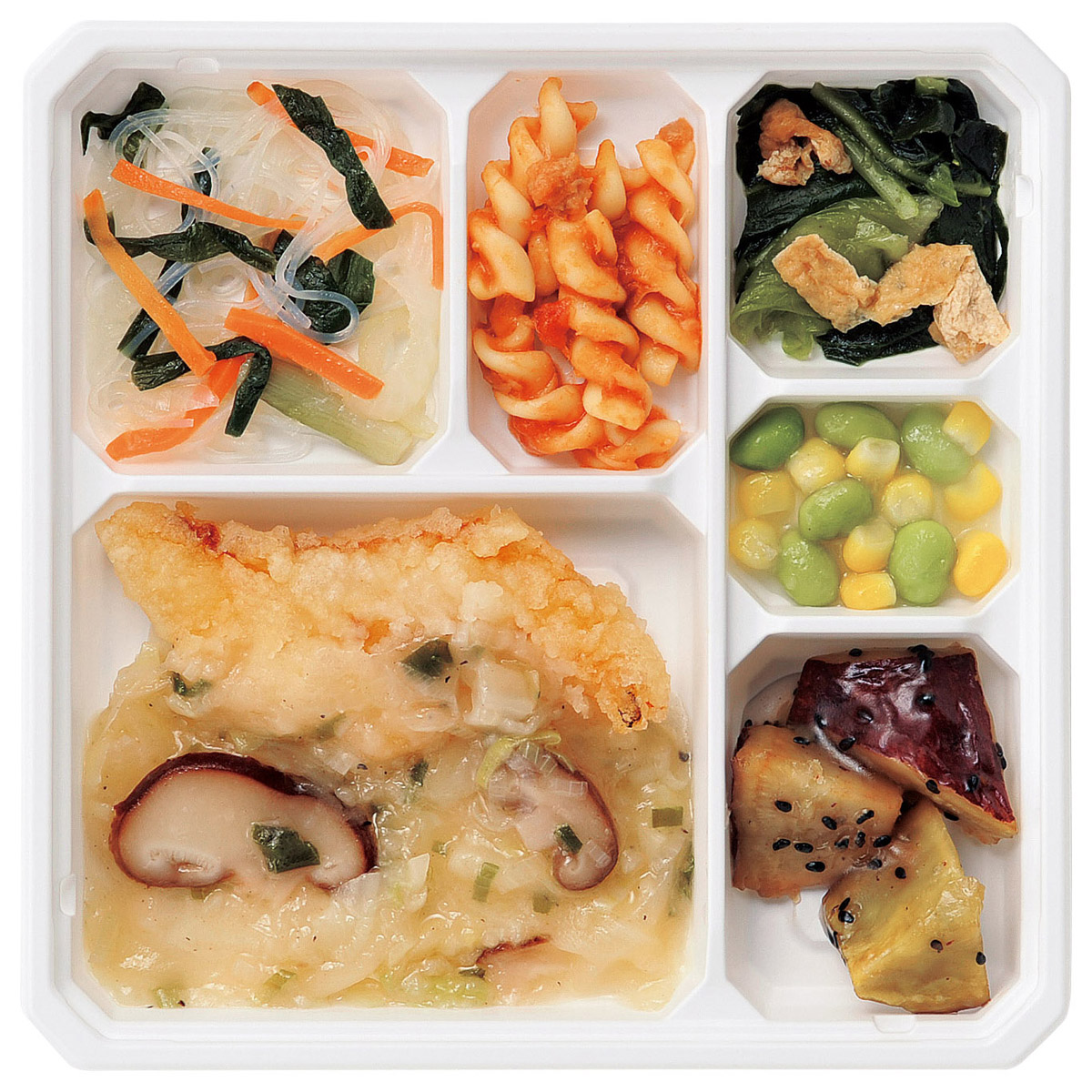| 原材料名 | さつまいも、カレイ、チンゲン菜、なたね油、玉ねぎ、ねぎ、キャベツ、コーン、にら、人参、上白糖、枝豆、しいたけ、春雨、油揚げ、マカロニ、トマト・トマトジュース漬、ごま油、ツナフレーク、ケチャップ、顆粒和風だし、食塩、発酵調味料、大豆油、三温糖、カツオ削りぶし、中華スープの素、煎り黒ごま、顆粒洋風だし、おろしにんにく、顆粒中華風だし、白こしょう/加工デンプン、増粘剤(加工デンプン、増粘多糖類)、調味料(アミノ酸等)、酸味料、pH調整剤、(一部に小麦・乳成分・牛肉・ごま・大豆・鶏肉・豚肉・ゼラチンを含む) | ||