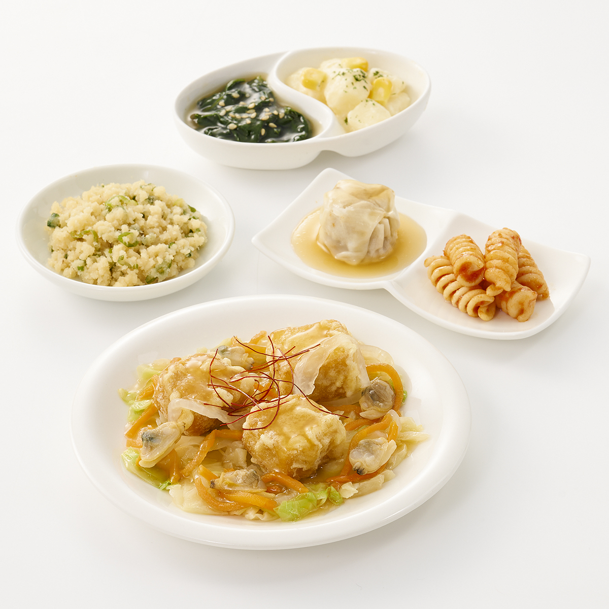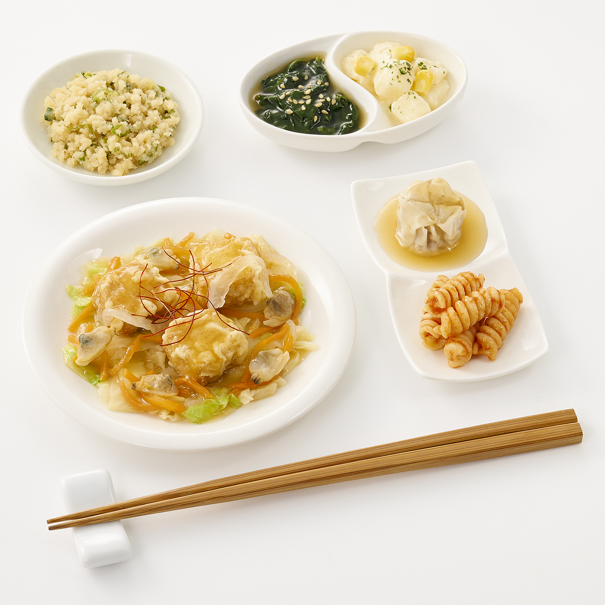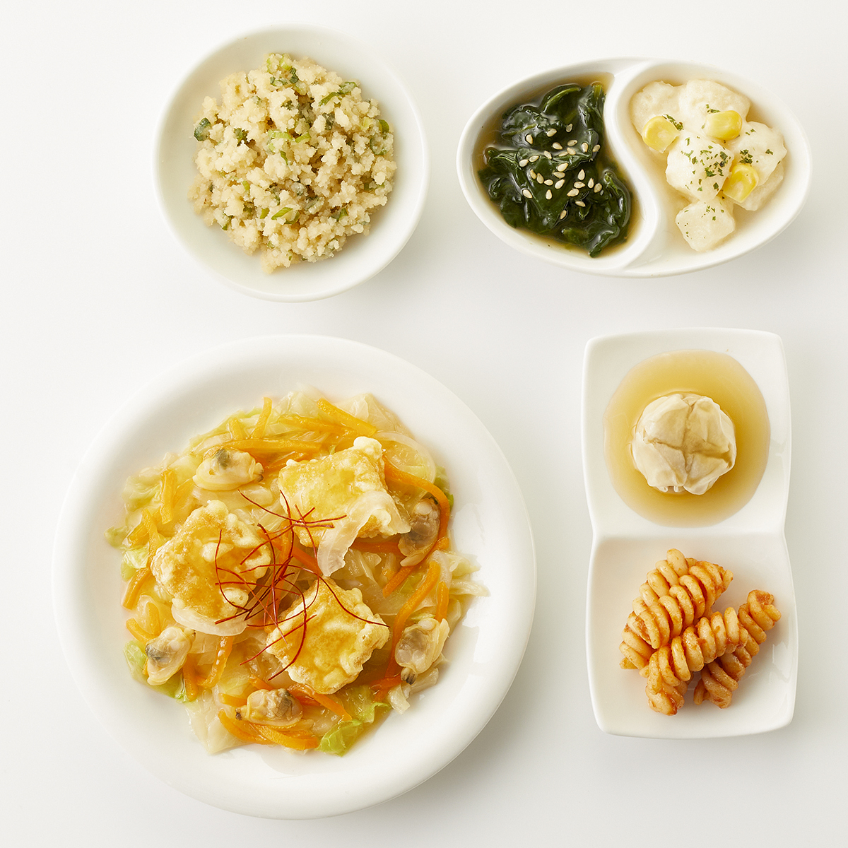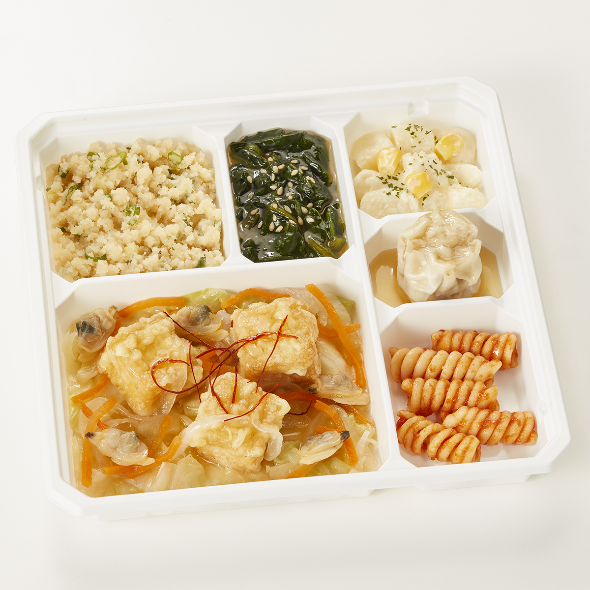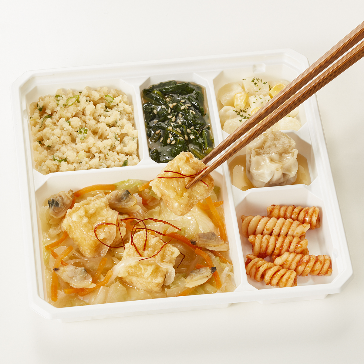 | 原材料名 | キャベツ(日本産)、ポテトサラダ、厚揚げ豆腐、マカロニ、シュウマイ、ほうれん草、ケチャップ、あさり(中国産)、人参、砂糖、みりん風調味料、天ぷら粉、発酵調味料、植物油、おから、半固体状ドレッシング、醤油、ねぎ、加工酢、玉ねぎ、醤油だし、とうもろこし、風味調味料、糸唐辛子、ごま、パセリ、食塩、還元でん粉加水分解物/加工でん粉、糊料(加工でん粉、増粘多糖類)、トレハロース、調味料(アミノ酸等)、凝固剤、膨張剤、pH調整剤、グリシン、乳化剤、酵素、着色料(カラメル、カロチノイド)、酸味料、香辛料、(一部に小麦・卵・乳成分・えび・かに・ごま・さば・ゼラチン・大豆・鶏肉・豚肉・りんごを含む) | ||