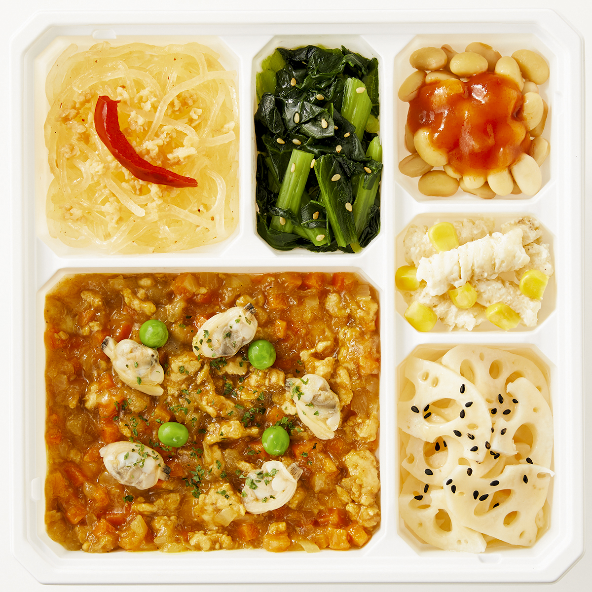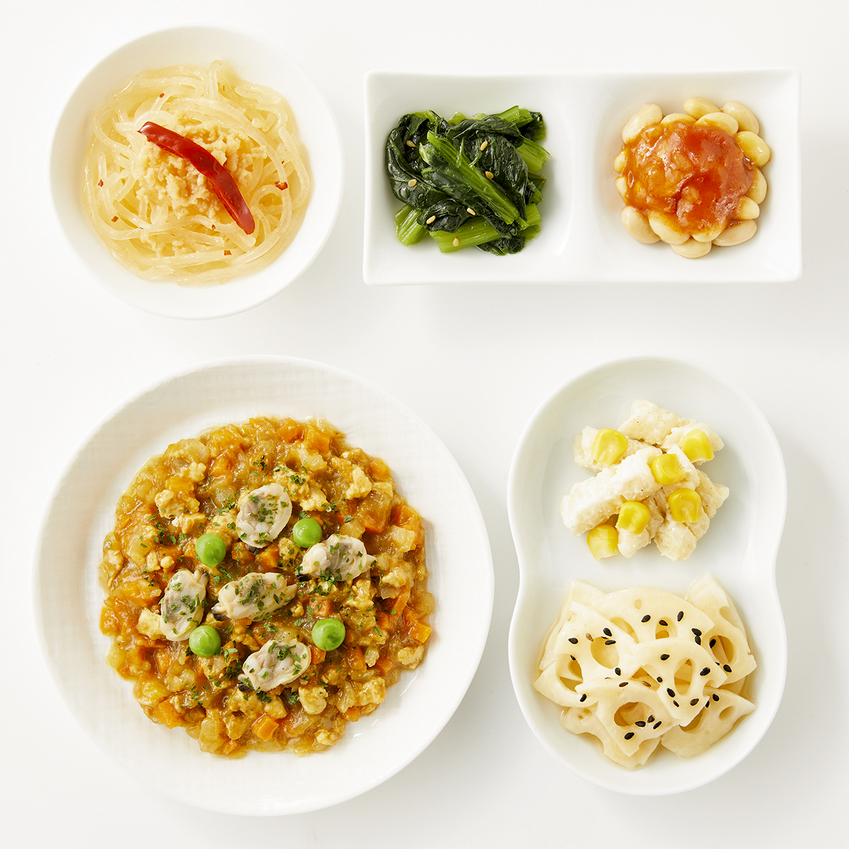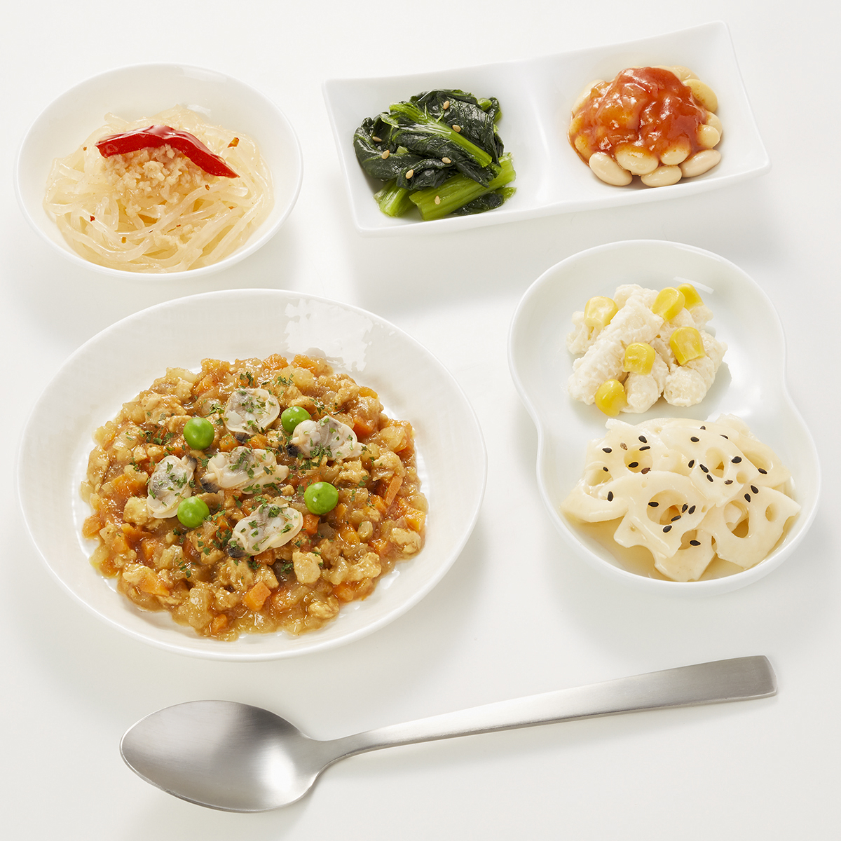 | 原材料名 | 玉ねぎ(日本産)、はるさめ、れんこん水煮(中国産)、小松菜、人参、鶏ひき肉、マカロニ、水煮大豆、半固体状ドレッシング、植物油、あさり(中国産)、カレーフレーク、コーン、ピーマン、トマト味付ソース、ケチャップ、グリーンピース、大豆加工品、醤油、粉末調味料、調合ごま油、砂糖、醤油だし、みりん風調味料、ごま、パセリ、トウバンジャン、食塩、塩こしょう、発酵調味料、還元でん粉加水分解物/糊料(加工でん粉、CMC、増粘多糖類)、調味料(アミノ酸等)、着色料(カラメル)、ミョウバン、pH調整剤、酸化防止剤(V.C、亜硫酸塩、V.E、チャ抽出物)、酸味料、乳酸Ca、乳化剤、塩化Ca、酒精、香料、香辛料、(一部に小麦・卵・乳成分・オレンジ・牛肉・ごま・さば・ゼラチン・大豆・鶏肉・豚肉・やまいも・りんごを含む) | ||