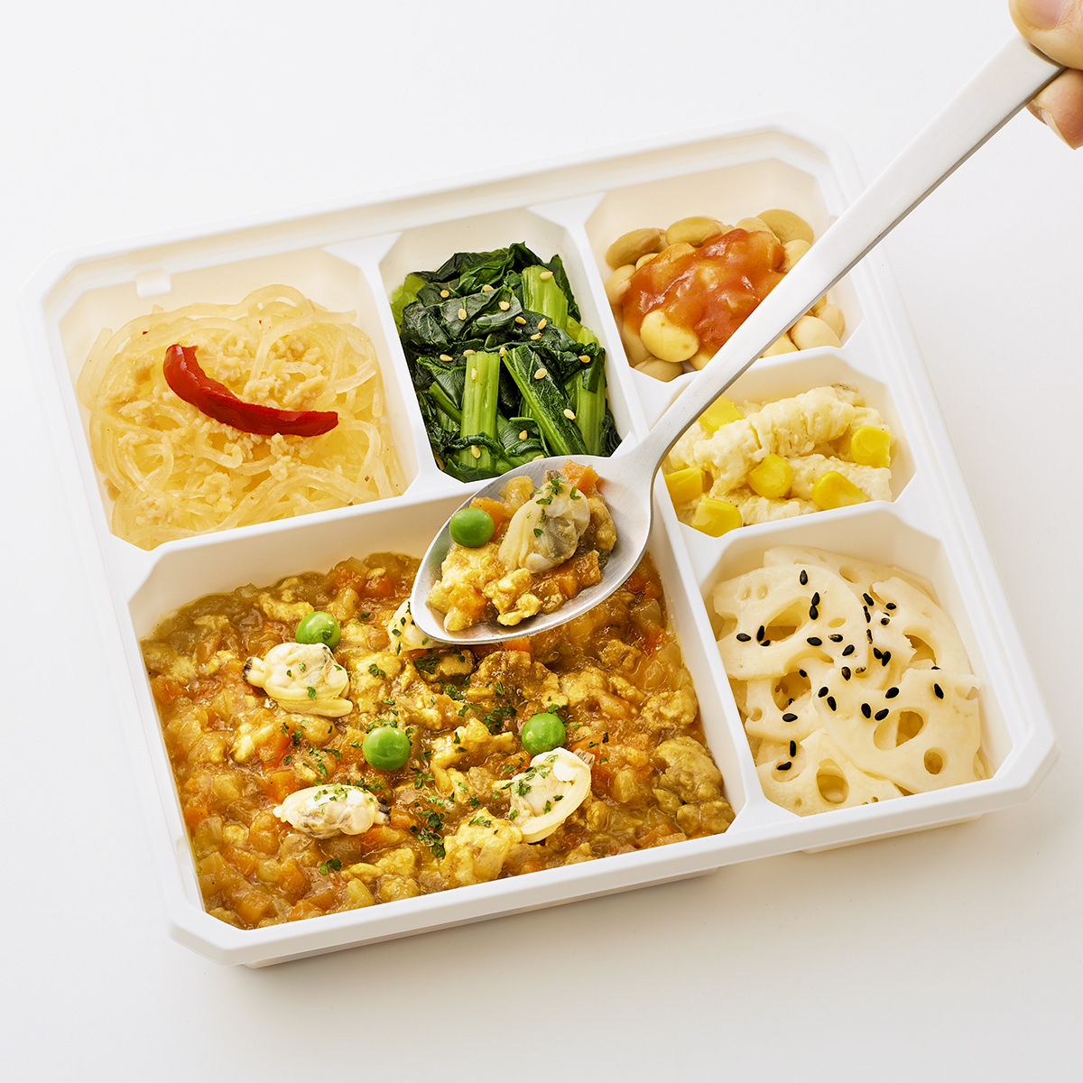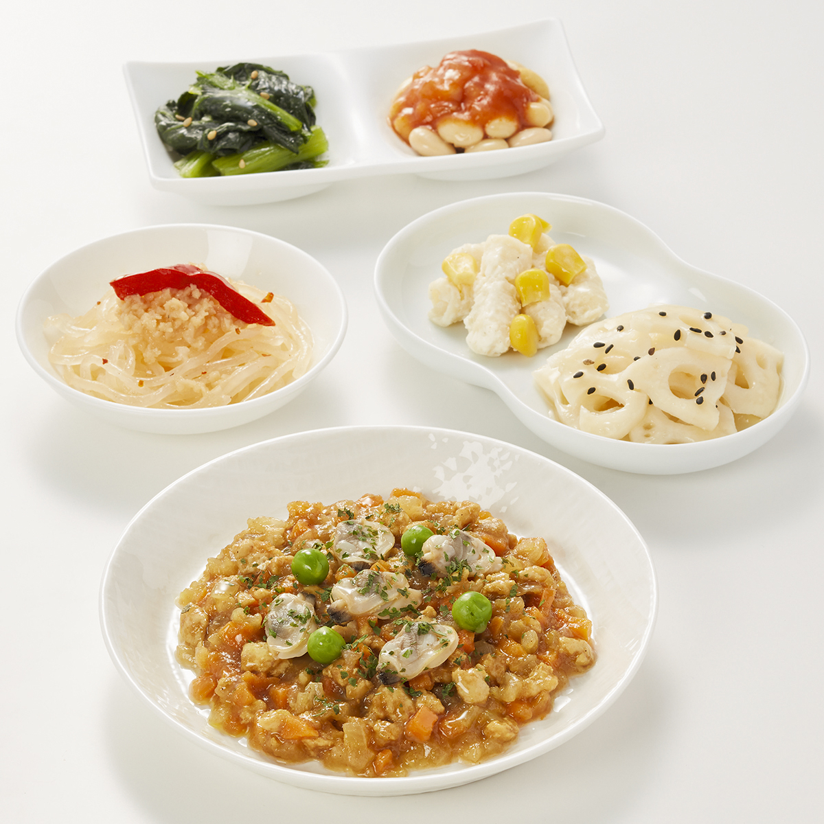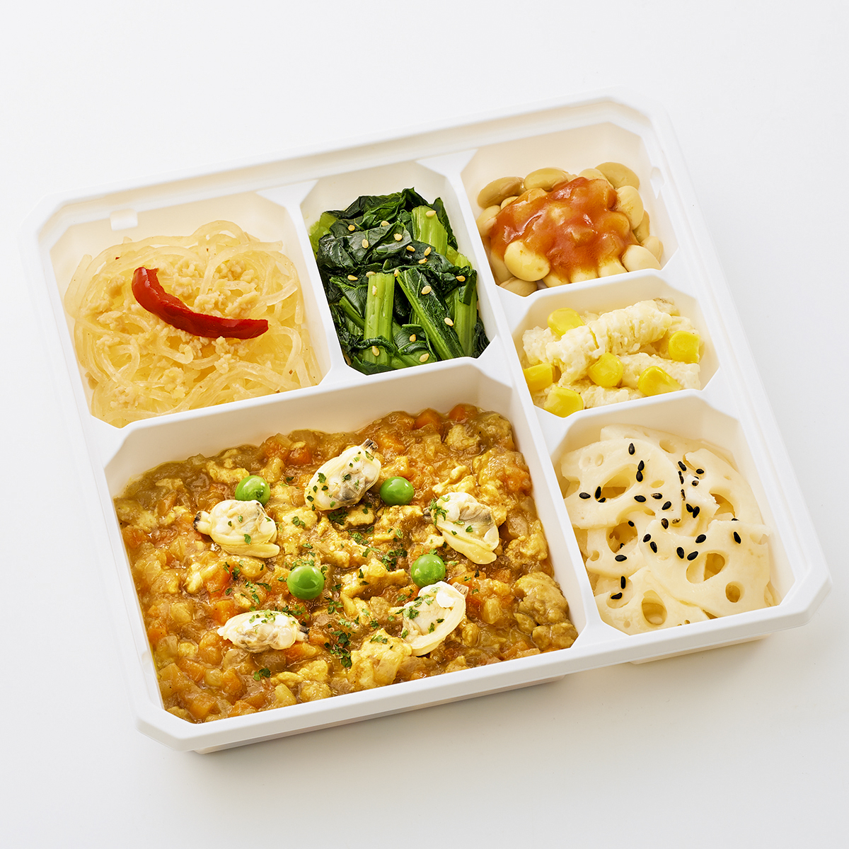 | 原材料名 | 玉ねぎ(日本産)、はるさめ、れんこん水煮(中国産)、小松菜、人参、鶏ひき肉、マカロニ、水煮大豆、半固体状ドレッシング、植物油、あさり(中国産)、カレーフレーク、コーン、ピーマン、トマト味付ソース、ケチャップ、グリーンピース、大豆加工品、醤油、粉末調味料、調合ごま油、砂糖、醤油だし、みりん風調味料、ごま、パセリ、トウバンジャン、食塩、塩こしょう、発酵調味料、還元でん粉加水分解物/糊料(加工でん粉、CMC、増粘多糖類)、調味料(アミノ酸等)、着色料(カラメル)、ミョウバン、pH調整剤、酸化防止剤(V.C、亜硫酸塩、V.E、チャ抽出物)、酸味料、乳酸Ca、乳化剤、塩化Ca、酒精、香料、香辛料、(一部に小麦・卵・乳成分・オレンジ・牛肉・ごま・さば・ゼラチン・大豆・鶏肉・豚肉・やまいも・りんごを含む) | ||