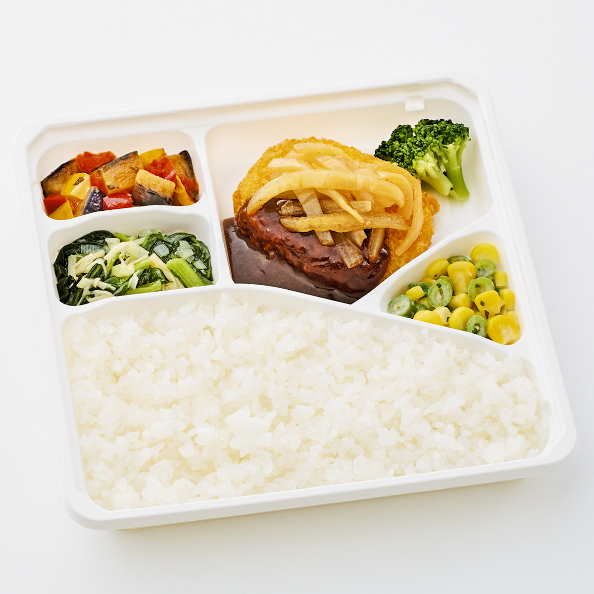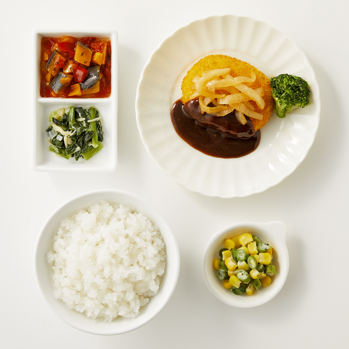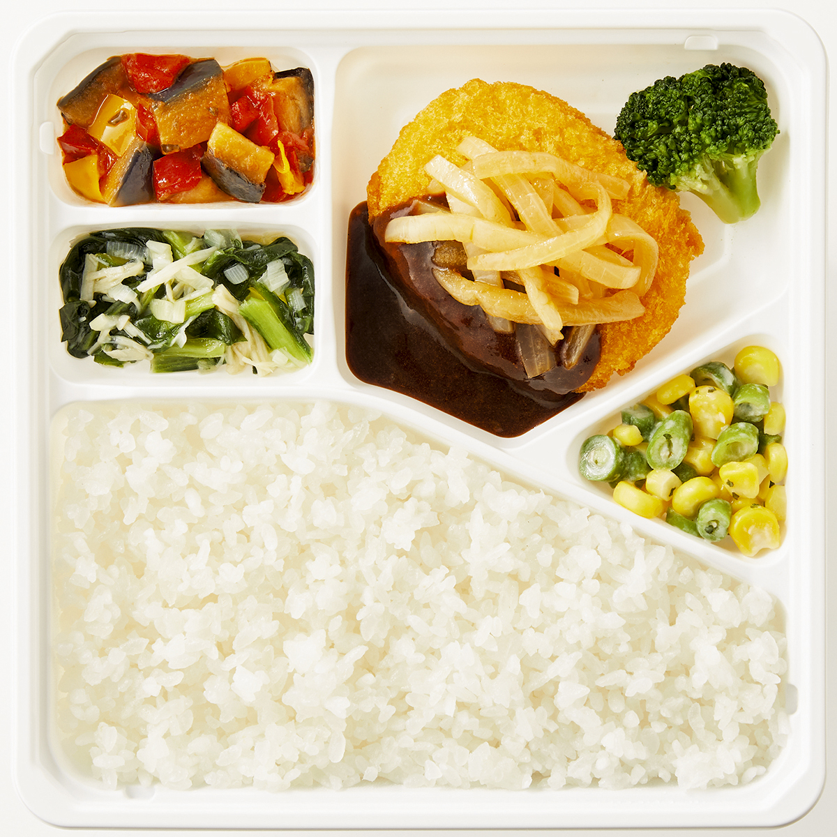 | 原材料名 | 加工米、じゃがいもコロッケ、デミグラスソース、玉ねぎ、植物油、小松菜、揚げなす、ブロッコリー、コーン、いんげん、牛乳、トマト加工品、黄ピーマン、赤ピーマン、えのき茸、ケチャップ、ねぎ、バターソース、コンソメ、ゼラチン、砂糖、食塩、パセリ、バジル/糊料(グァー分解物、加工デンプン、増粘多糖類)、加工デンプン、pH調整剤、着色料(カラメル、カロチノイド、クチナシ)、調味料(アミノ酸等)、乳化剤、香料、酸味料、(一部に小麦・乳成分・牛肉・大豆・鶏肉・豚肉・ゼラチンを含む) | ||