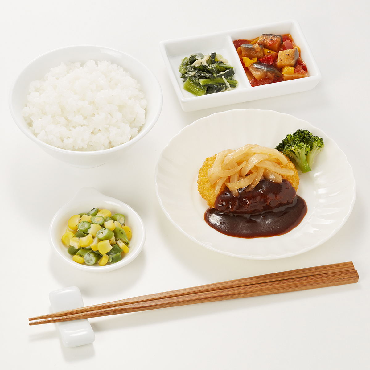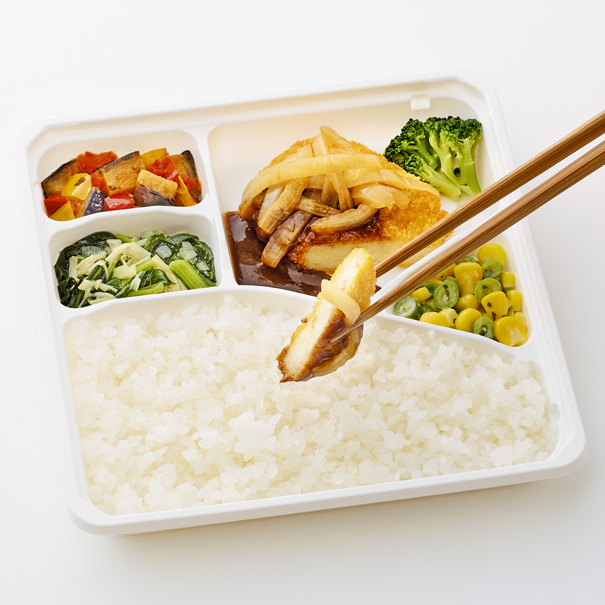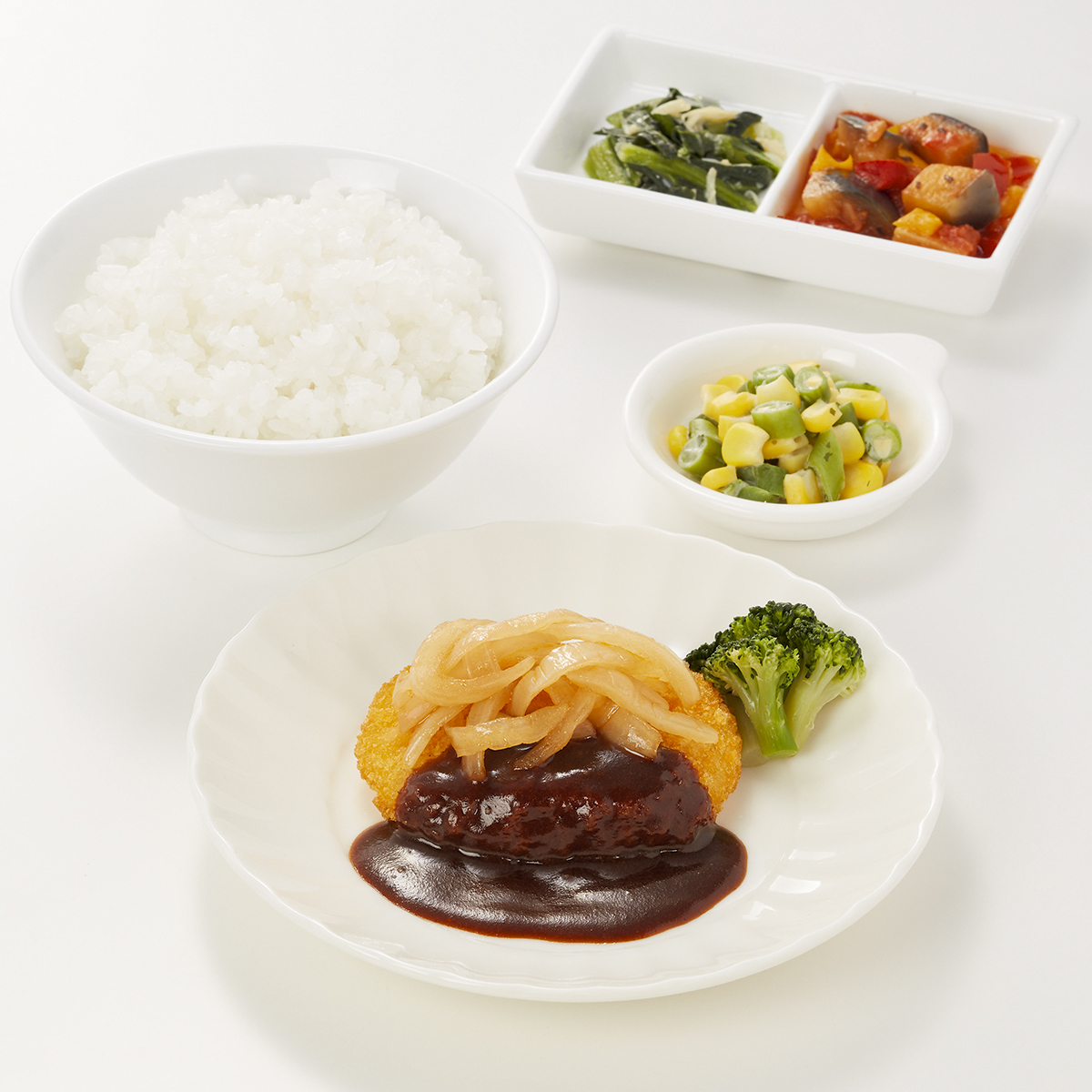 | 原材料名 | 加工米、じゃがいもコロッケ、デミグラスソース、玉ねぎ、植物油、小松菜、揚げなす、ブロッコリー、コーン、いんげん、牛乳、トマト加工品、黄ピーマン、赤ピーマン、えのき茸、ケチャップ、ねぎ、バターソース、コンソメ、ゼラチン、砂糖、食塩、パセリ、バジル/糊料(グァー分解物、加工デンプン、増粘多糖類)、加工デンプン、pH調整剤、着色料(カラメル、カロチノイド、クチナシ)、調味料(アミノ酸等)、乳化剤、香料、酸味料、(一部に小麦・乳成分・牛肉・大豆・鶏肉・豚肉・ゼラチンを含む) | ||