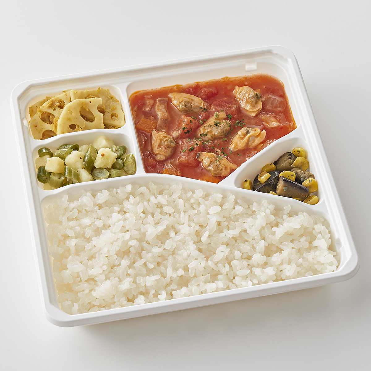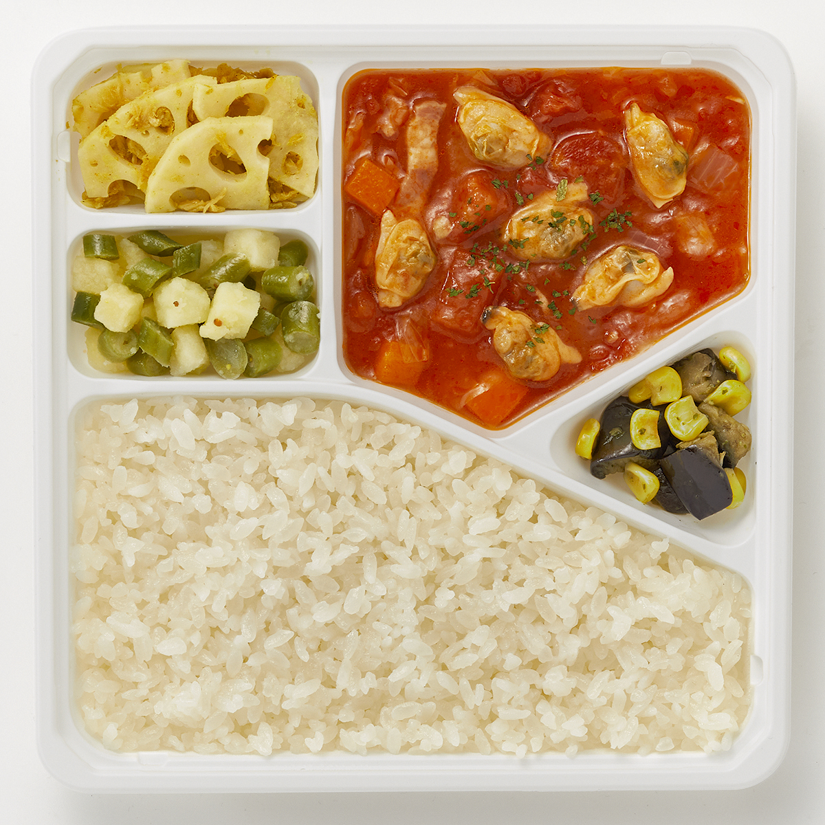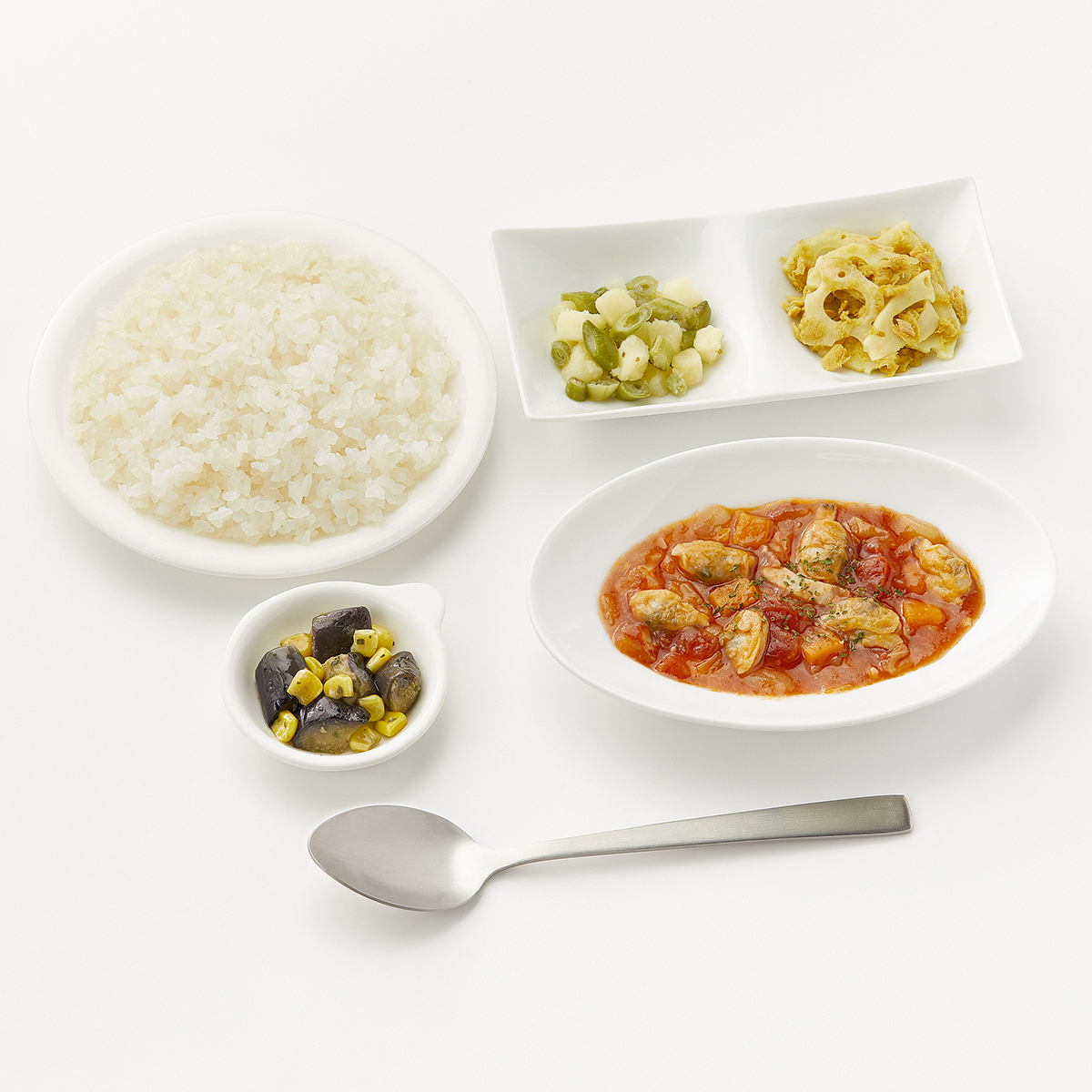 | 原材料名 | 加工米、トマト加工品、れんこん水煮、じゃがいも、揚げなす、植物油、ゆであさり、いんげん、玉ねぎ、キャベツ、ツナフレーク、ベーコン、人参、コーン、コンソメ、バジルペースト、ハニーマスタードソース、あさり風味調味調、バターソース、トマトソース、刻みにんにく、カレー粉、食塩、パセリ/糊料(グァー分解物、加工デンプン、増粘多糖類)、加工デンプン、調味料(アミノ酸等)、pH調整剤、リン酸塩(Na)、酸化防止剤(V.C)、着色料(カラメル、ウコン、コチニール、クチナシ)、ソルビット、酸味料、発色剤(亜硝酸Na)、香料、乳化剤、香辛料抽出物、アンモニウムミョウバン、漂白剤(次亜硫酸Na)、ミョウバン、(一部に小麦・卵・乳成分・牛肉・大豆・鶏肉・豚肉・りんごを含む) | ||